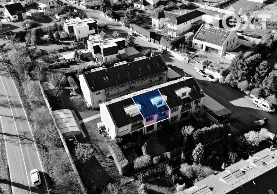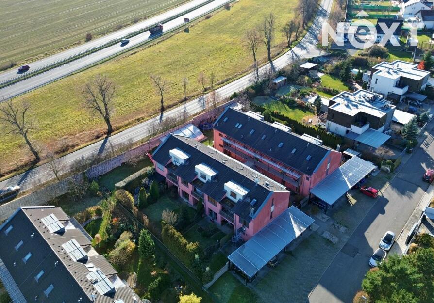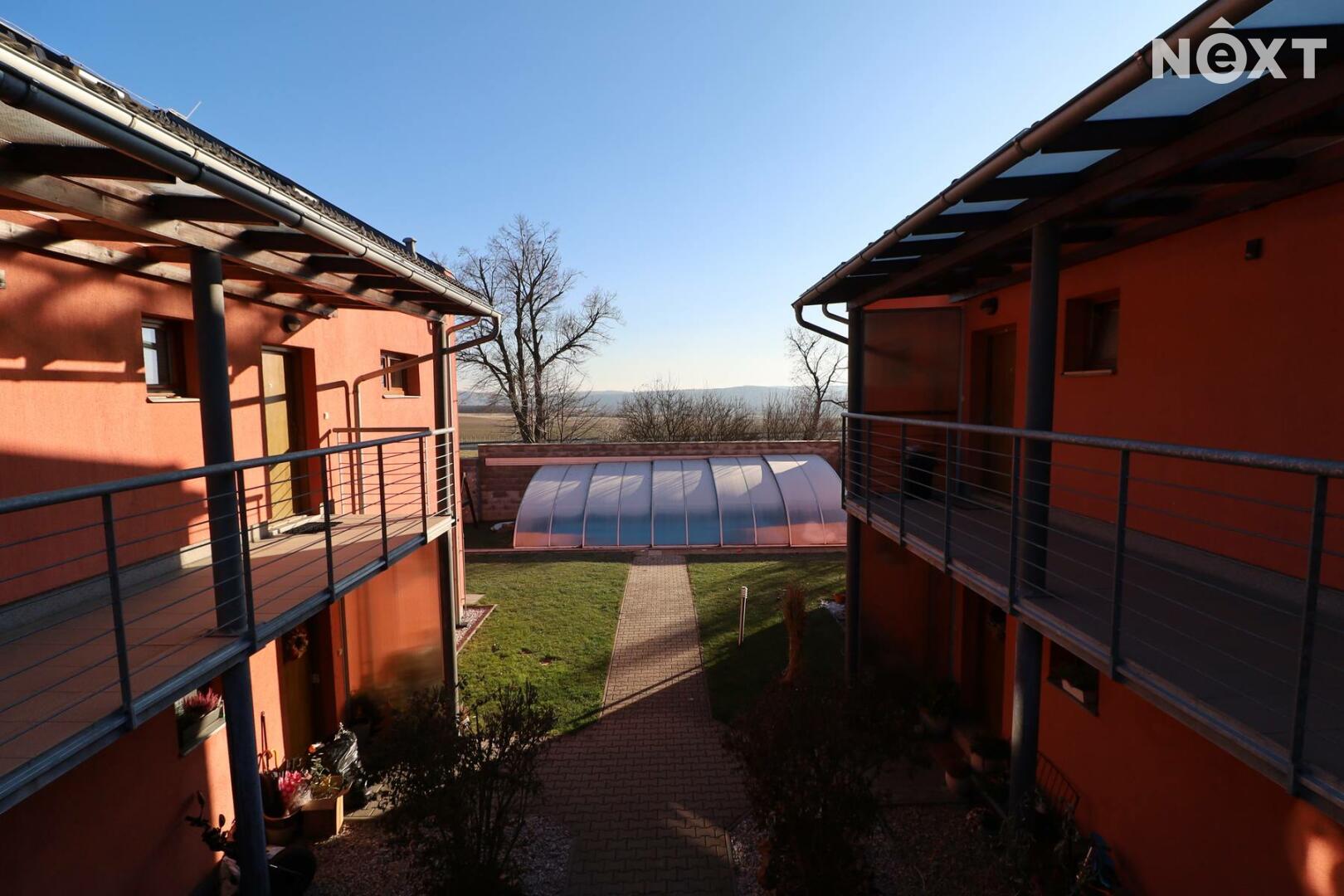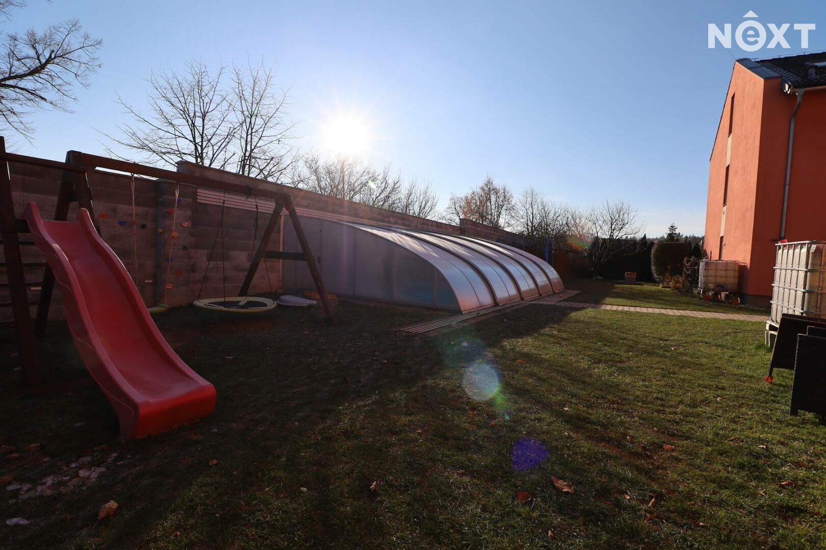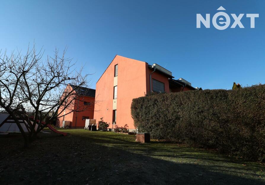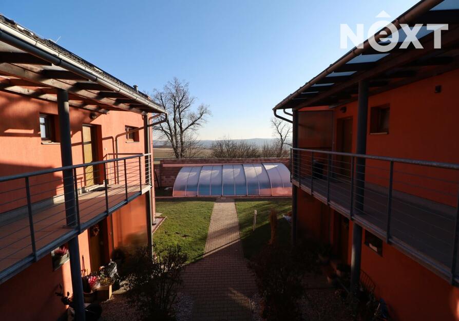Byt je součástí dvou domků, které vytvářejí útulný dvorek. Cestička lemovaná okrasnými keři vás zavede k blankytnému bazénu. Vedle něj najdete houpačky, klouzačku, pískoviště, trampolínu i pergolu se zahradním posezením, grilem a lednicí – ideální místo pro sousedská setkání. Vytápění bytu díky společnému plynovému kotli pro daný objekt.