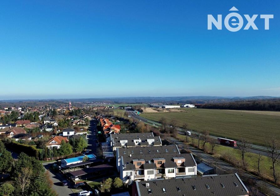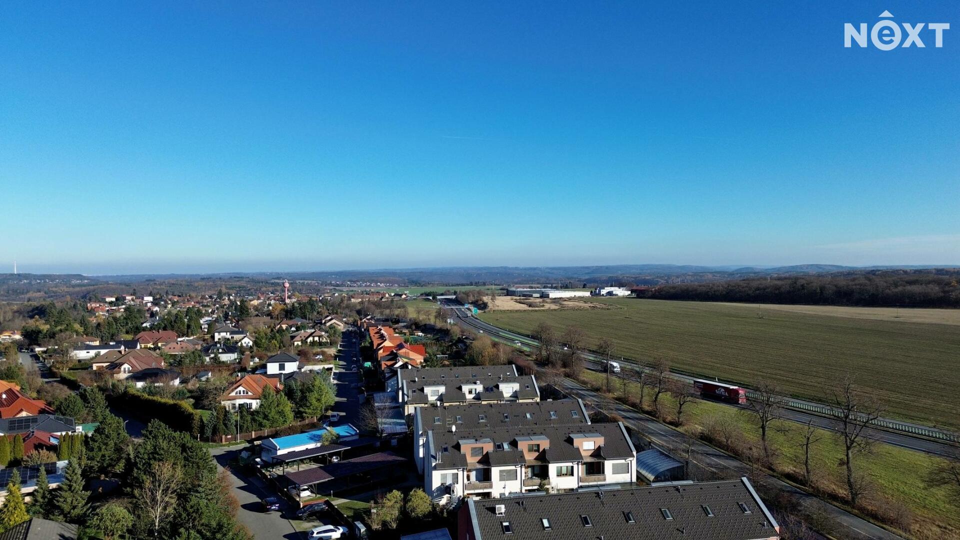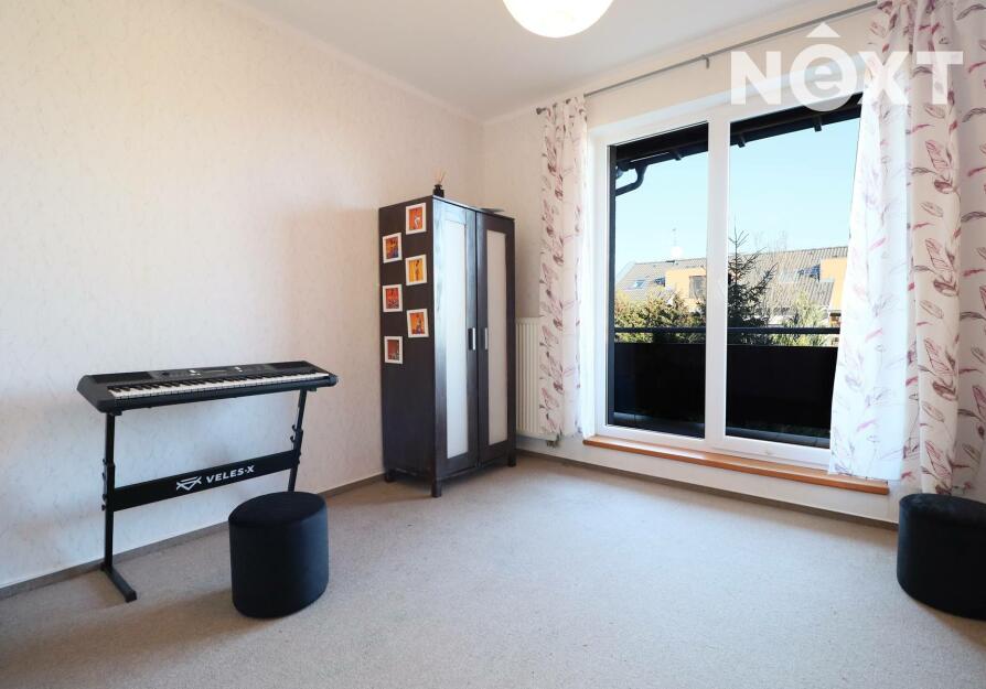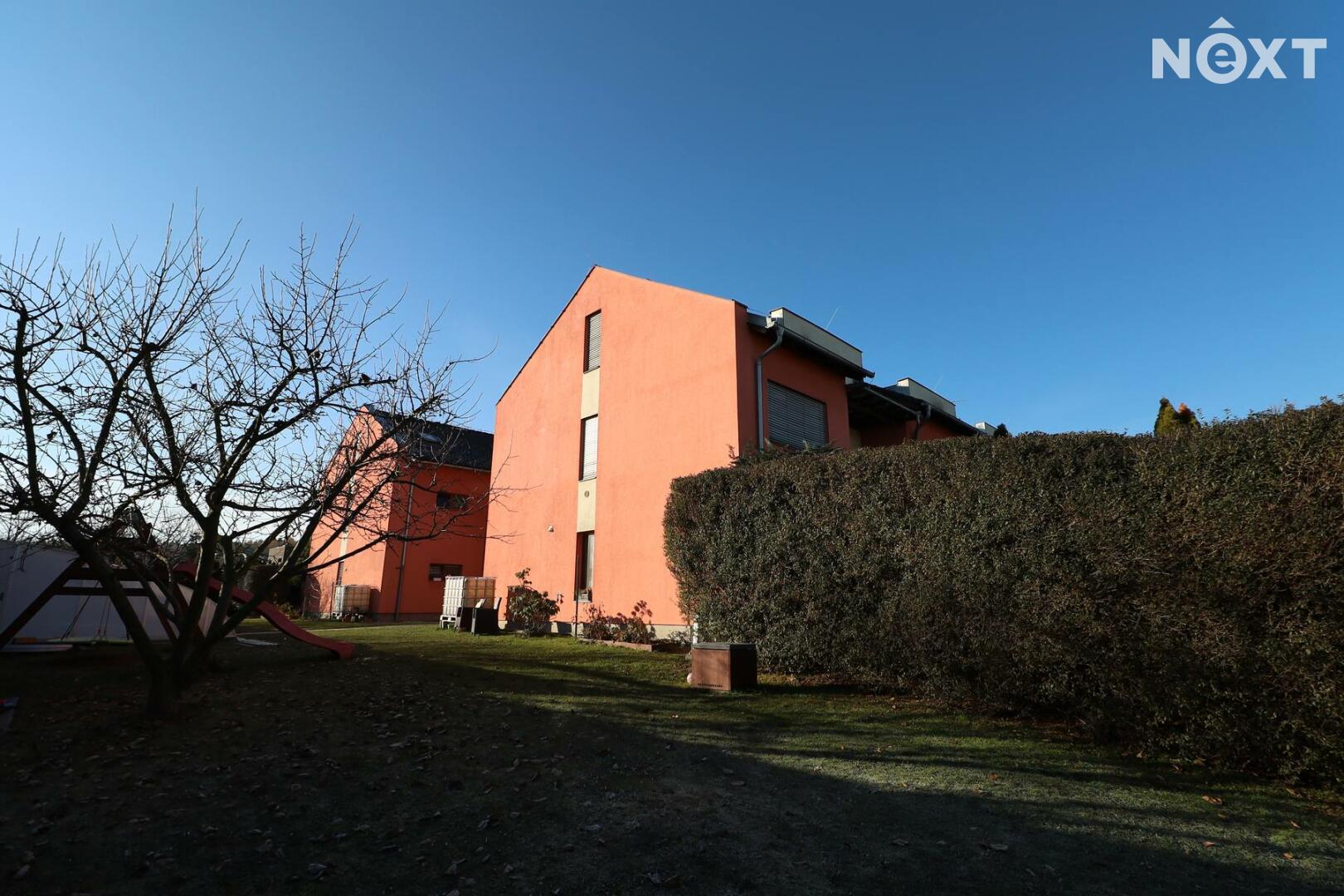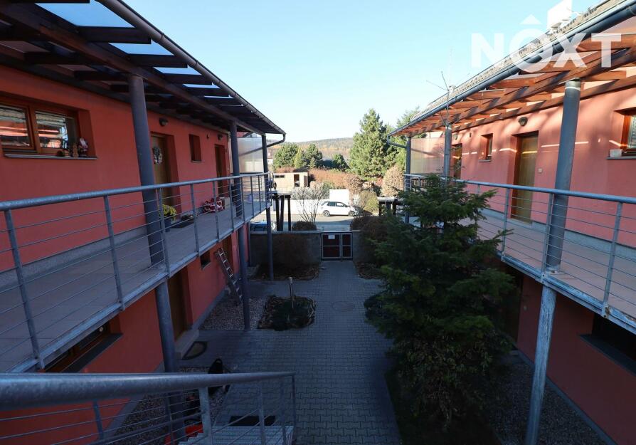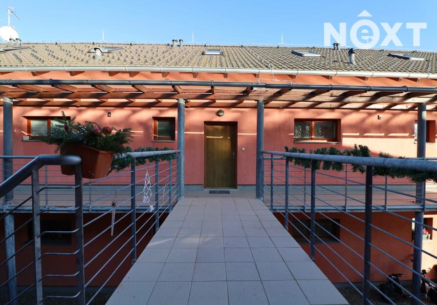 Byt je součástí dvou domků, které vytvářejí útulný dvorek. Cestička lemovaná okrasnými keři vás zavede k blankytnému bazénu. Vedle něj najdete houpačky, klouzačku, pískoviště, trampolínu i pergolu se zahradním posezením, grilem a lednicí – ideální místo pro sousedská setkání. Vytápění bytu díky společnému plynovému kotli pro daný objekt.