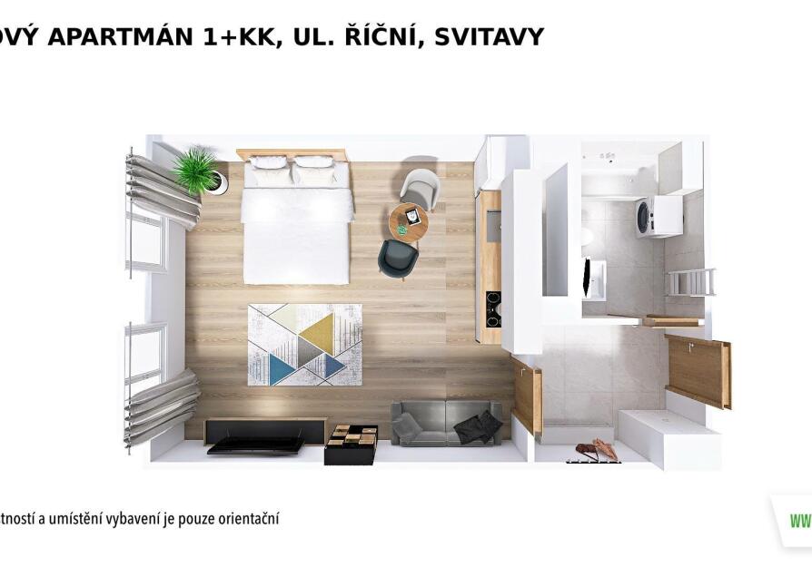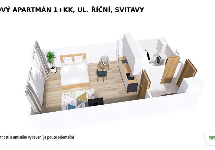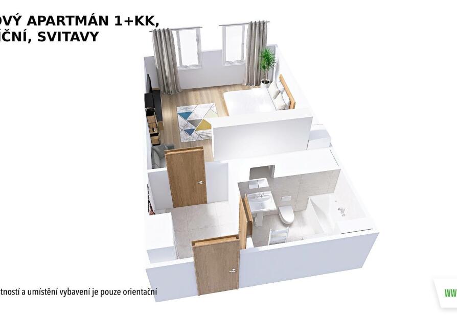 Byt o dispozici 1+kk je v osobním vlastnictví a nachází se v 2.NP cihlové novostavby. Má celkovou výměru 36 m2 a představuje jej hlavní obytná místnost, která umožňuje pohodlné propojení obývacího prostoru se spací zónou a kuchyňským koutem. Z chodby je vstup do koupelny s vanou. Díky orientaci na jihovýchod je byt příjemně prosvětlený po celý den a působí vzdušným dojmem.