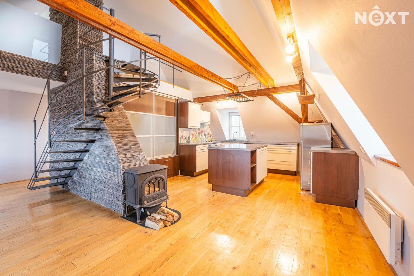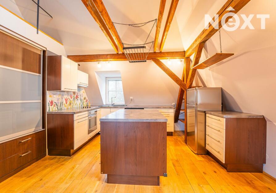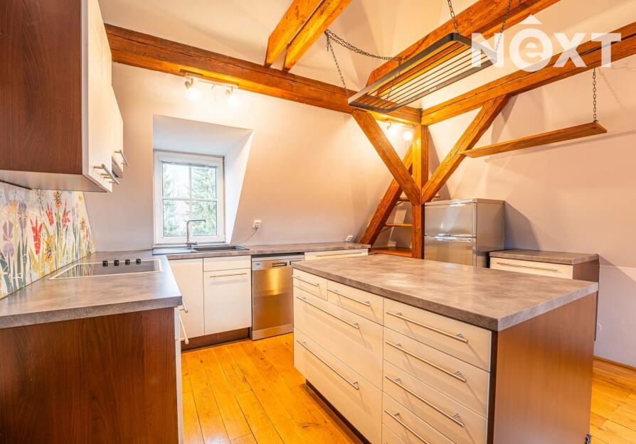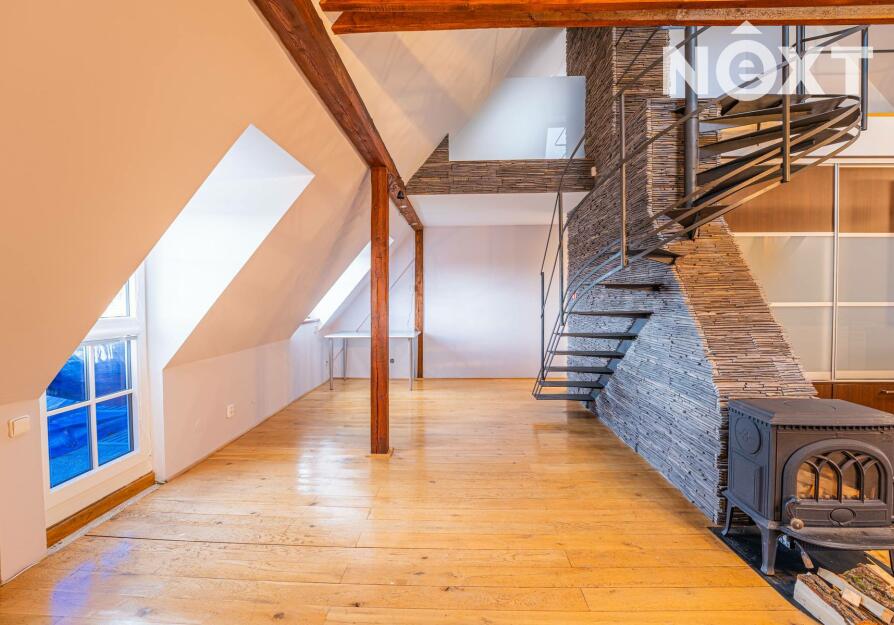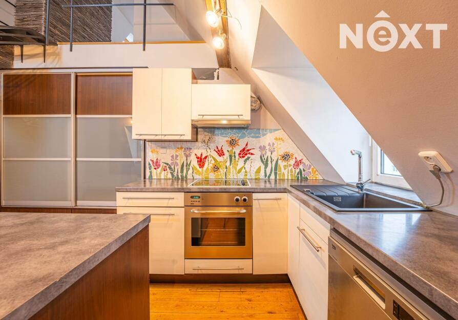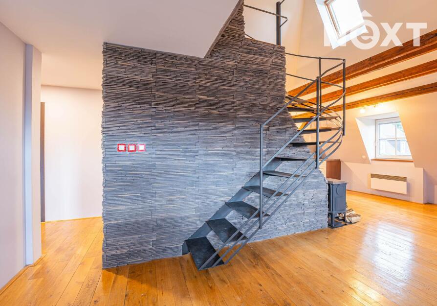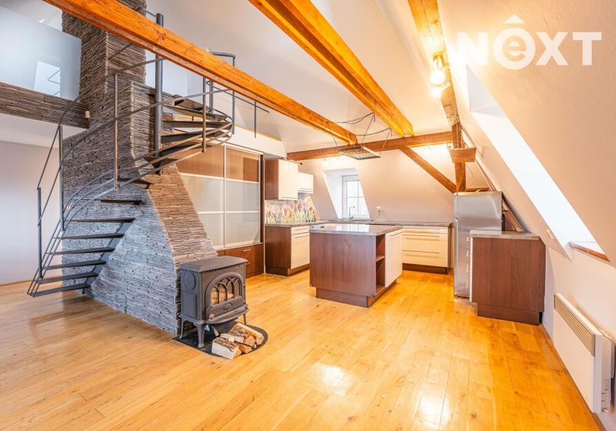 Byt s podlahovou plochou 83 m2 se nachází v 3.NP (nejvyšším patře) cihlového domu v klidné lokalitě blízko centra města. Chodba, v níž se nachází vestavěná skříň se zrcadlem, je průchozí do všech místností. V koupelně najdete sprchový kout i vanu, umyvadlovou skříňku se zrcadlem a prostor na pračku. WC je zvlášť. Část obývacího pokoje tvoří na míru vyrobená kuchyňská linka s vestavěnými spotřebiči jako je varná deska, elektrická trouba a myčka. Z něj vystoupáte do patýrka nebo vyjdete na balkon.