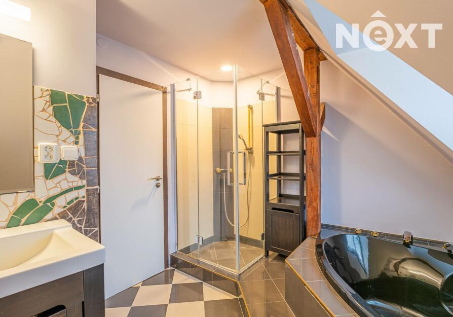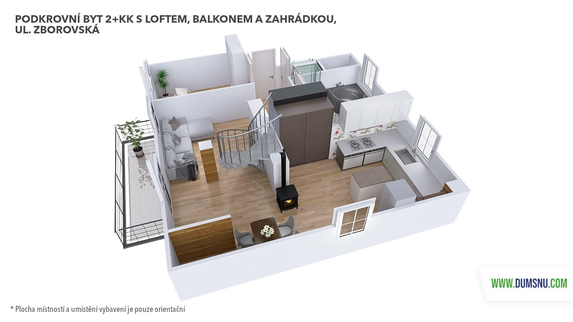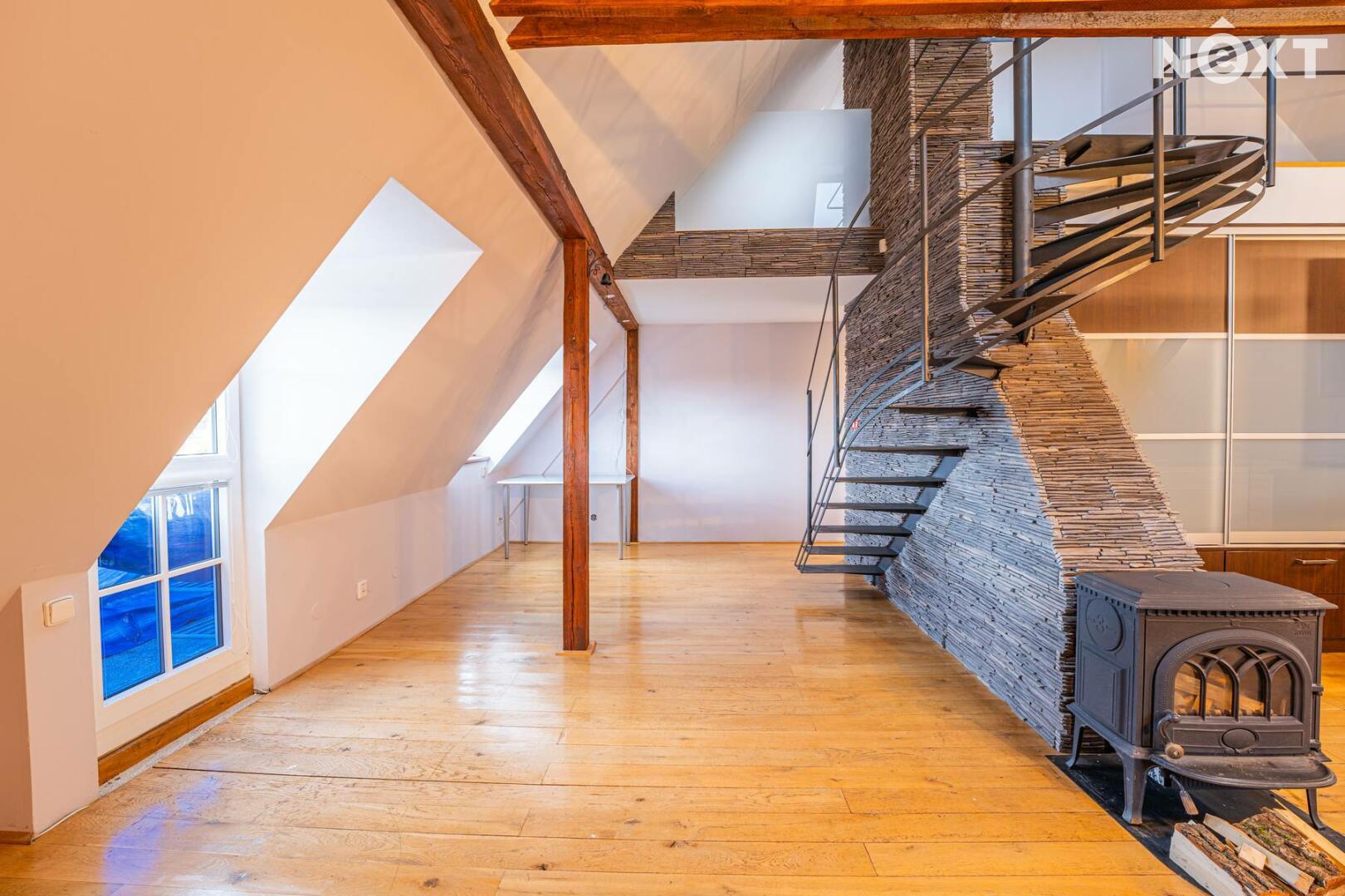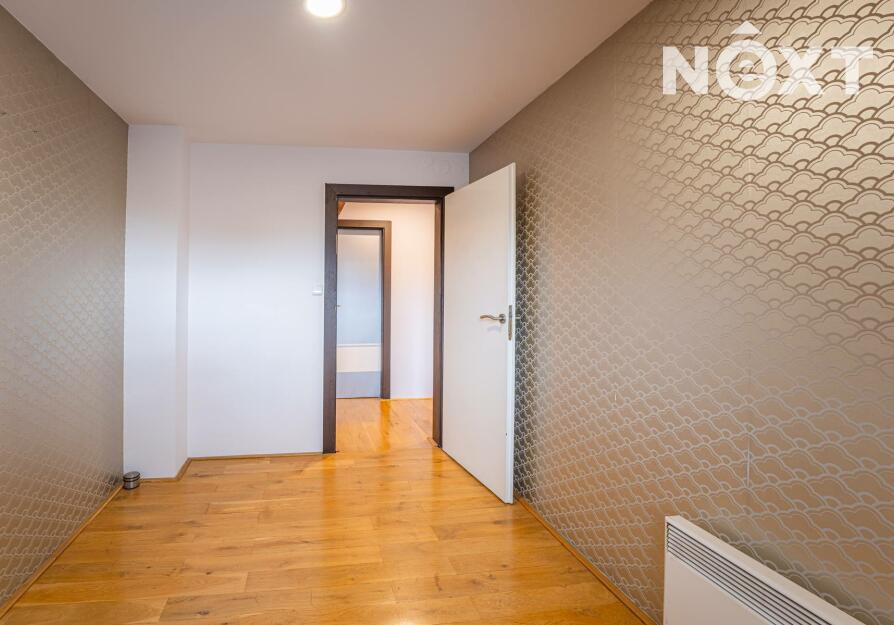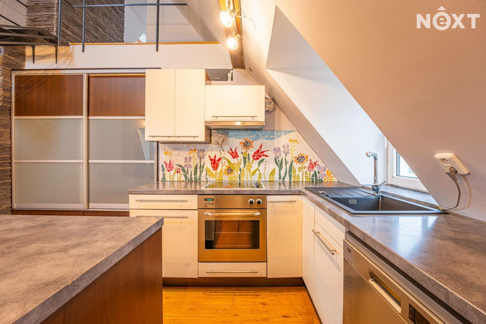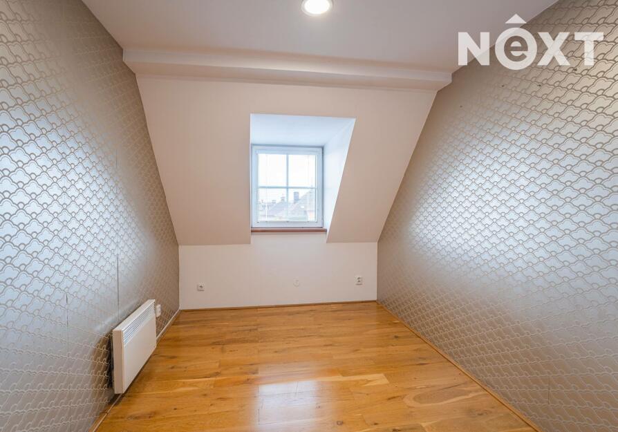 Byt s podlahovou plochou 83 m2 se nachází v 3.NP (nejvyšším patře) cihlového domu v klidné lokalitě blízko centra města. Chodba, v níž se nachází vestavěná skříň se zrcadlem, je průchozí do všech místností. V koupelně najdete sprchový kout i vanu, umyvadlovou skříňku se zrcadlem a prostor na pračku. WC je zvlášť. Část obývacího pokoje tvoří na míru vyrobená kuchyňská linka s vestavěnými spotřebiči jako je varná deska, elektrická trouba a myčka. Z něj vystoupáte do patýrka nebo vyjdete na balkon.