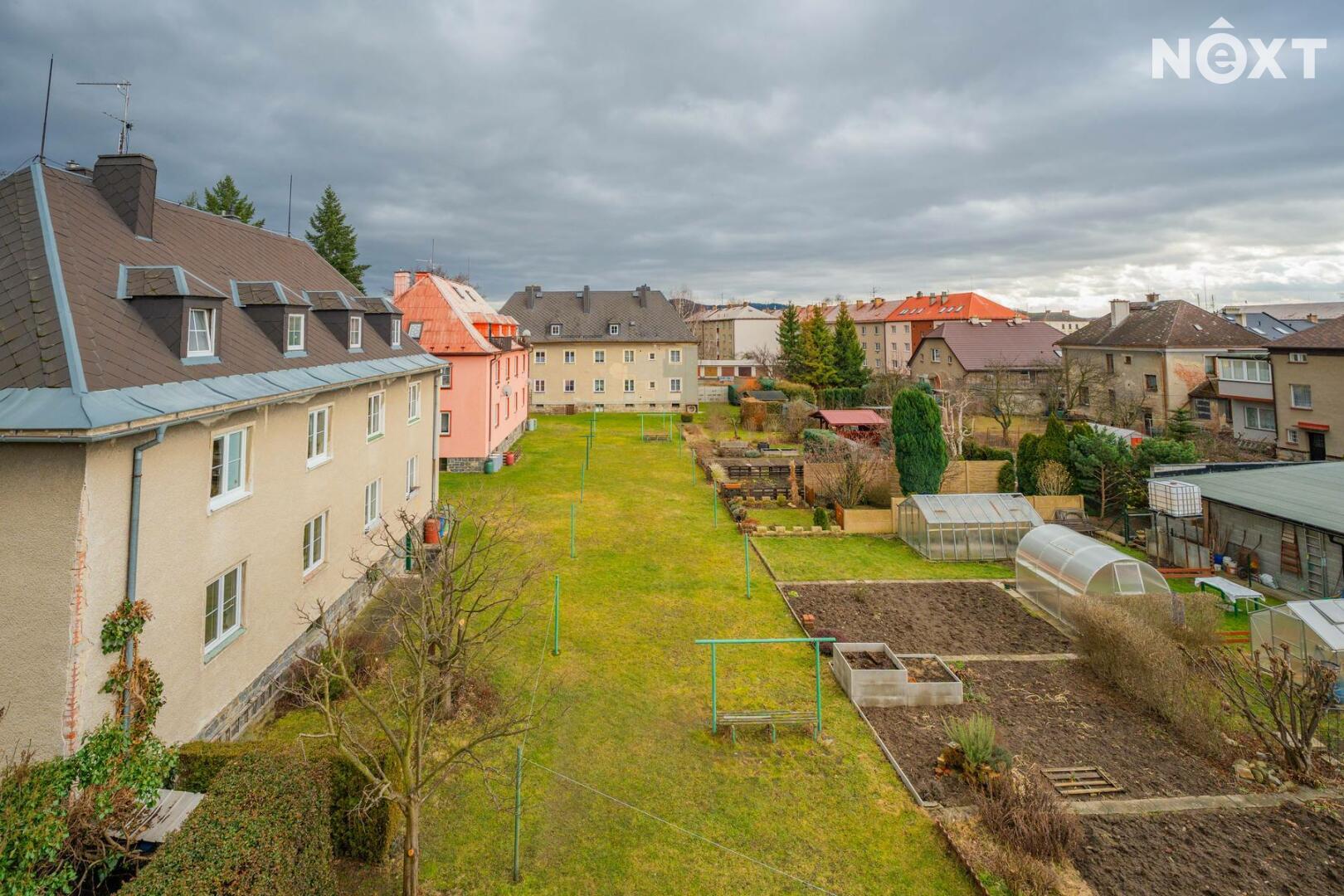 Příslušenství bytu tvoří zahrádka za domem o velikosti 77 m2, prostor u domu na uskladnění dřeva a sklep.