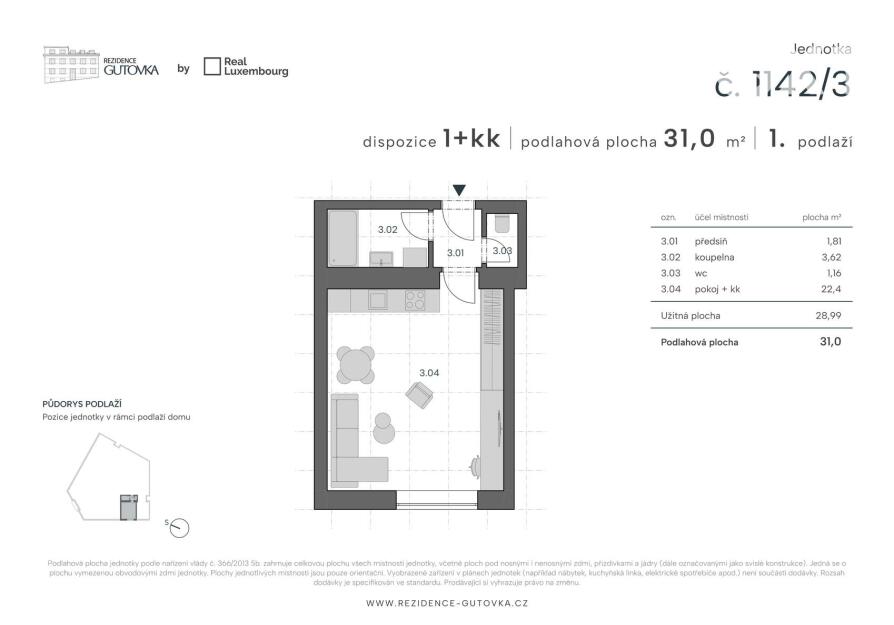 Jednotka se skládá z pokoje s kuchyňským koutem a přípravou na kuchyňskou linku (22,4 m²), kompletně zařízené koupelny se sprchovým koutem a podlahovým vytápěním (3,6 m²), předsíně (1,8 m²) a samostatného WC (1,2 m²).