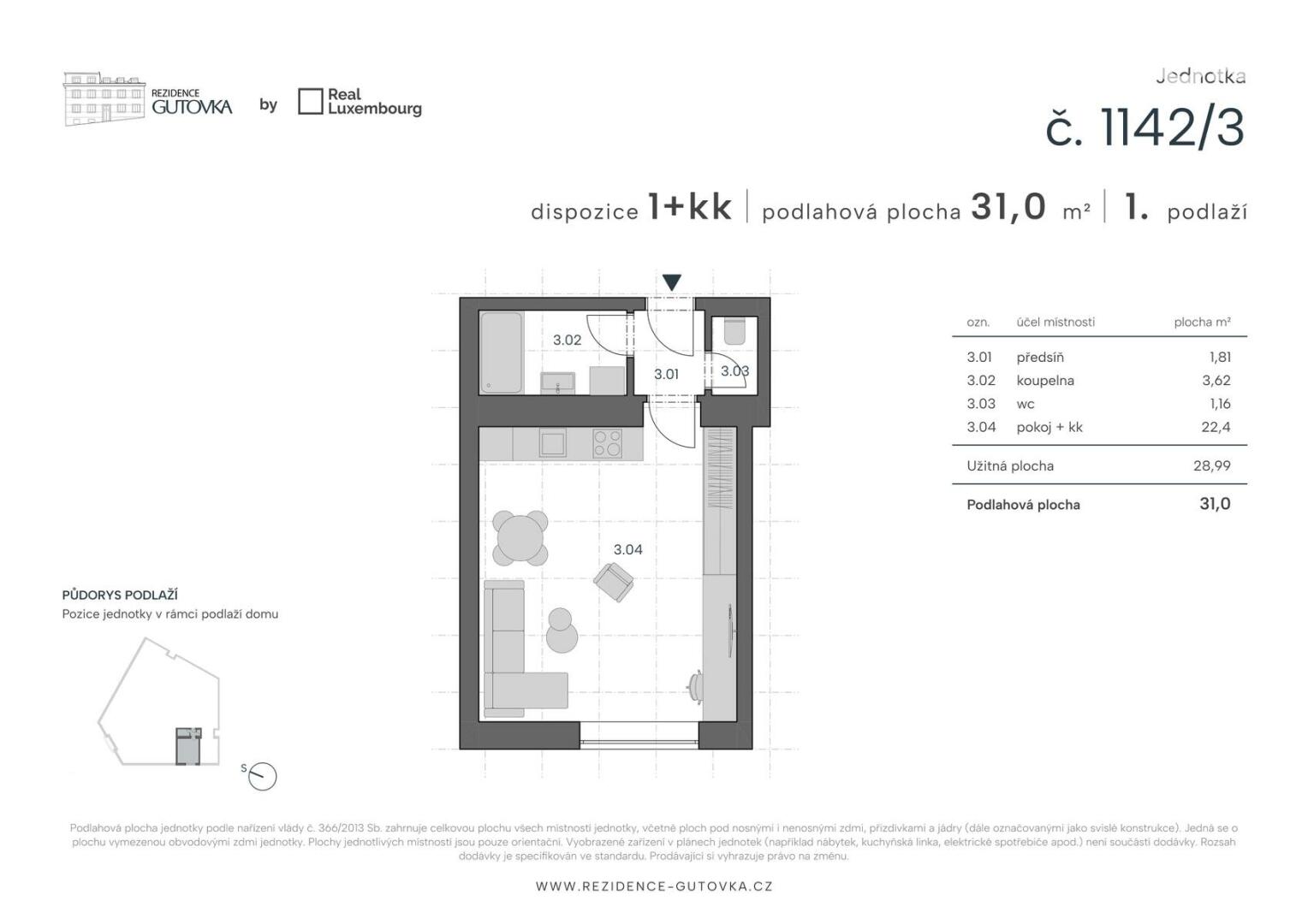 K prodeji nabízíme moderní a nově zrekonstruovanou jednotku s dispozicí 1+KK umístěnou v 1. nadzemním podlaží s celkovou plochou 31 m2.