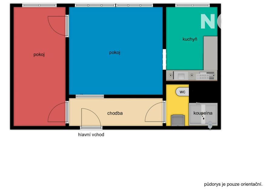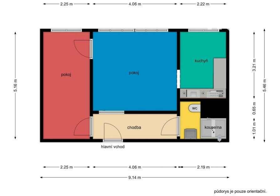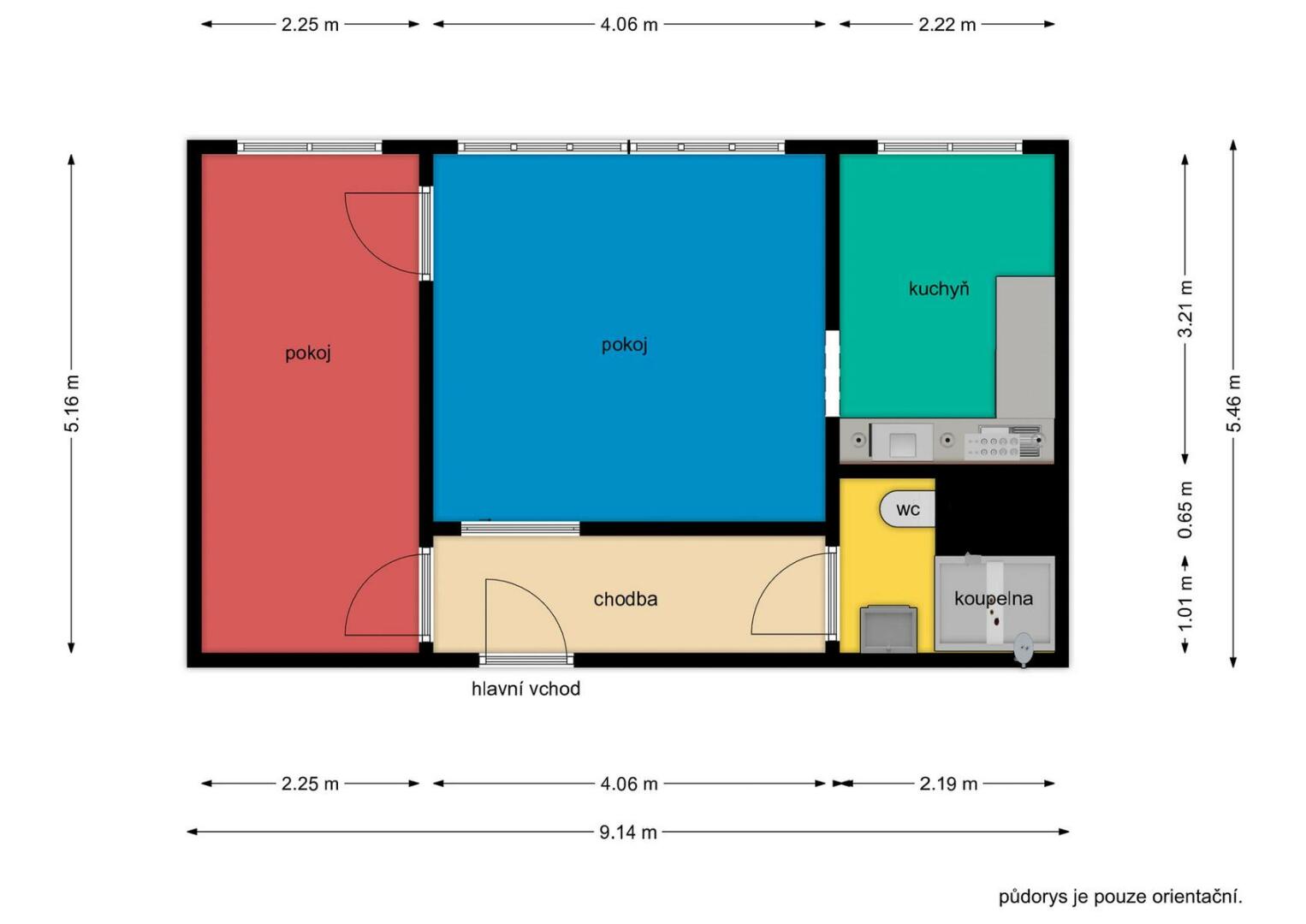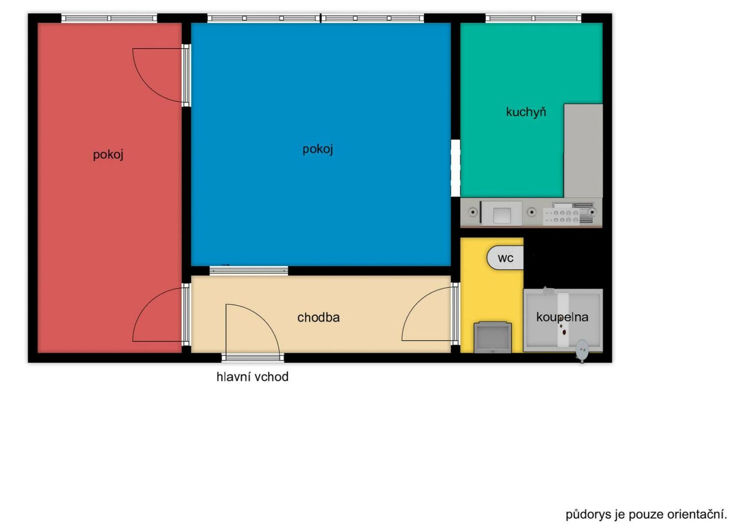 • Dispozice: 2+1 (obývací pokoj, ložnice, samostatná kuchyň + předsíň, koupelna s WC)