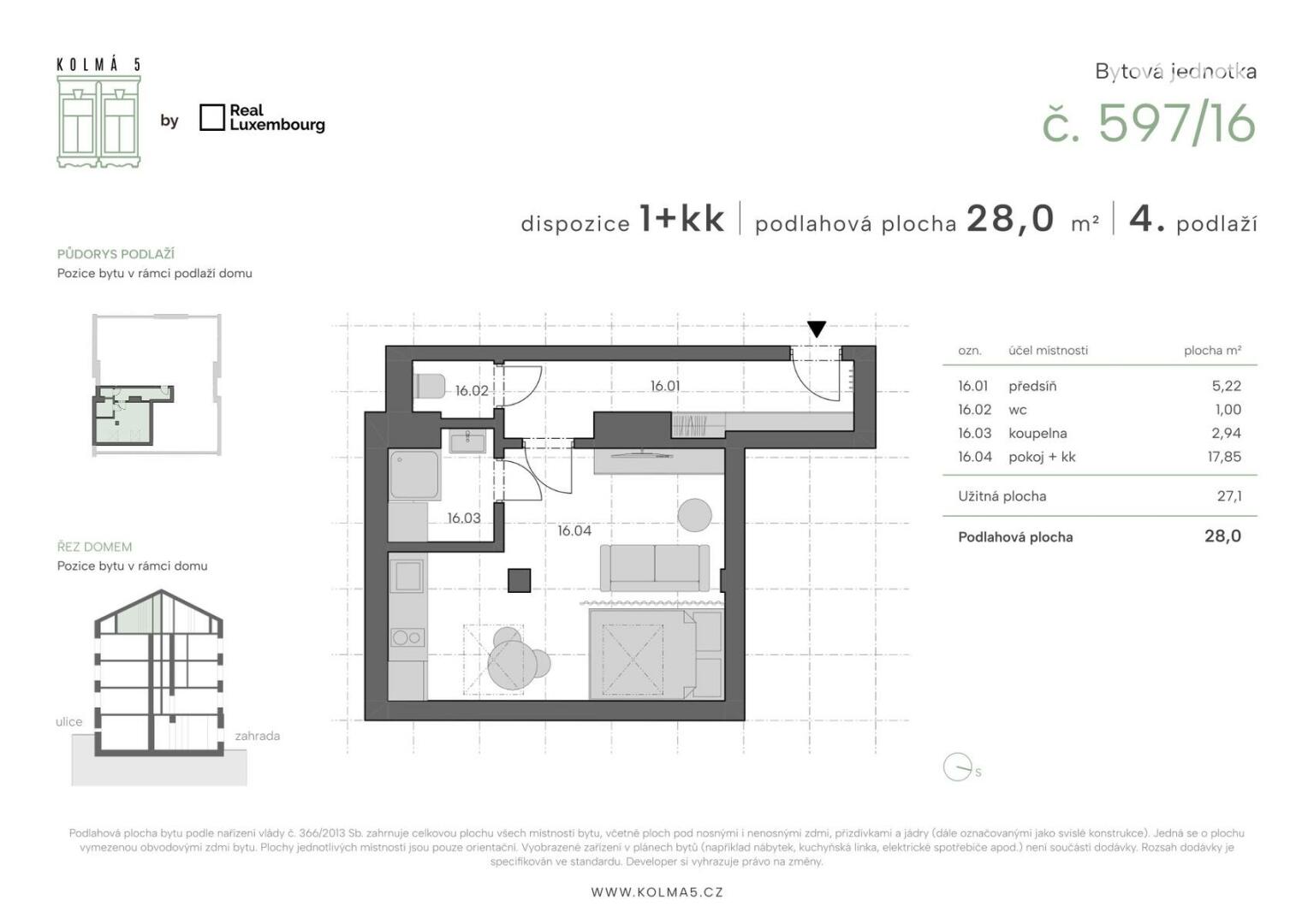Tato konkrétní jednotka č.16 o dispozici 1kk a podlahové ploše 28 m2 se nachází ve 4 nadzemním podlaží s výhledem do ulice. Je členěna na vstupní chodbu ze které je přístup na wc, a dále obývacího pokoje s kuchyňským koutem a vstupem do koupelny. Přesné rozložení místností si můžete prohlédnout na přiloženém půdorysu. Vytápění je řešeno elektrickými přímotopy a ohřev vody elektrickým bojlerem.