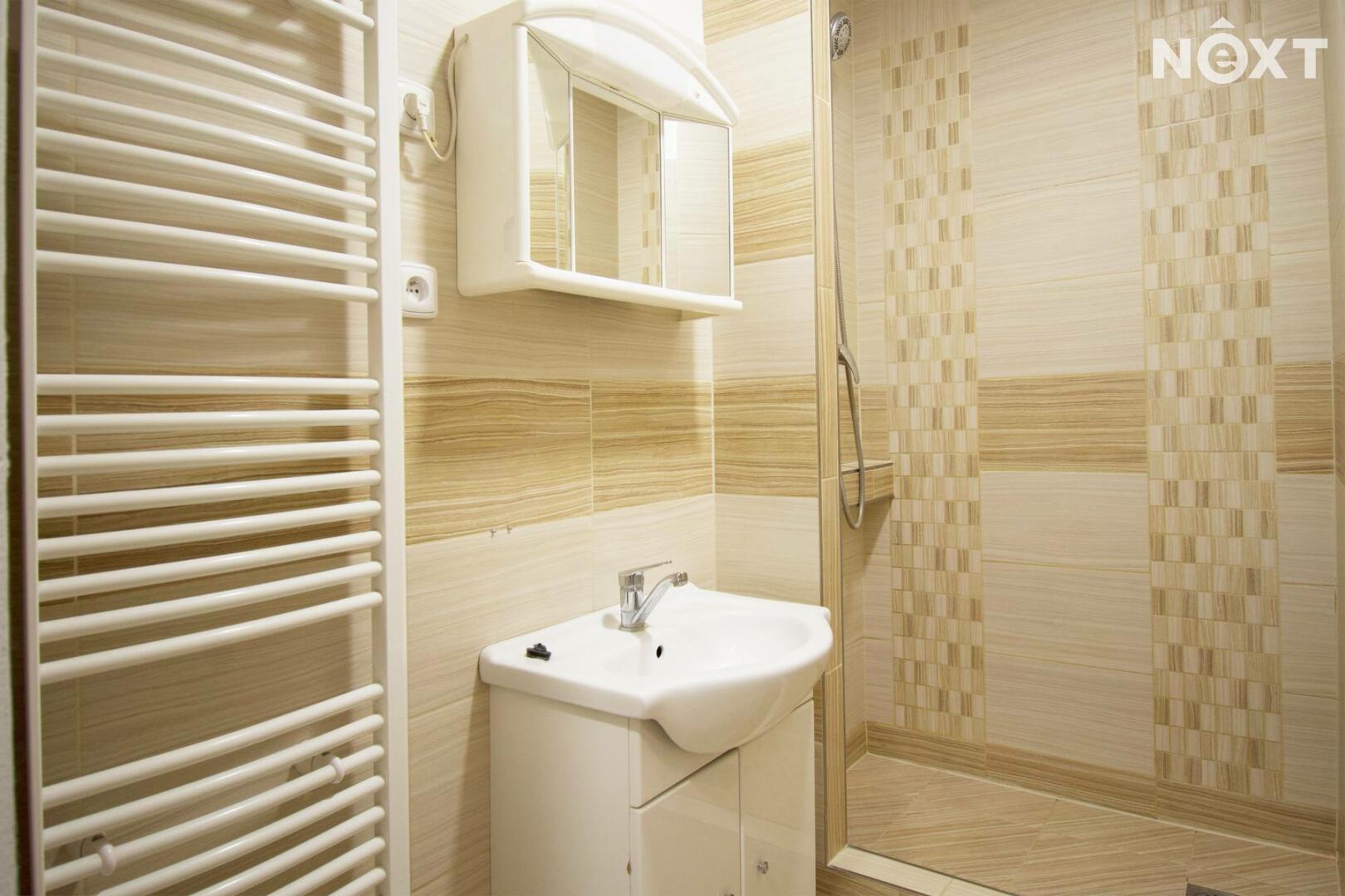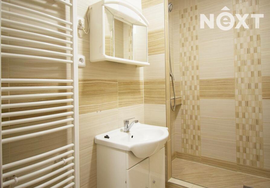 • Koupelna (2,9 m²) se sprchovým koutem, koupelnovým nábytkem a místem pro pračku.