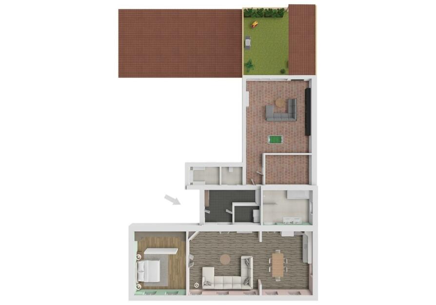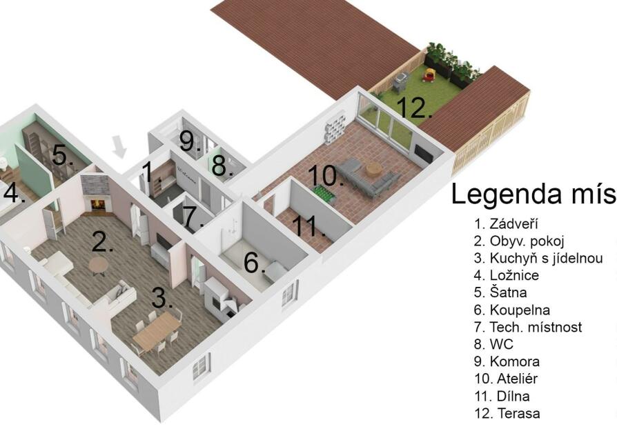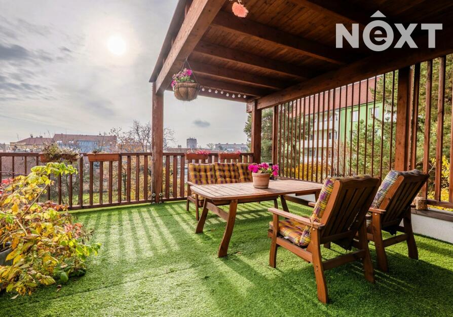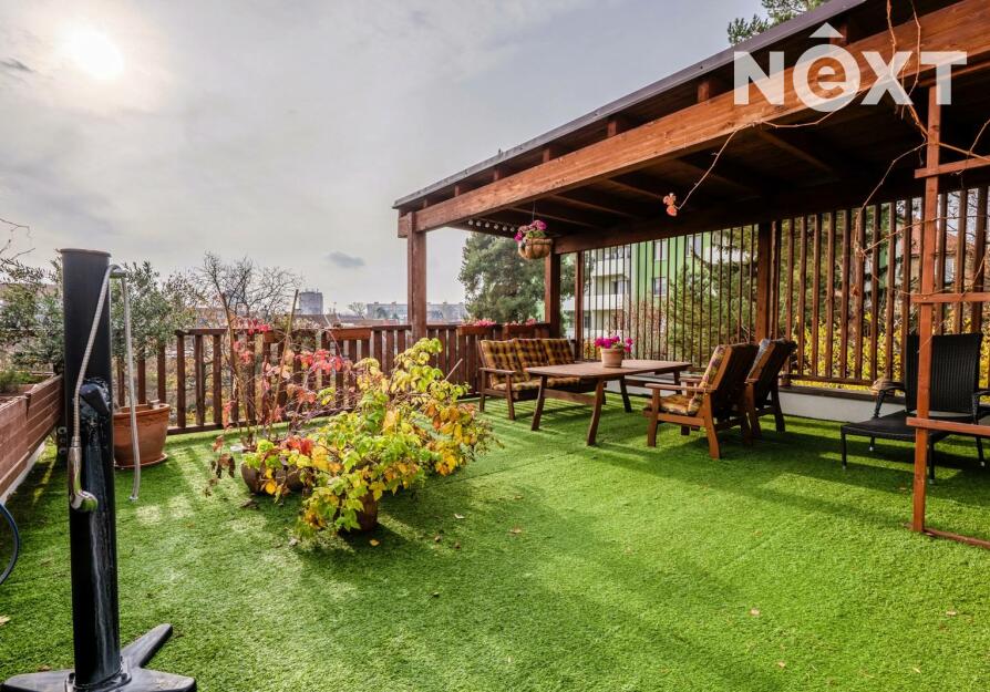 Samotný byt s dispozicí 2+kk spolu na něho navazujícím nebytovým příslušenstvím má parametry spíše rodinného domu. Tomu nasvědčuje to, že kromě rozlehlého bytového prostoru nabízí i zázemí v podobě prostorné venkovní terasy (51,67 m2) s posezením, s truhlíky na zeleninu a s venkovní sprchou, dále je zde ateliér (49,9 m2) s pracovním koutem a menší dílna pro kutili (13,2 m2).