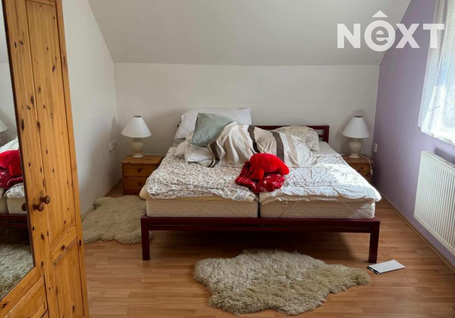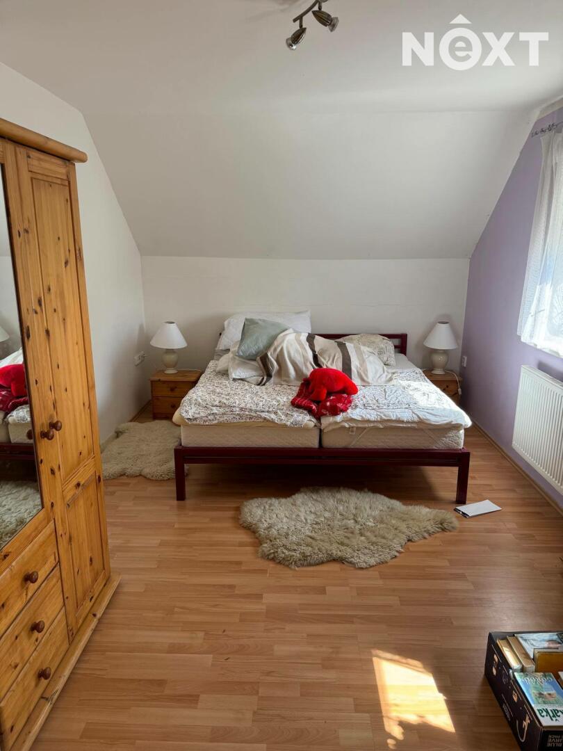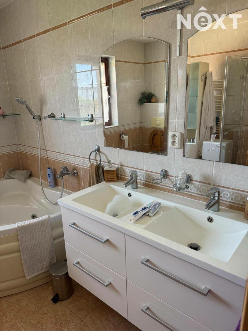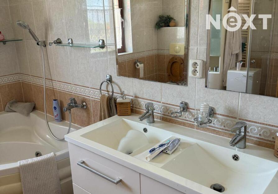 V horním patře jsou tři ložnice a velkorysá koupelna s vanou, sprchovým koutem, toaletou, dvojumyvadlo.