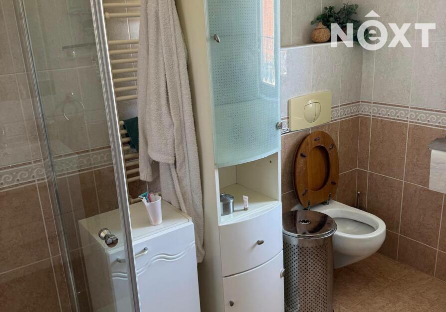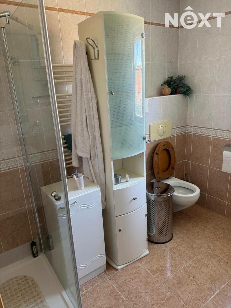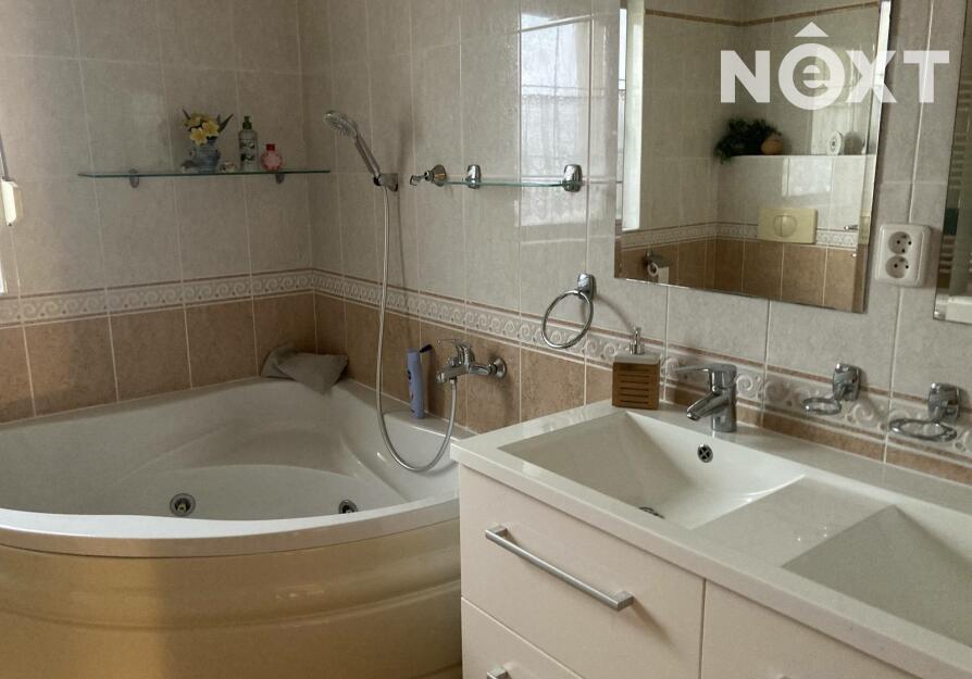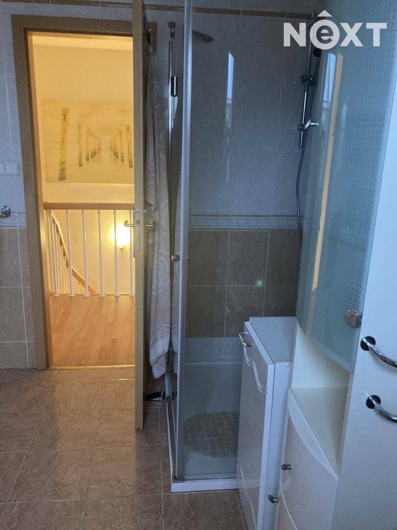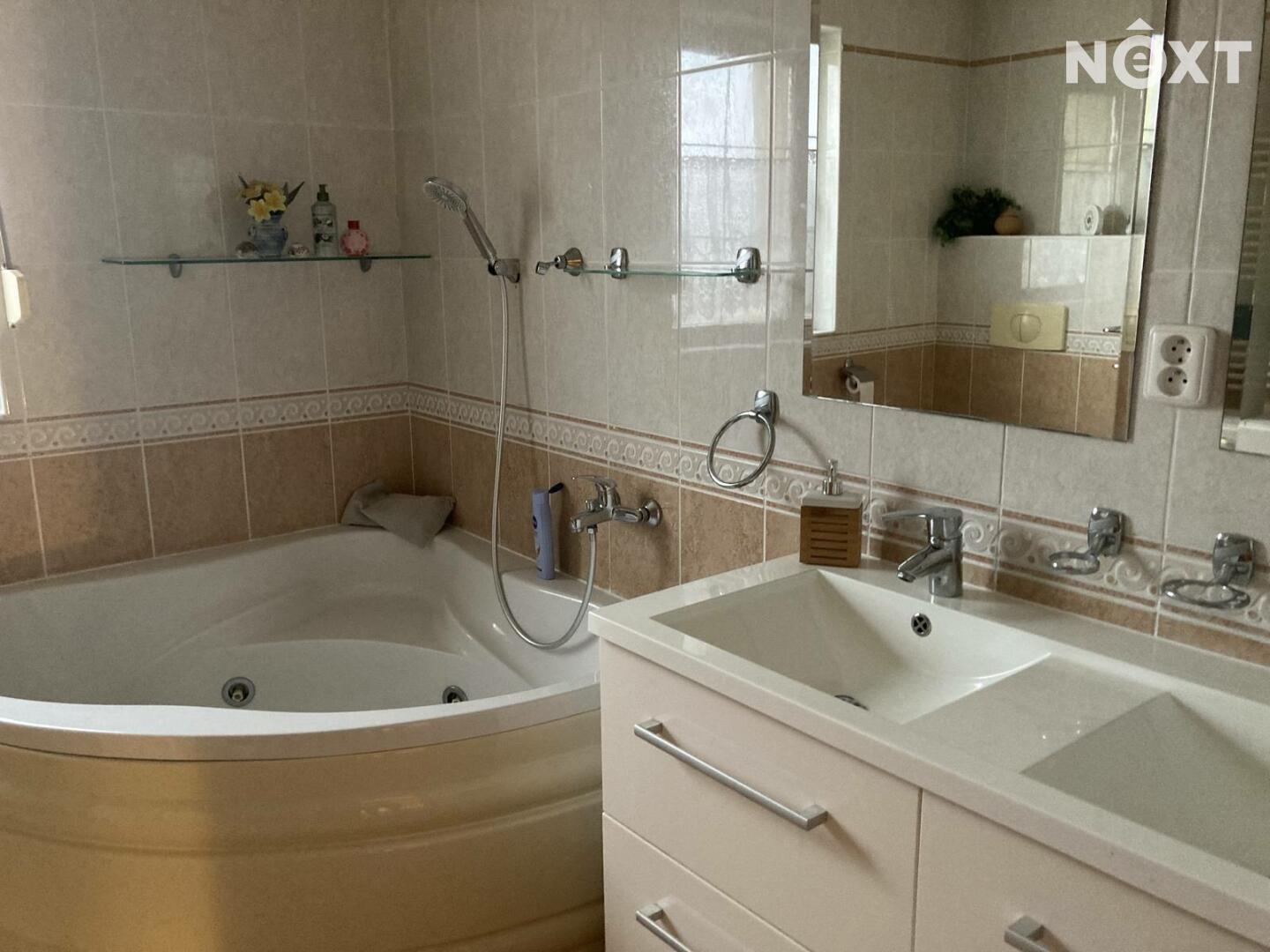 V horním patře jsou tři ložnice a velkorysá koupelna s vanou, sprchovým koutem, toaletou, dvojumyvadlo.