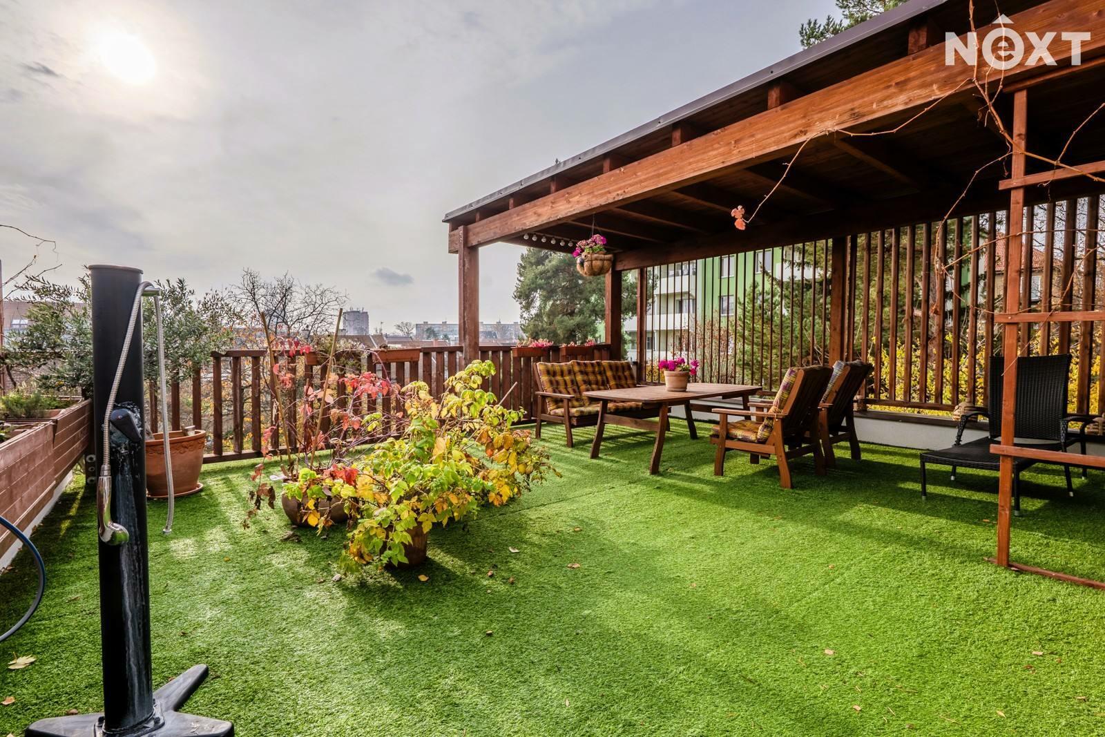Samotný byt s dispozicí 3+kk spolu na něho navazujícím nebytovým příslušenstvím má parametry spíše rodinného domu. Tomu nasvědčuje to, že kromě rozlehlého bytového prostoru nabízí i zázemí v podobě prostorné venkovní terasy (51,67 m2) s posezením, s truhlíky na zeleninu a s venkovní sprchou, dále je zde ateliér (49,9 m2) s pracovním koutem a menší dílna pro kutily (13,2 m2).