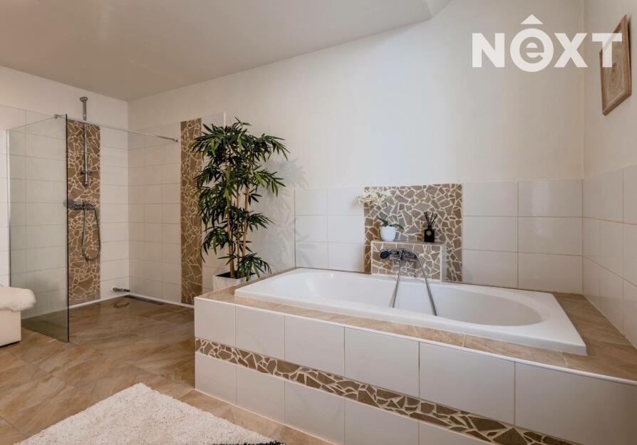 Ložnice (24,6 m2) nezůstává pozadu, co se týká místa a najdeme v ní důmyslně řešenou šatnu (10,2 m2). Koupelna (16,4 m2) je vybavena vanou, sprchovým koutem a dvěma umyvadly.
