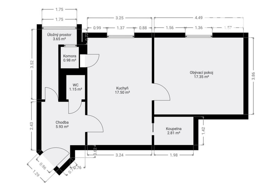 Dispozice dle prezentace (lodžie pojmenovaná v dispozici úložný prostor). Orientace bytu na východ s výhledem na protější park Jezerka.