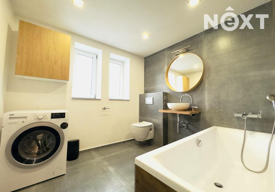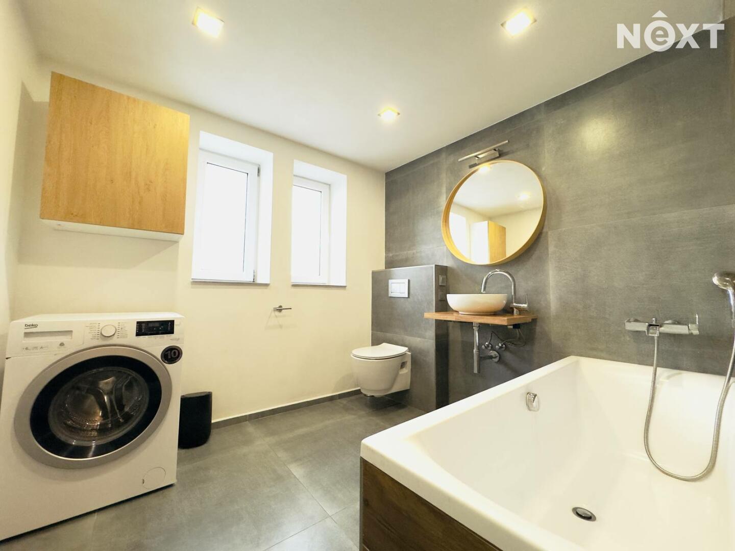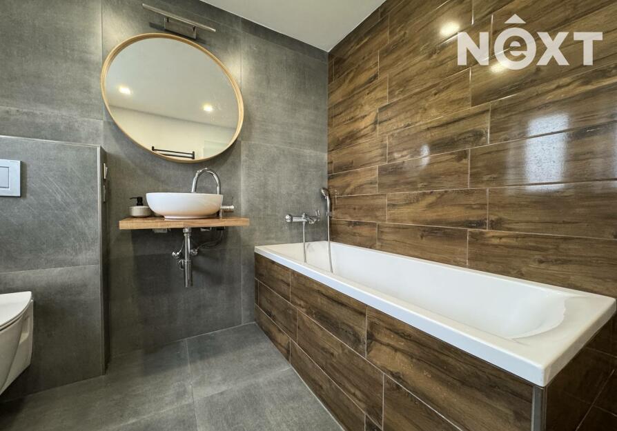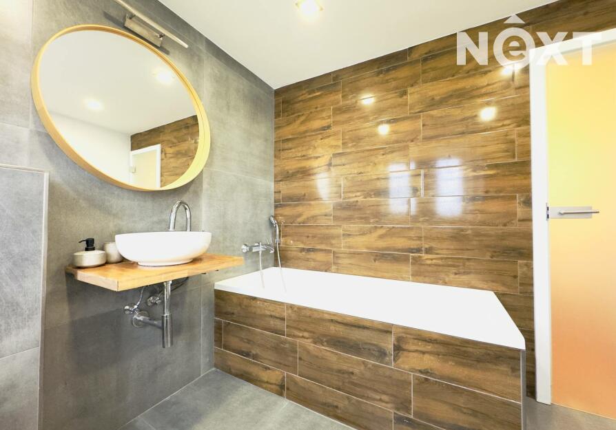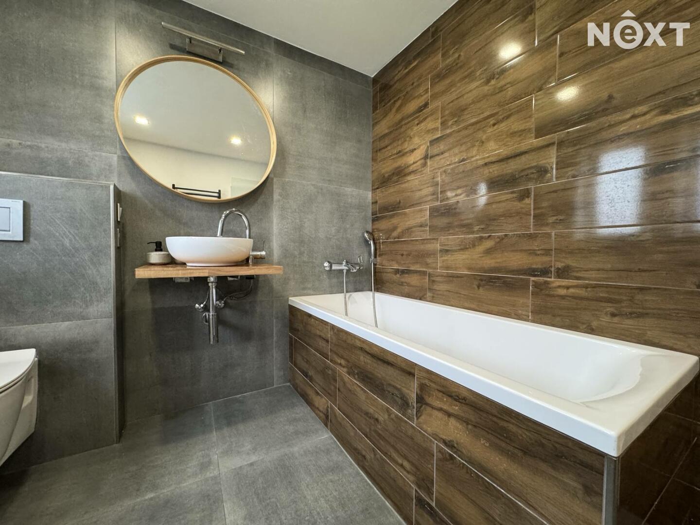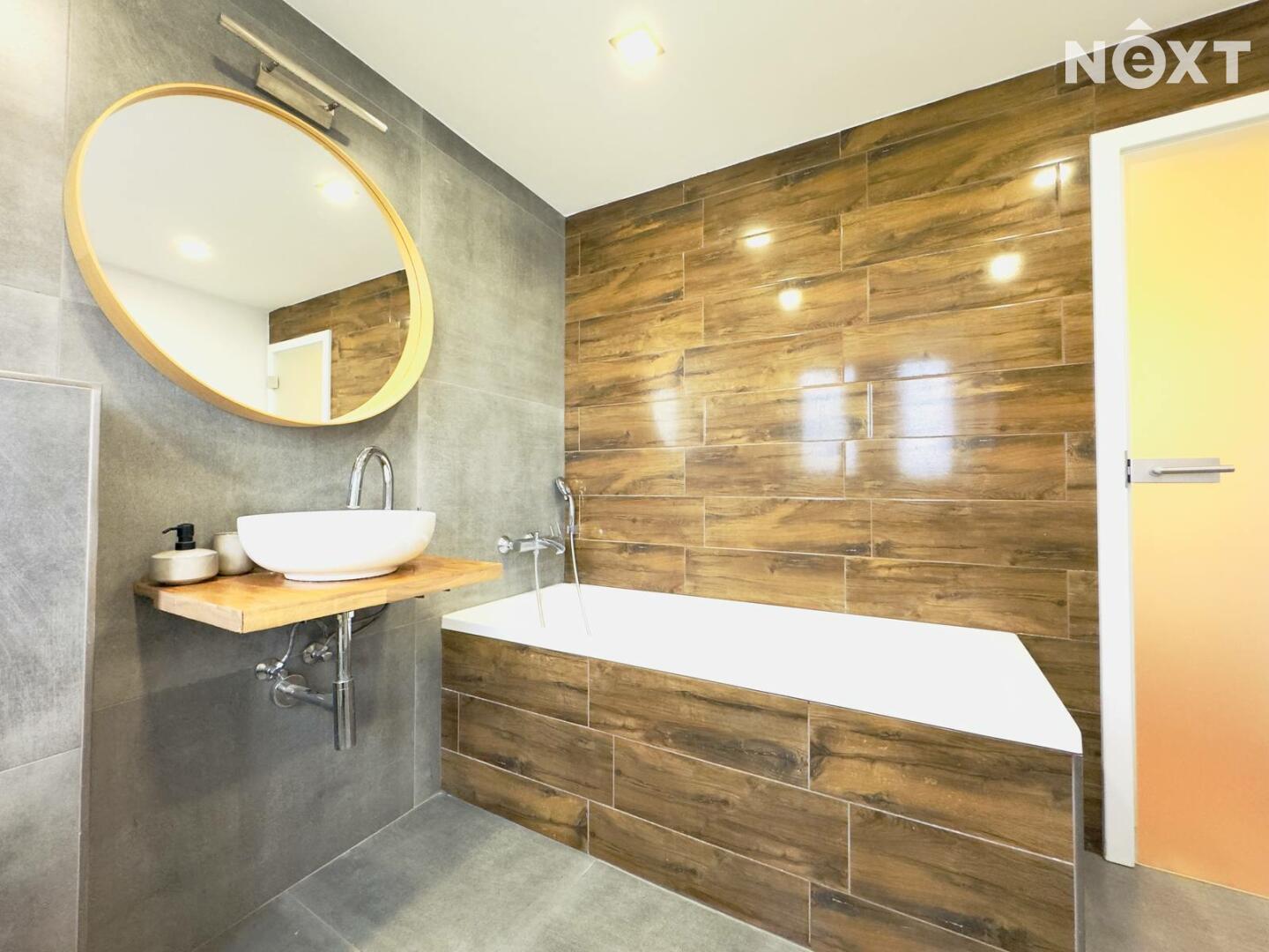 Naproti ložnici se nachází moderní koupelna, která svou velikostí i zpracováním často překvapí. Kombinace šedé dlažby a obkladu v dřevodekoru vytváří téměř lázeňskou atmosféru. Prostorná vana láká k dlouhým večerům a kulaté zrcadlo nad designovým umyvadlem celý prostor zjemňuje.