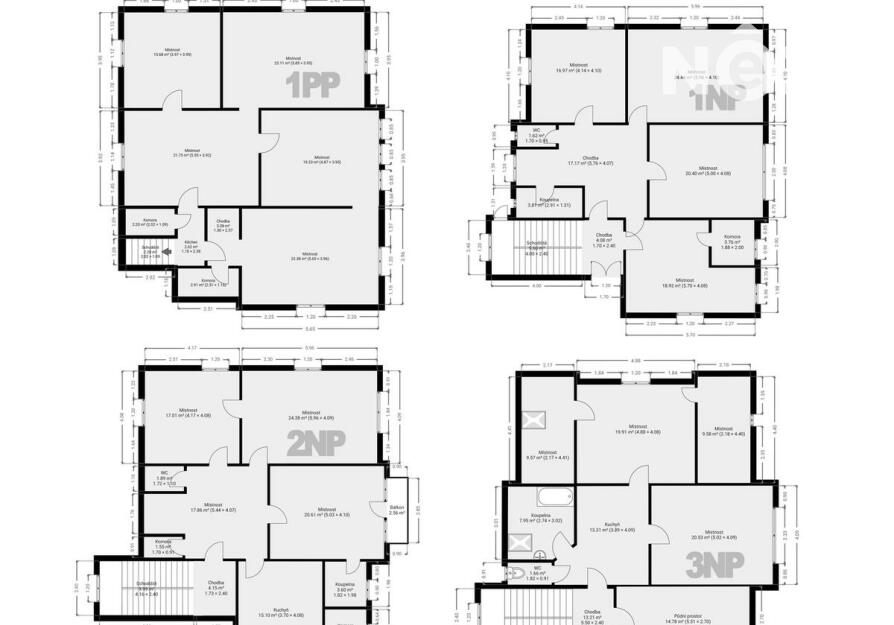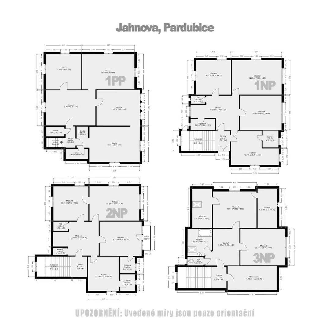 1NP - byt 3+1 - vstupní hala, obývací pokoj, ložnice, pracovna, kuchyně, koupelna - vana WC, druhá koupelna, samostatné WC na chodbě