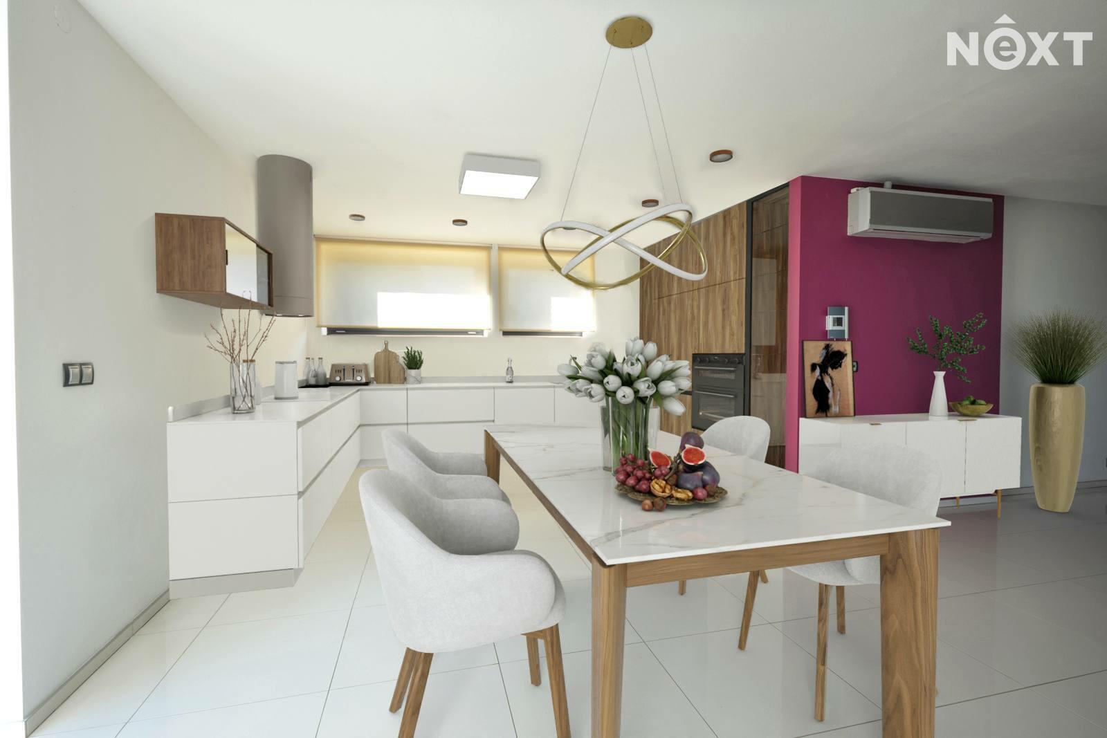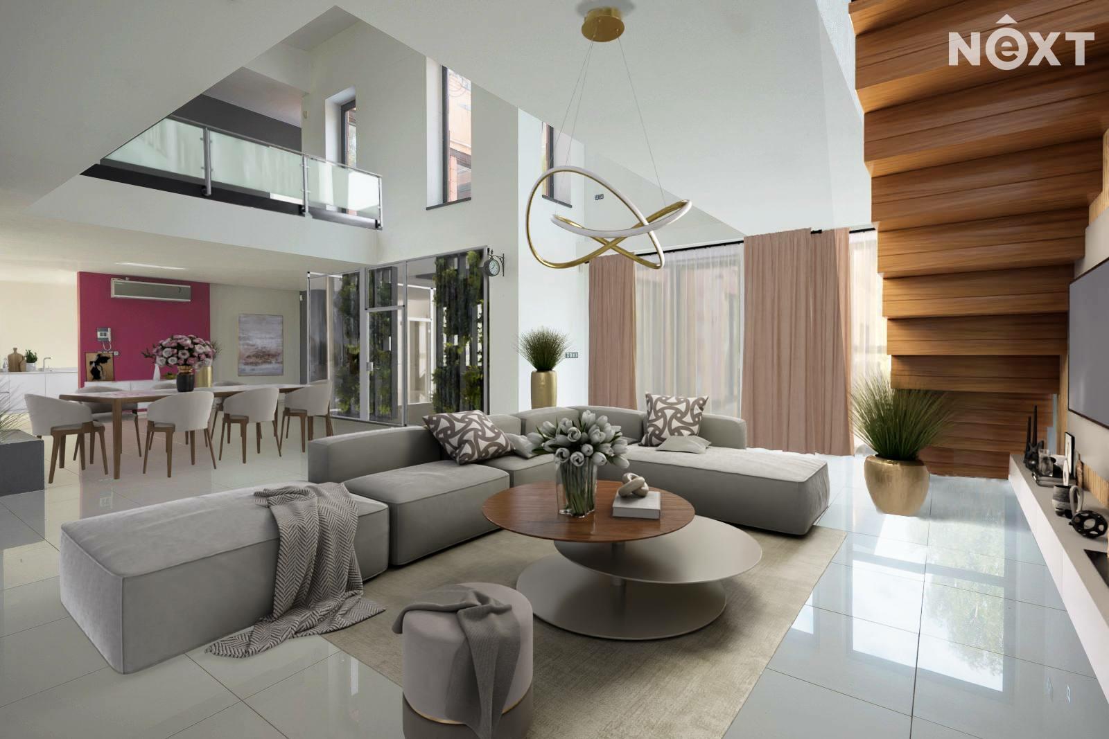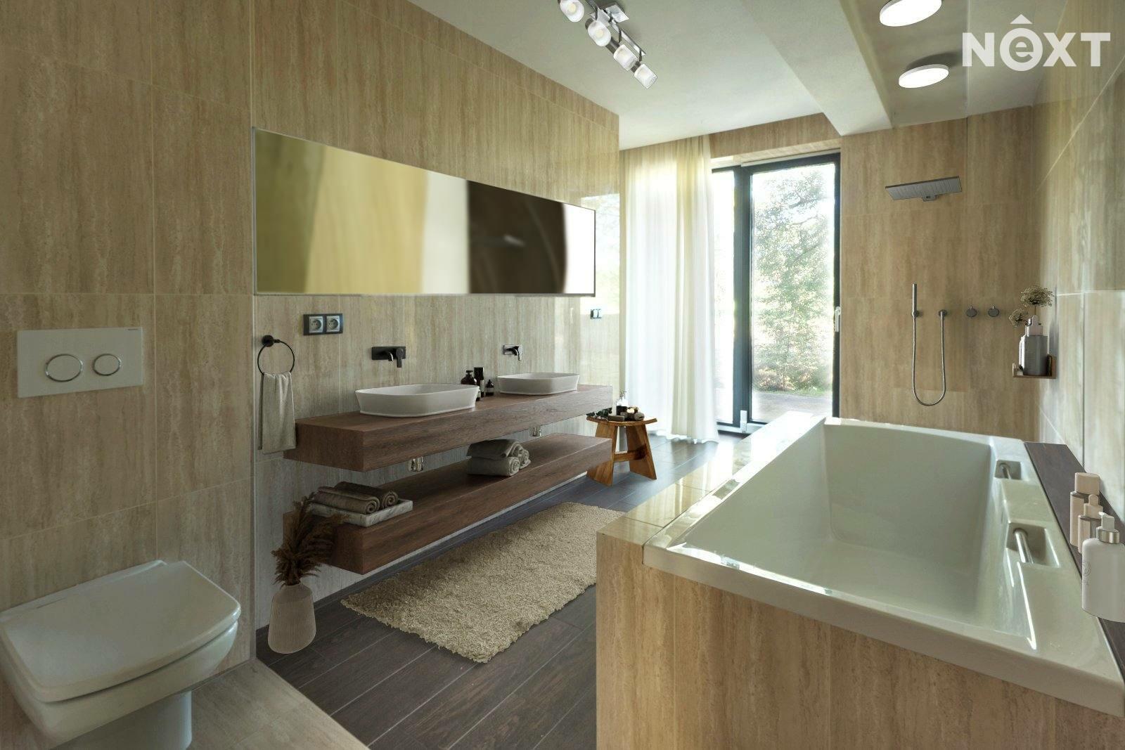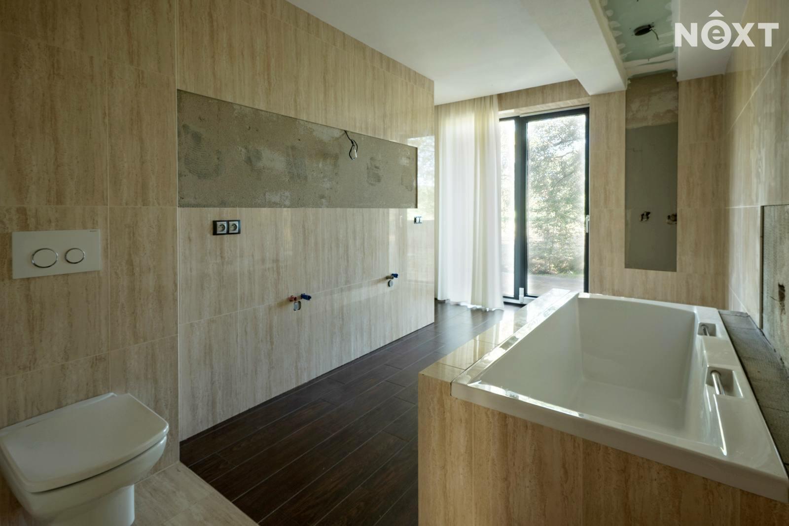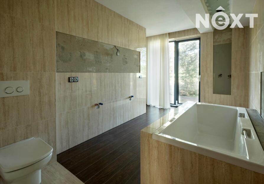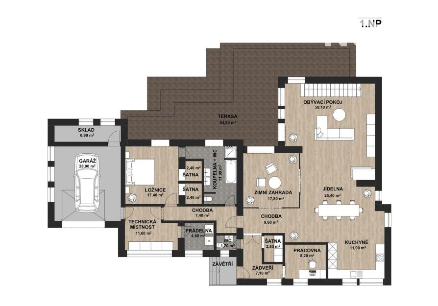 1.NP: zádveří (4,60 m2 a 7,10 m2), šatna (2,80 m2), pracovna (8,20 m2), samostatné WC (1,70 m2), chodba (9,60 m2), kuchyňský kout (11,90 m2), jídelna (25,40 m2), obývací pokoj (50,10 m2), zimní zahrada (17,80 m2), chodba (7,40 m2), technická místnost (11,60 m2) vč. wellness zázemí, prádelna (4,60 m2), ložnice (17,40 m2), dvě šatny (2,40 m2 a 2,40 m2), koupelna s WC (11,90 m2), garáž (28 m2) s přímým vstupem do domu, sklad (6,30 m2), terasa (54,80 m2) s výhledem do zahrady nabízí dostatek soukromí a místo pro příjemné posezení a relaxaci.