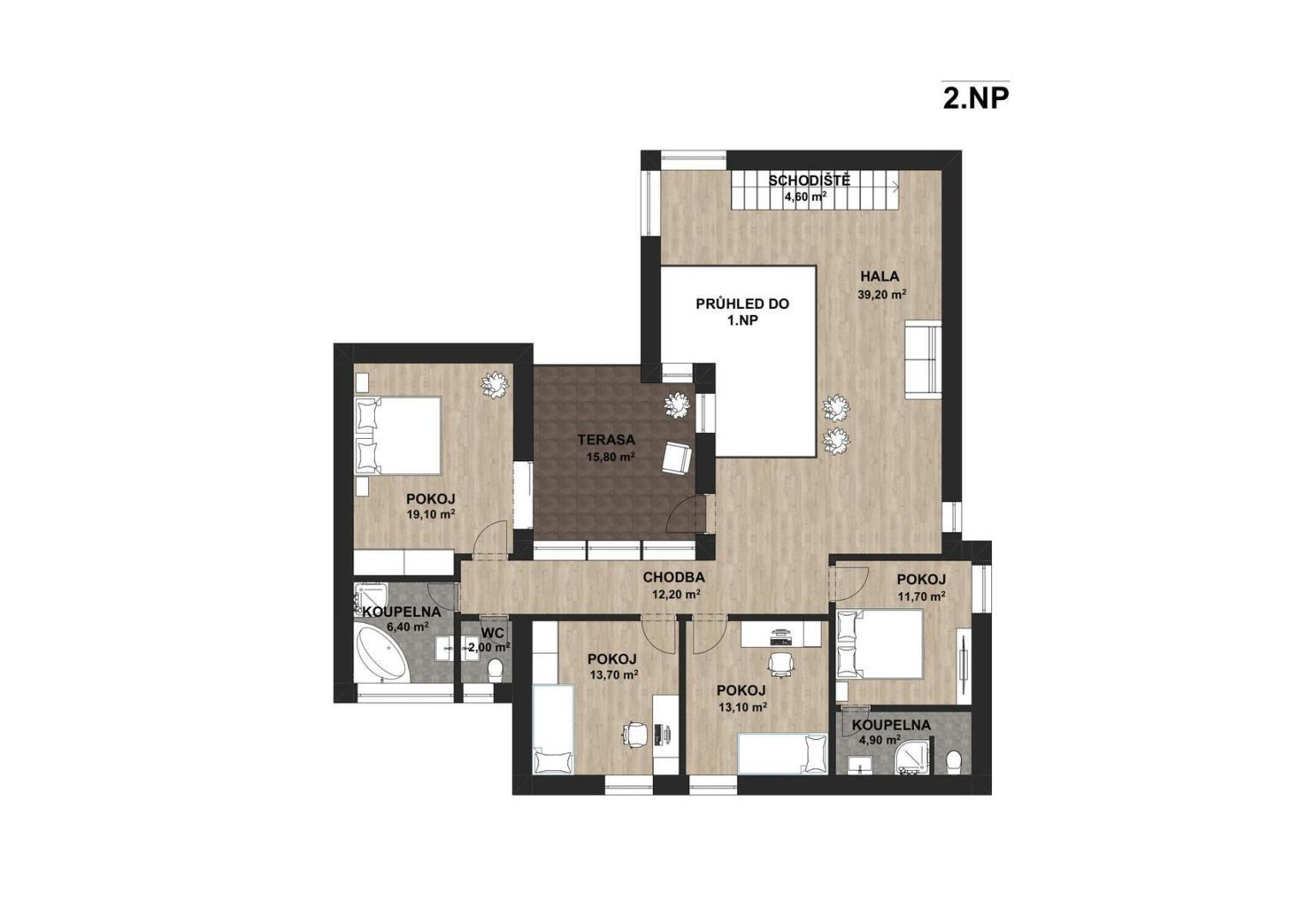 2.NP: hala (39,20 m2), chodba (12,20 m2), tři pokoje (19,10 m2, 13,70 m2, 13,10 m2), koupelna s WC (6,40 m2), samostatné WC (2 m2), pokoj pro hosty (11,70 m2) s vlastní koupelnou vč. WC (4,90 m2), terasa (15,80 m2).
