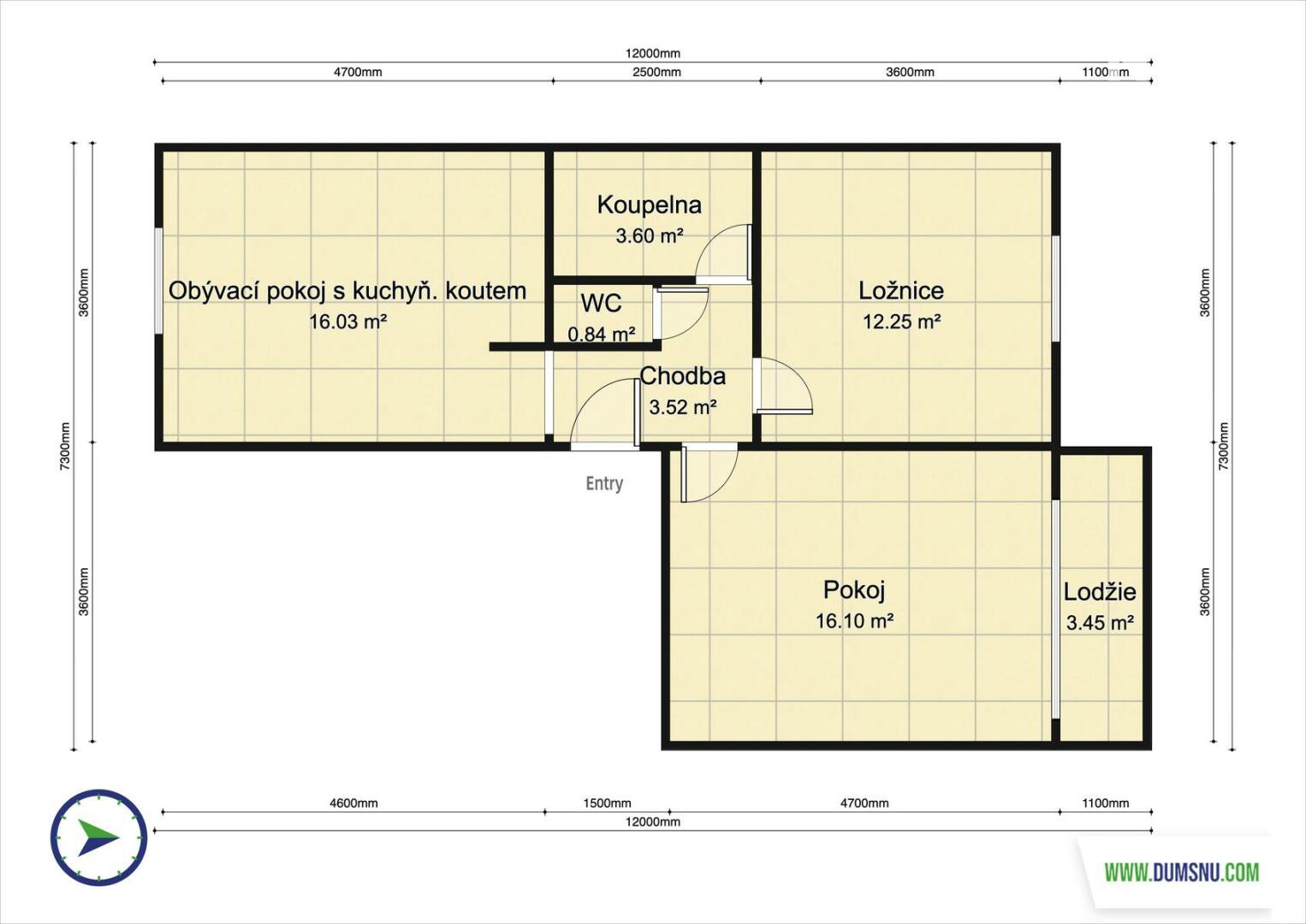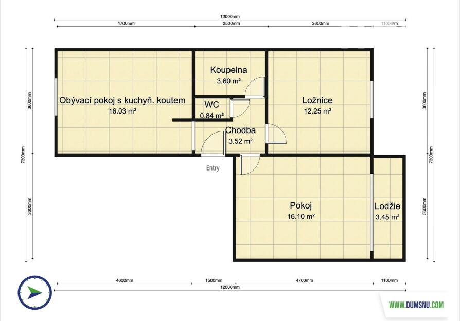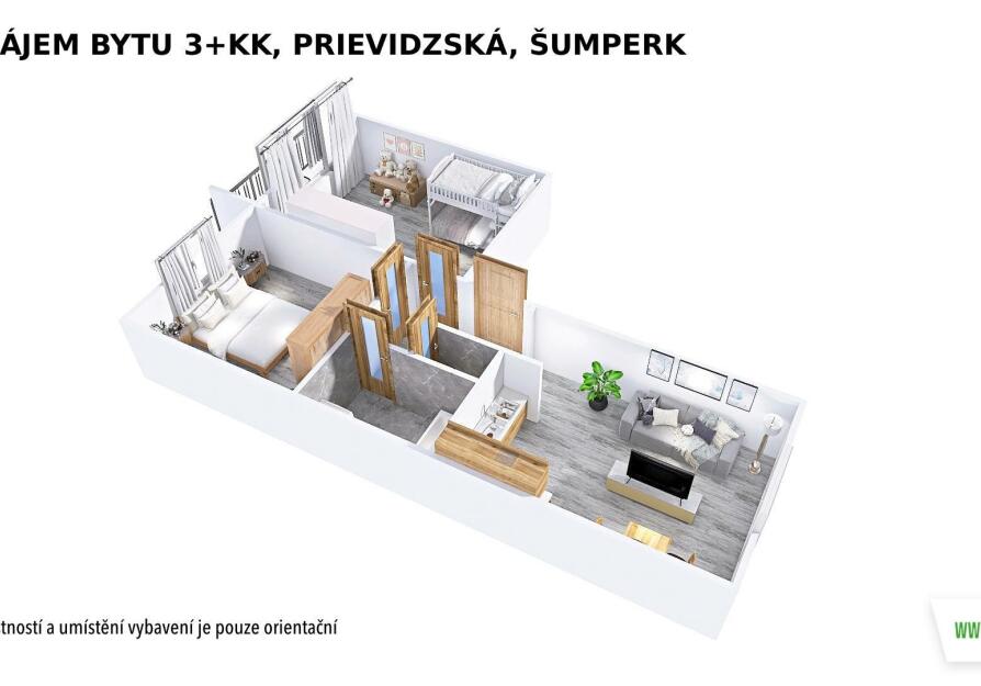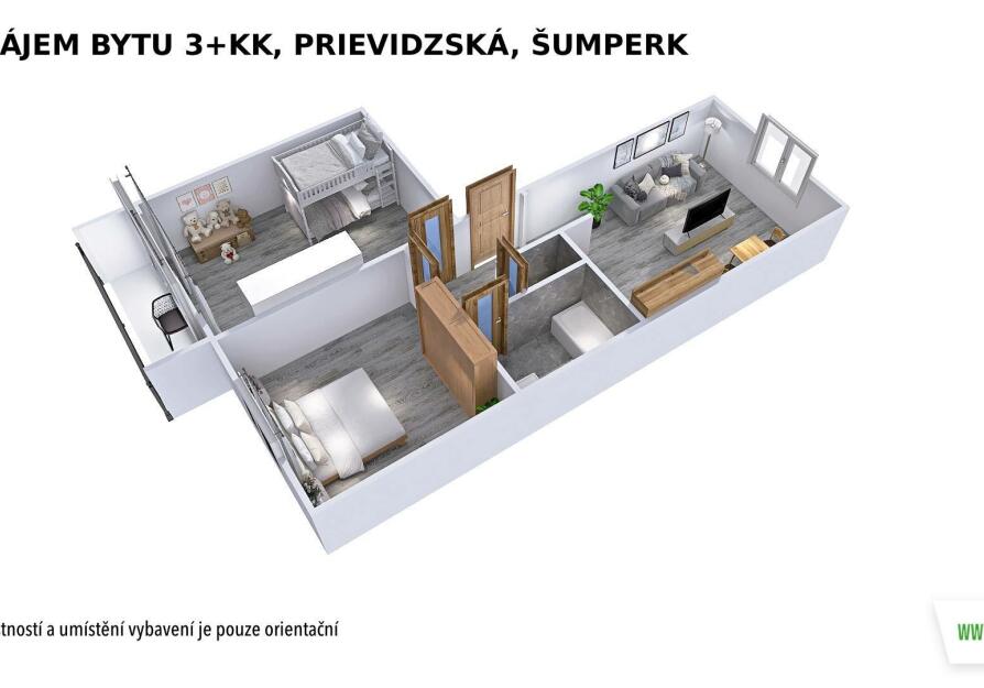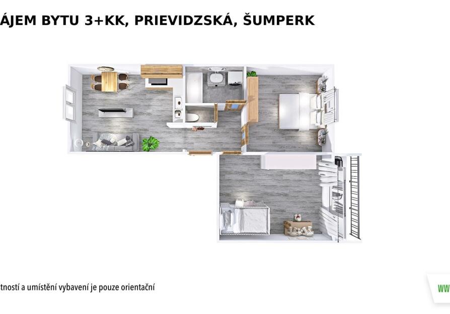 Dispozice bytu: ze vstupní chodby se vstupuje do kuchyně, která nabízí prostor pro jídelní i obývací část, dále jsou zde dva samostatné pokoje, koupelna s vanou a samostatná toaleta.