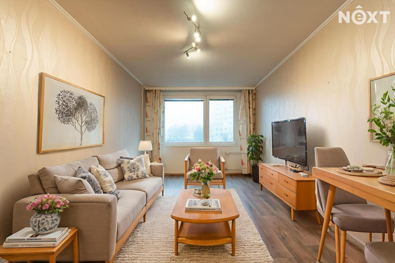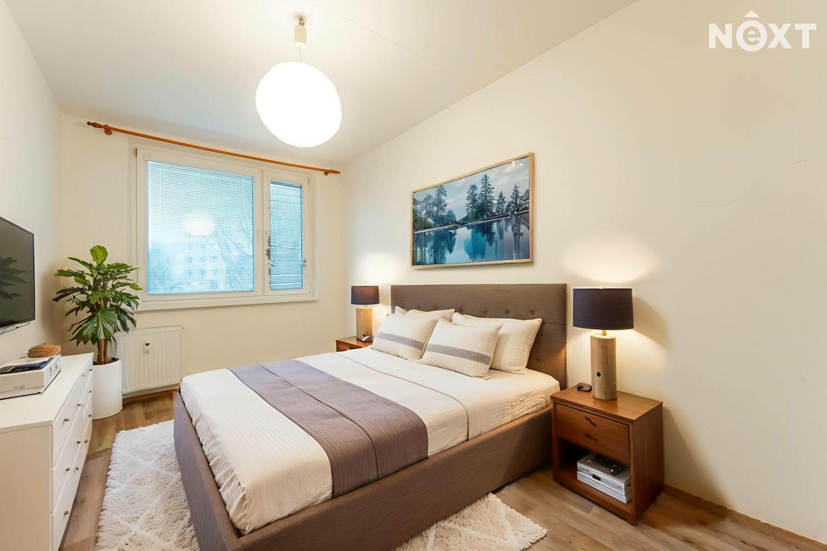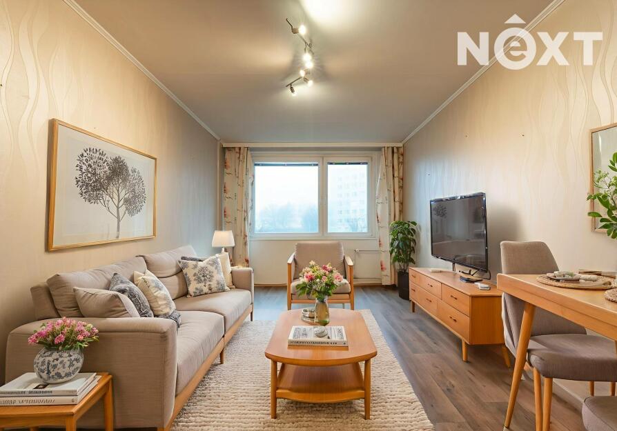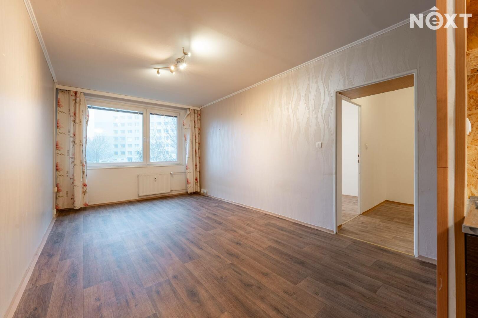 Byt se nachází ve 4 patře panelového domu. Z chodby se vchází do samostatné toalety, koupelny a obytných místností. Ložnice i obývací pokoj jsou situovány do vnitrobloku. Na obývací pokoj navazuje kuchyňská linka. Za domem je dětské hřiště, lékárna, Albert. Parkování je v okolí domu.