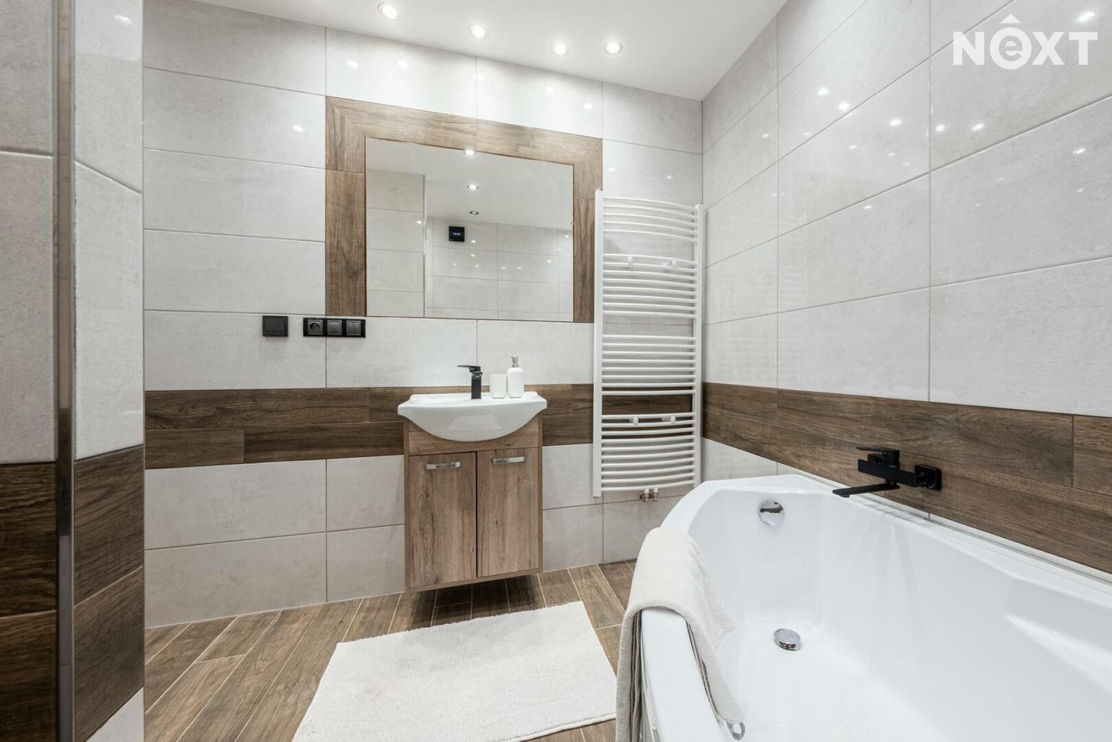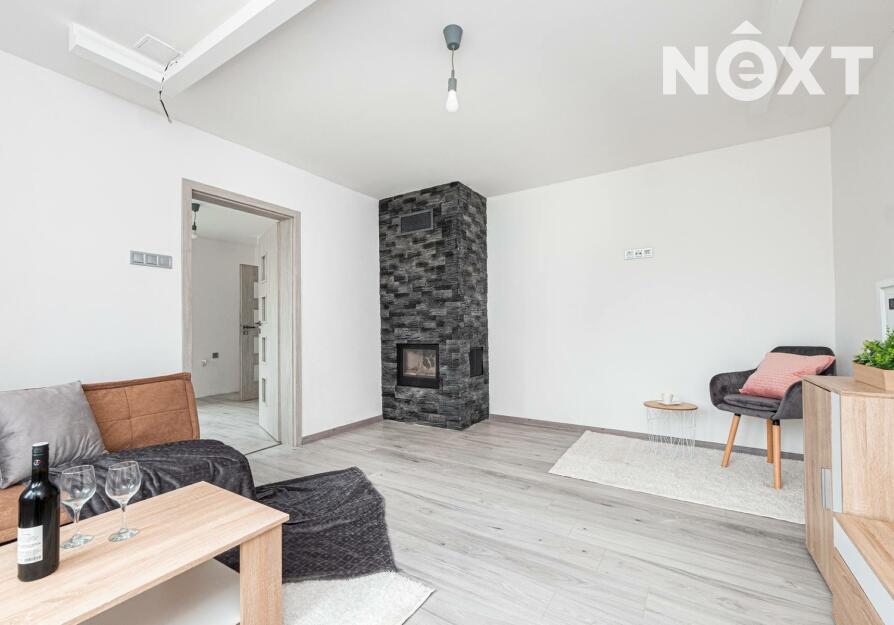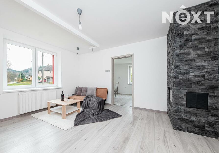 Dispozice bytu: obývací pokoj s krbem, kuchyň, ložnice, koupelna s vanou, sprchovým koutem a podlahovým vytápěním, samostatné WC