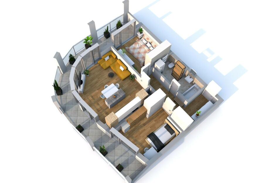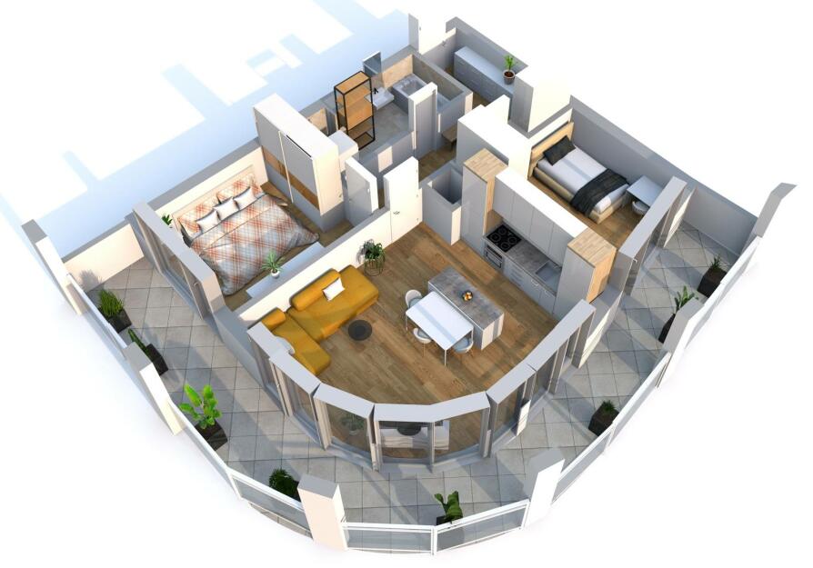 Byt má dispozici 3+kk a výměru 67 m². Je ve třetím patře nového bytového domu s výtahem a skládá se z obývacího pokoje s kuchyní, dvou ložnic, koupelny s WC a velké terasy. K bytu patří kryté stání a sklep.