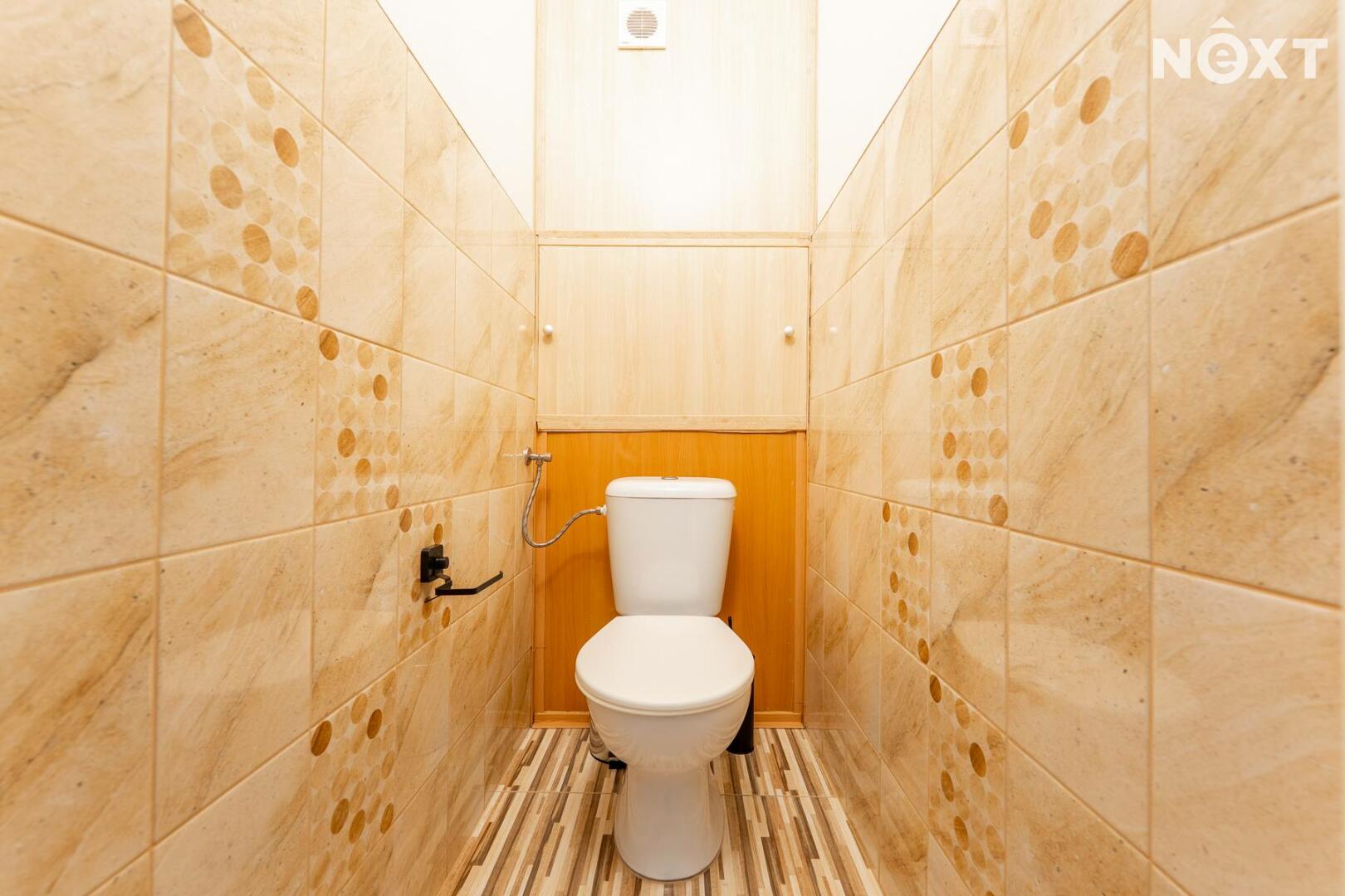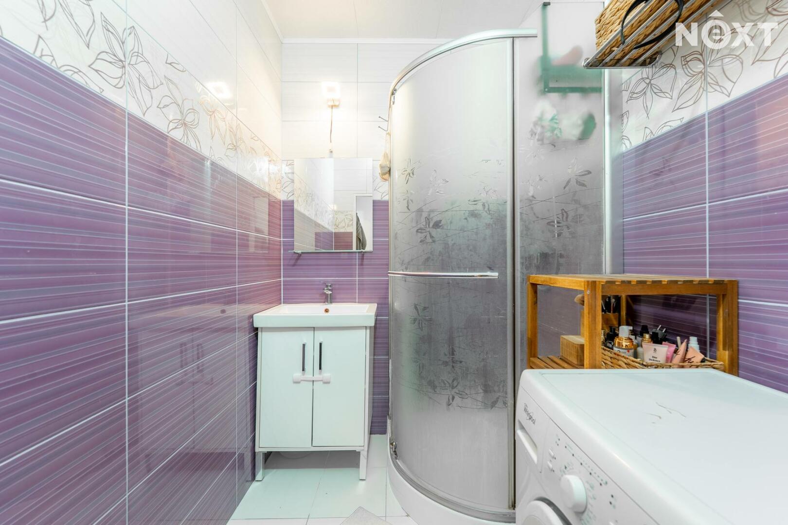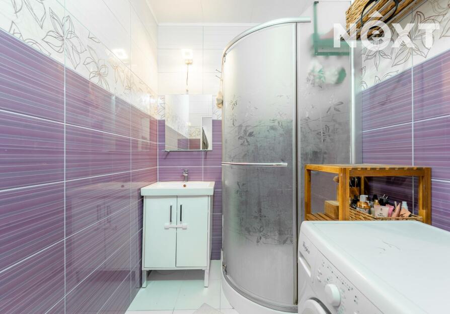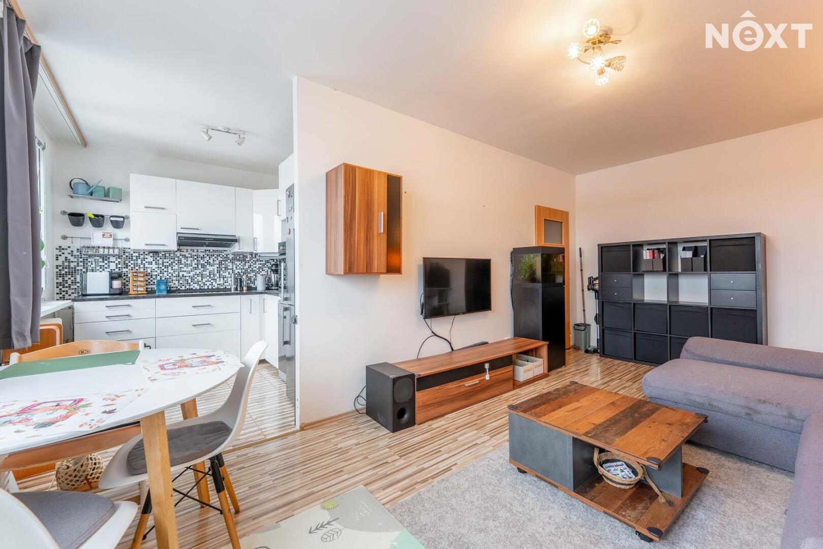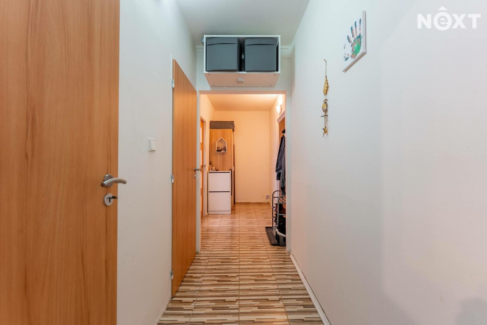 Dispozice bytu zahrnuje vstupní předsíň s prostorem pro vestavěnou skříň, ze které se vstupuje do ložnice a obývacího pokoje. Na obývací pokoj navazuje kuchyně. Z chodby je vstup do samostatné koupelny, která je vybavena sprchovým koutem, umyvadlem a nechybí ani prostor pro pračku a sušičku. Všechna okna jsou osazena venkovními elektrickými roletami. K bytu náleží sklepní kóje a k dispozici jsou také společné prostory, jako je kolárna a sušárna.