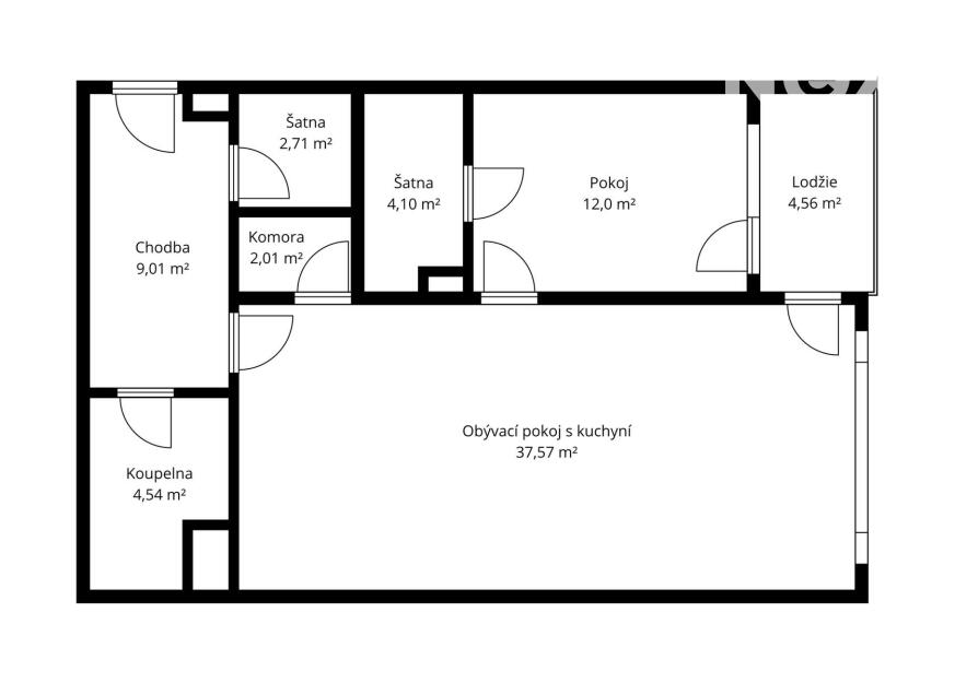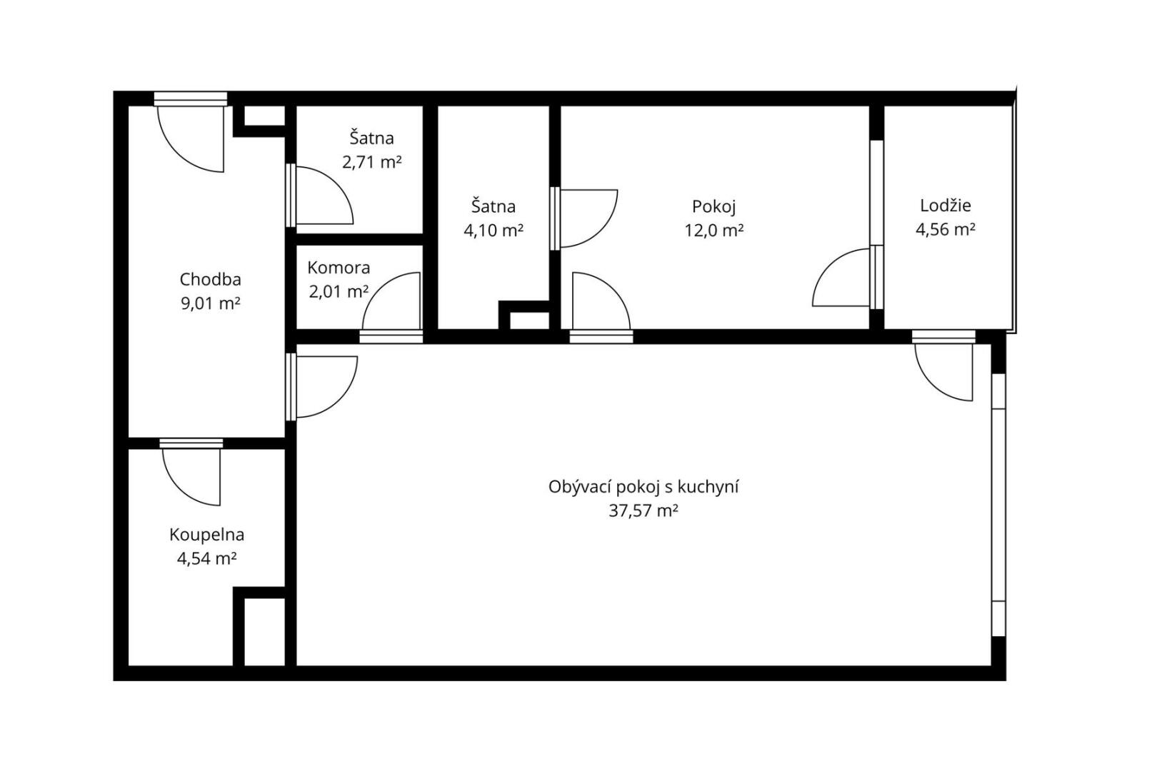 Dispozici tvoří obývací pokoj s kuchyňským koutem, samostatná ložnice, koupelna s toaletou, dvě šatny, technická místnost, prostorná vstupní chodba a lodžie, což je u bytu 2+kk výjimečné.