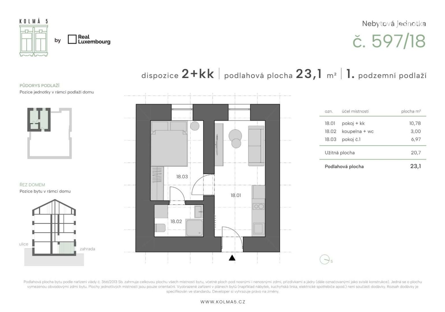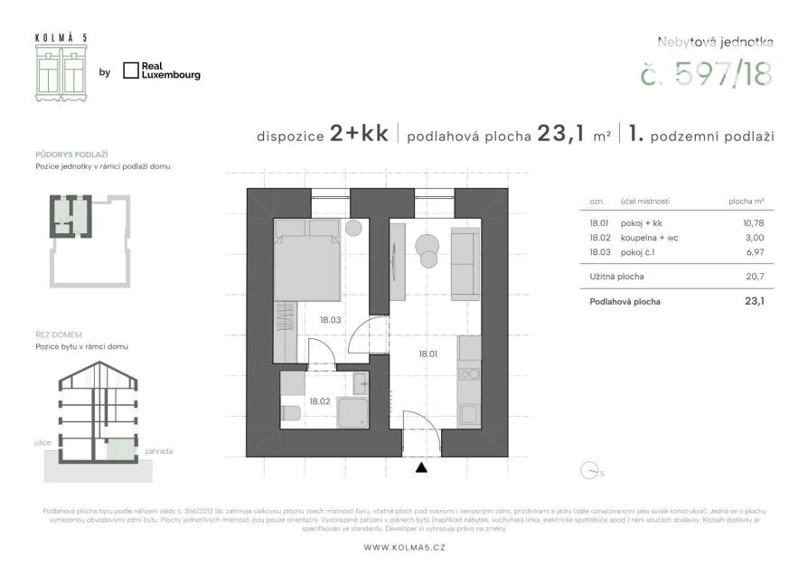 Tato konkrétní jednotka č.18 o dispozici 2kk a podlahové ploše 23,1 m2 se nachází v 1 podzemním podlaží s výhledem do ulice. Přesné rozložení si můžete prohlédnout na přiloženém půdorysu. Vytápění je řešeno elektrickými přímotopy a ohřev vody elektrickým bojlerem.