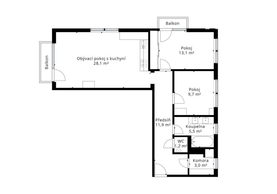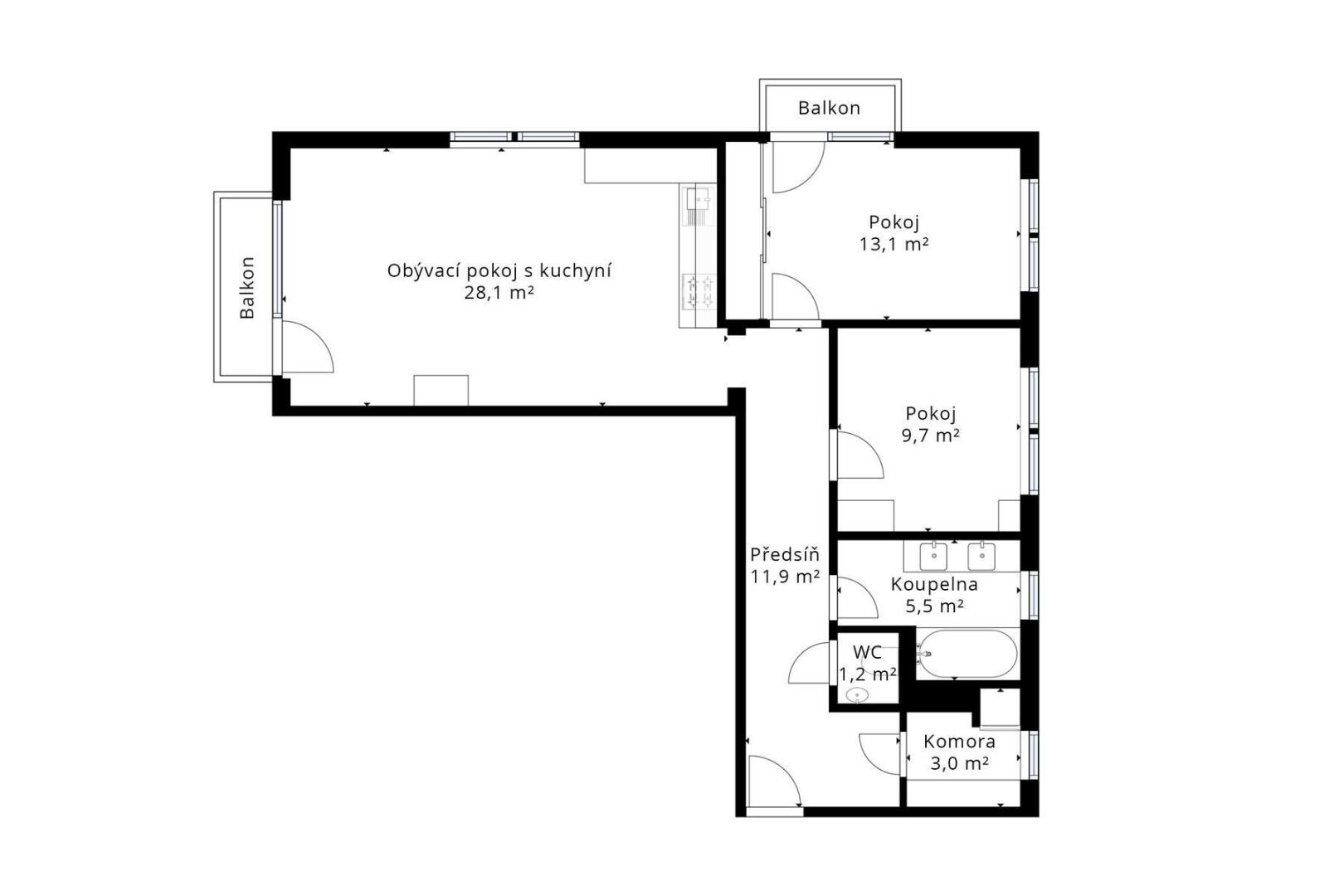 Dispozice bytu zahrnuje prostorný obývací pokoj s kuchyňským a jídelním koutem (28,1 m²) se vstupem na balkon, ložnici (13,1 m²) s vlastním balkonem, další pokoj (9,7 m²), předsíň (11,9 m²), koupelnu s oknem a vanou (5,5 m²), samostatné WC (1,2 m²) a praktickou komoru (3 m²) s vývody na pračku a sušičku.