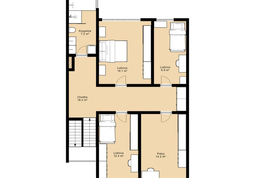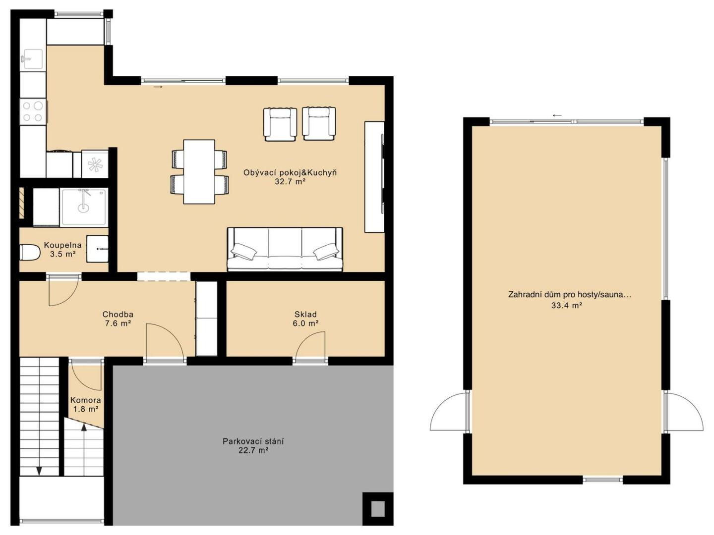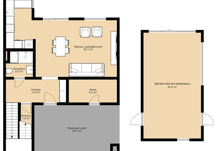 Celková podlahová plocha nemovitosti činí 163,2 m², přičemž tato výměra již zahrnuje i samostatný zahradní domek o velikosti 34,2 m². Tento oddělený objekt nabízí široké možnosti využití – může sloužit jako dům pro hosty, ateliér, domácí kancelář, studio či prostor pro podnikání. Díky tomu získáváte nejen hlavní obytný dům, ale i plnohodnotný doplňkový prostor s velkou mírou flexibility.