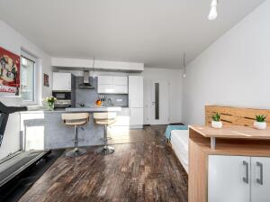 Dominantou bytu je světlý obývací pokoj s kuchyňským koutem, jež je vybavena vestavěnými spotřebiči (myčkou nádobí, lednicí, varnou deskou a mikrovlnnou troubou)