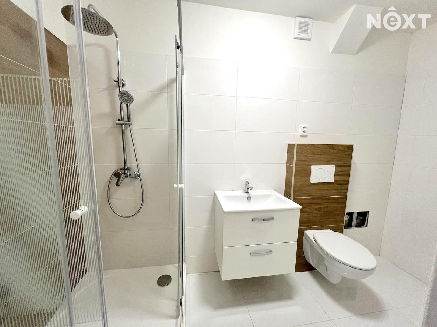 Koupelna je vybavena sprchovým koutem, umyvadlem a toaletou.