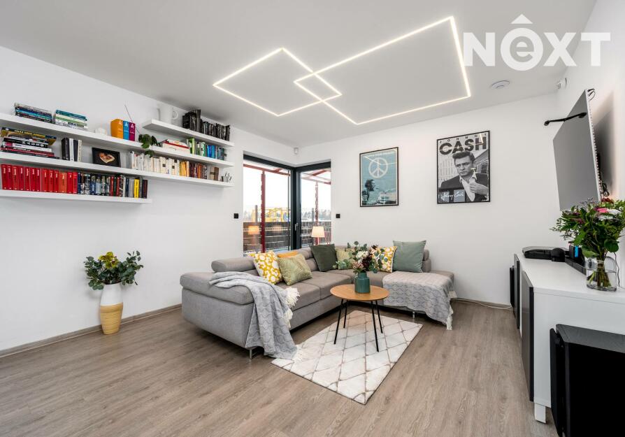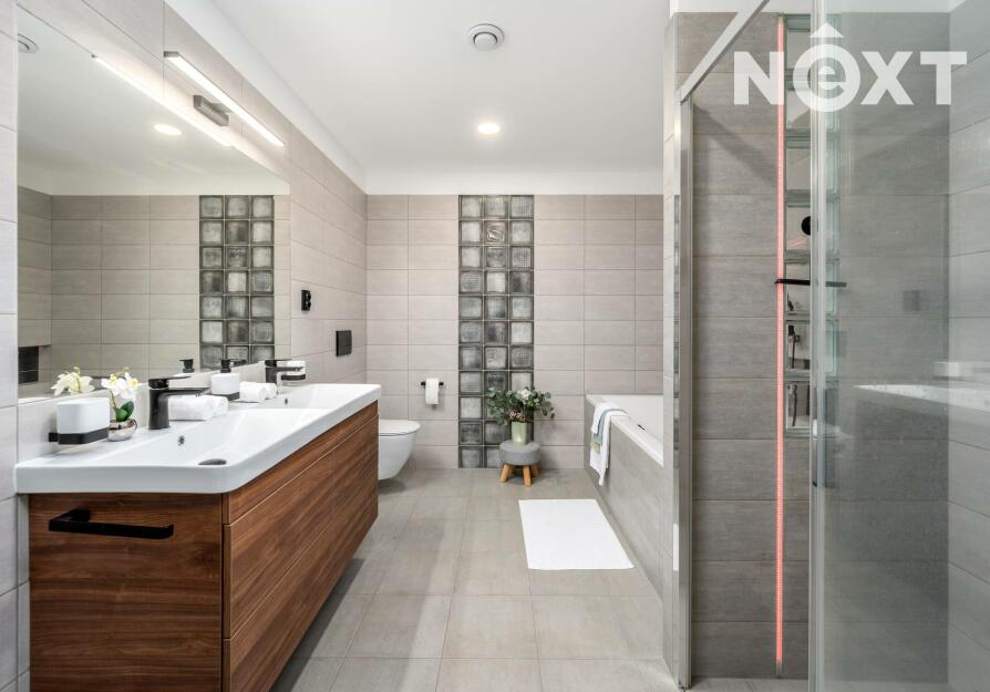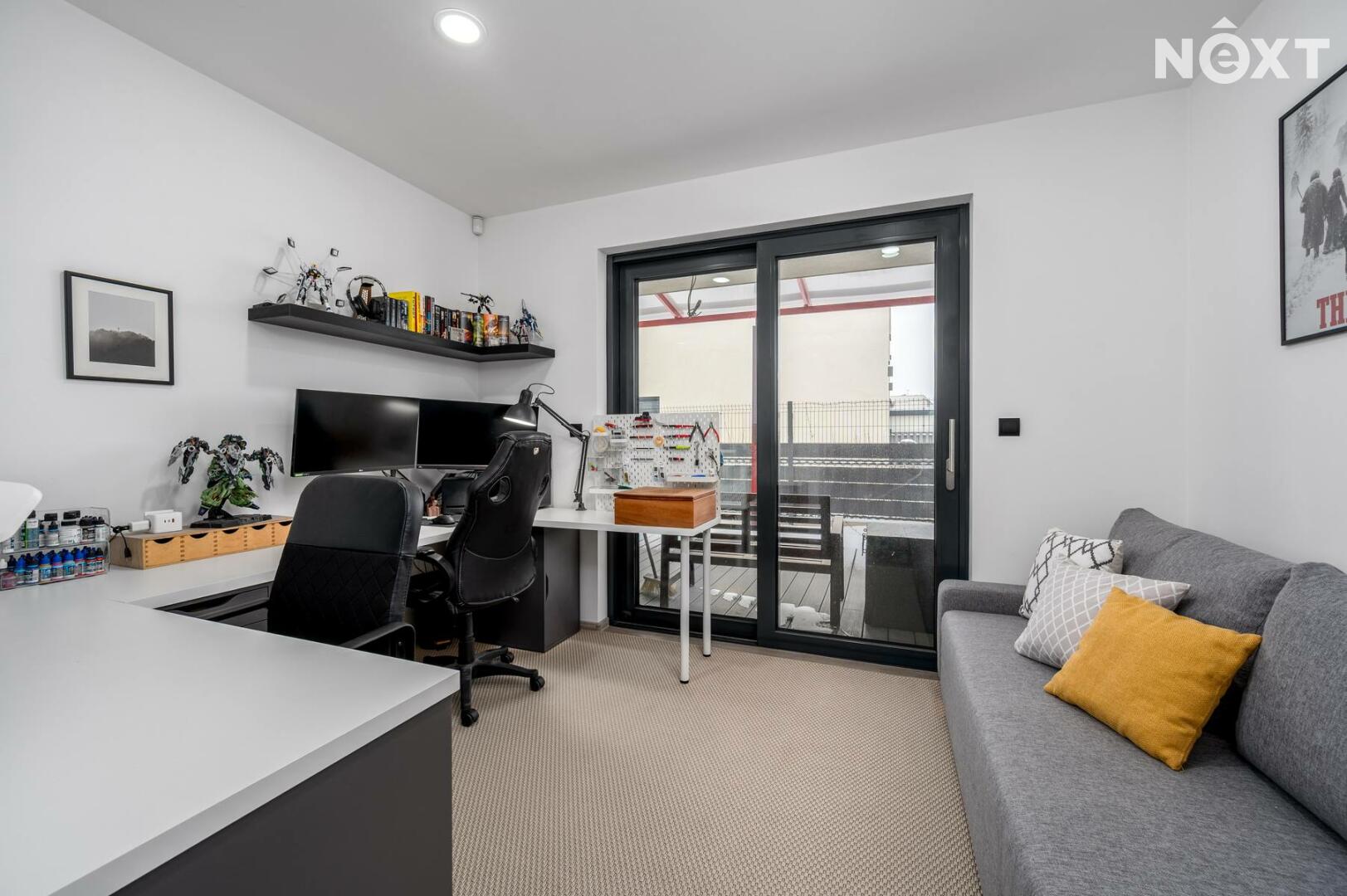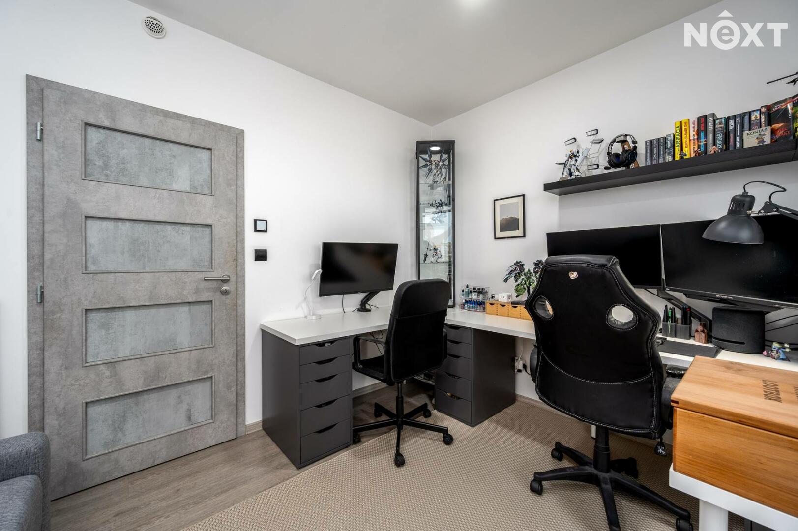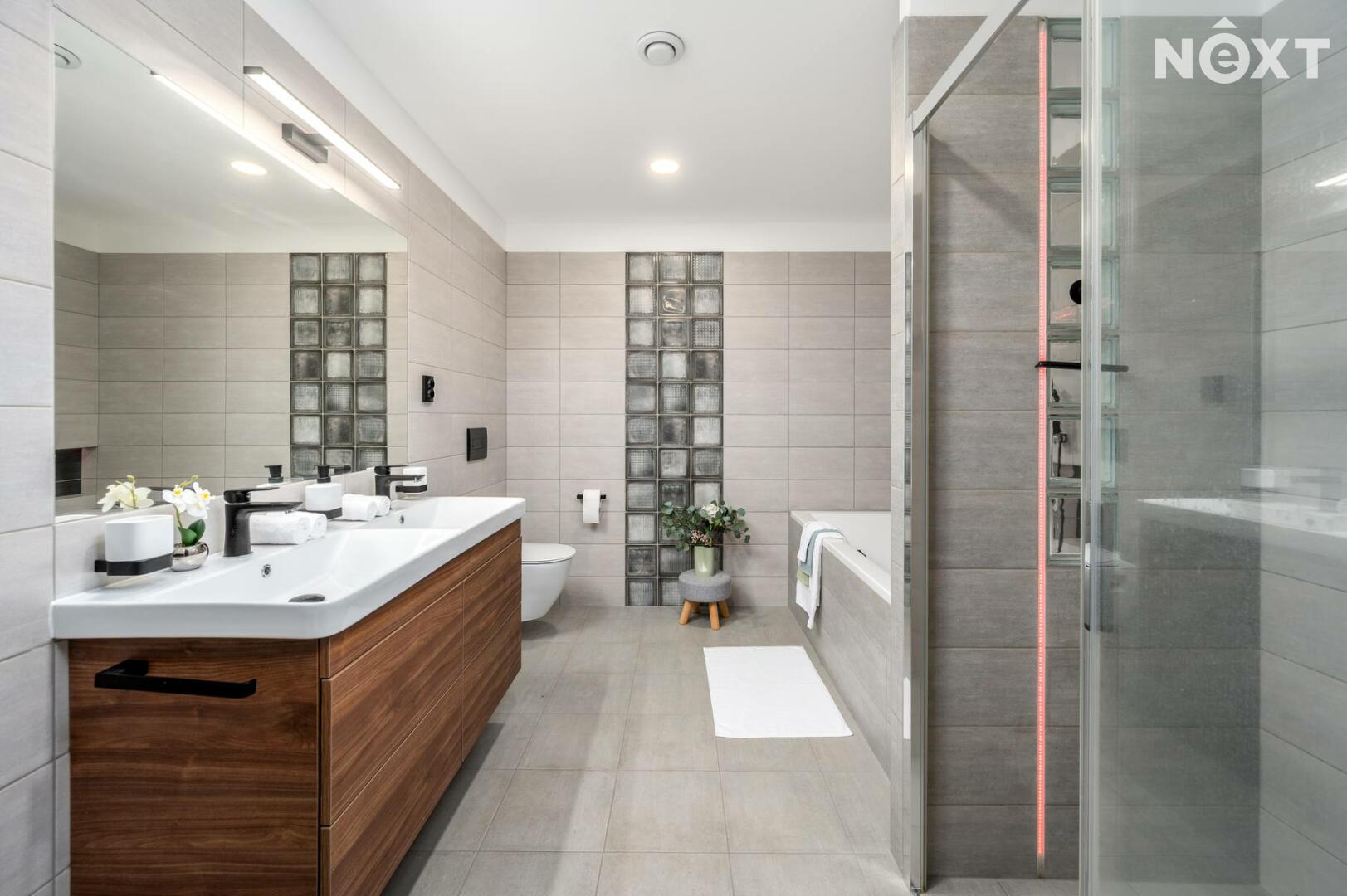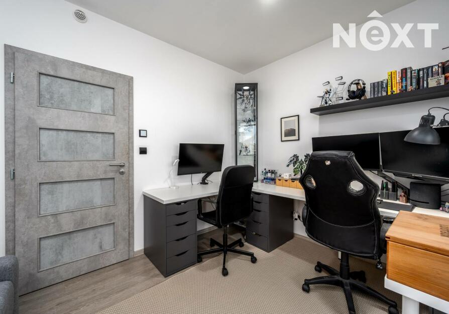 OP s kuchyní 31,28 m2, dětský pokoj 11,47 m2, pracovna 9,86 m2, ložnice 12,68 m2, koupelny se sprchovým koutem, vanou a toaletou 8,79 m2 a dále samostatným WC 1,54 m2.