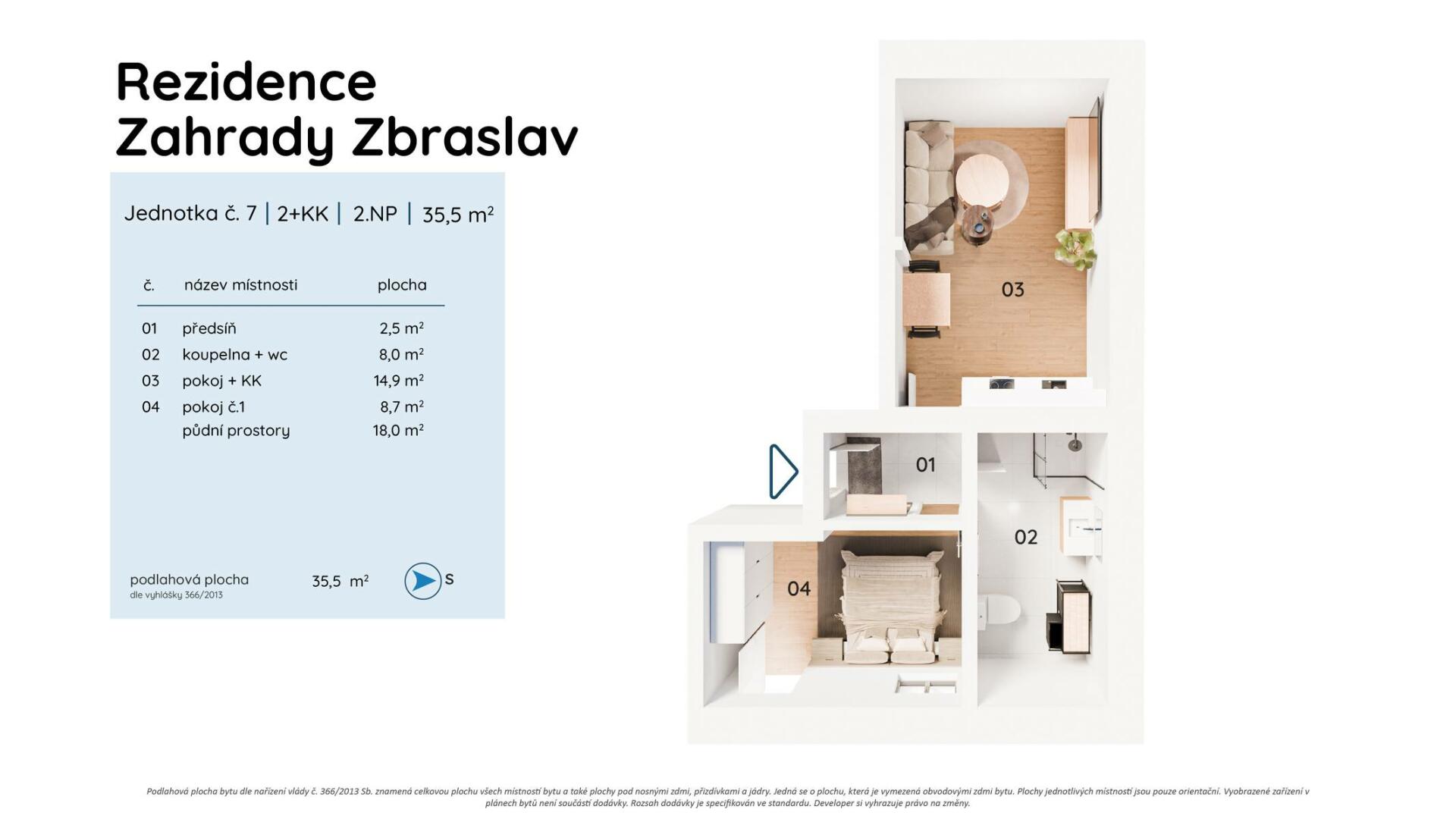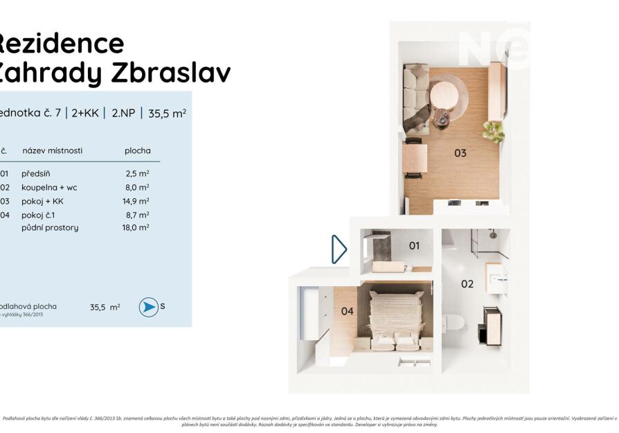 Dispozičně byt nabízí prostorný obývací pokoj s přípravou na kuchyňský kout, ložnici, koupelnu se sprchovým koutem a toaletou, předsíň a šatnu. Všechny místnosti jsou světlé a dobře řešené.