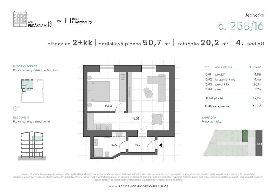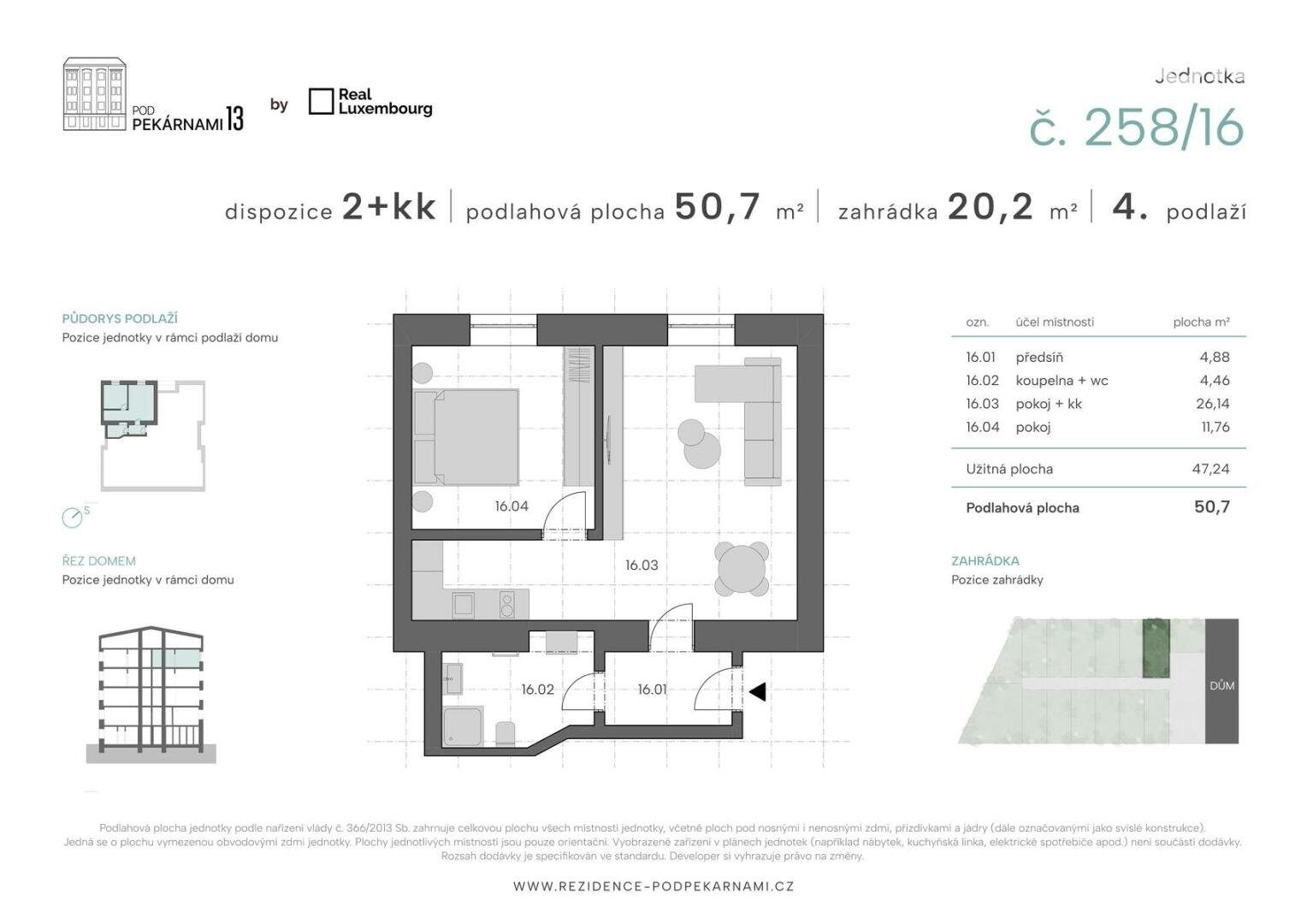 Rád bych Vám v rámci výhradního zastoupení developera představil byt 2+kk o podlahové ploše 50,7 m² v citlivě rekonstruovaném projektu Rezidence Pod Pekárnami 13, situovaném v klidné části Prahy 9. Byt se nachází ve 4. nadzemním podlaží, je orientovaný na severozápad, směrem do dvora a jeho benefitem je soukromá zahrádka o výměře 20,2 m².