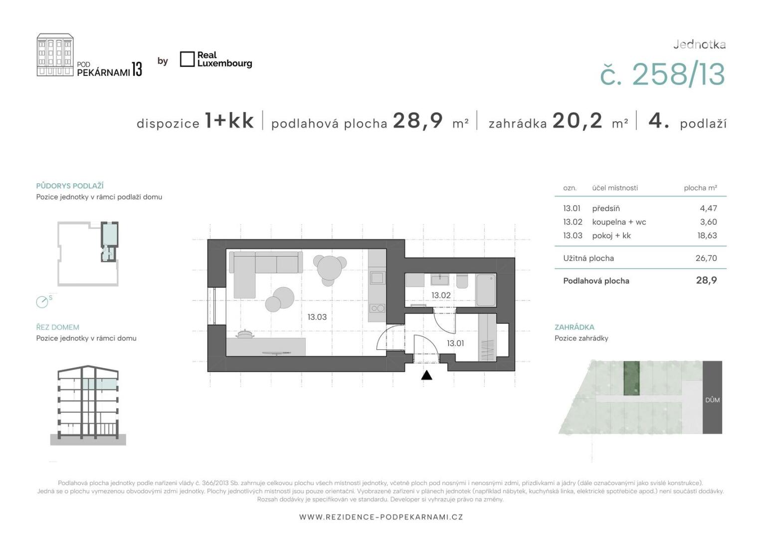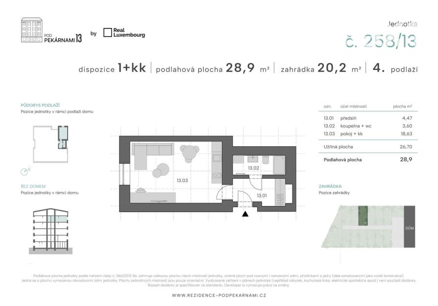Rád bych Vám v rámci výhradního zastoupení developera představil byt 1+kk o podlahové ploše 28,9 m² v citlivě rekonstruovaném projektu Rezidence Pod Pekárnami 13, situovaném v klidné části Prahy 9. Byt se nachází ve 4. nadzemním podlaží, je orientovaný na severozápad, směrem do dvora a jeho benefitem je soukromá zahrádka o výměře 20,2 m².