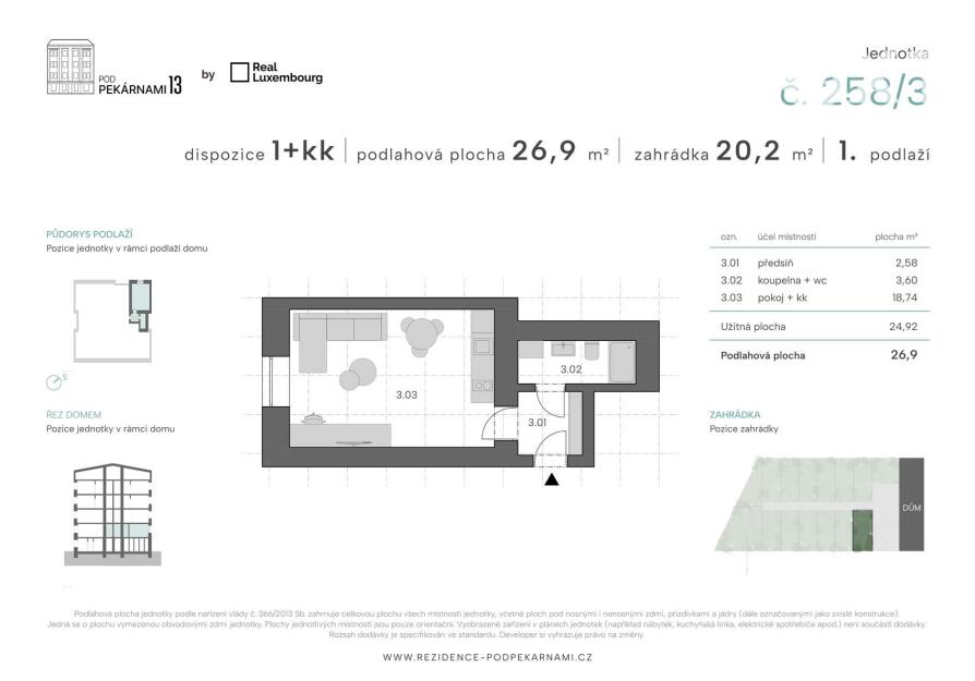 Rád bych Vám v rámci výhradního zastoupení developera představil byt 1+kk o podlahové ploše 26,9 m² v citlivě rekonstruovaném projektu Rezidence Pod Pekárnami 13, situovaném v klidné části Prahy 9. Byt se nachází ve 1. nadzemním podlaží, je orientovaný na severozápad, směrem do dvora a jeho benefitem je soukromá zahrádka o výměře 20,2 m².