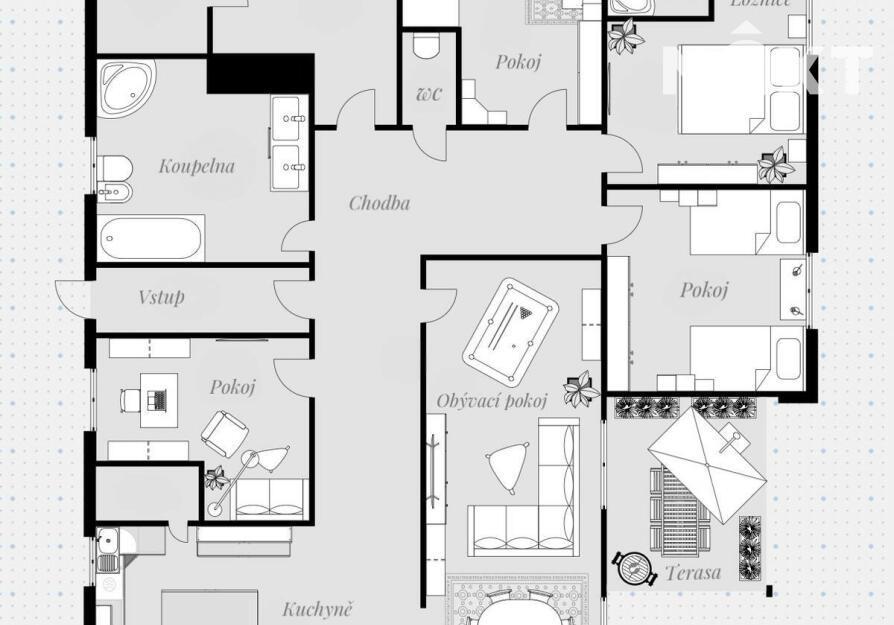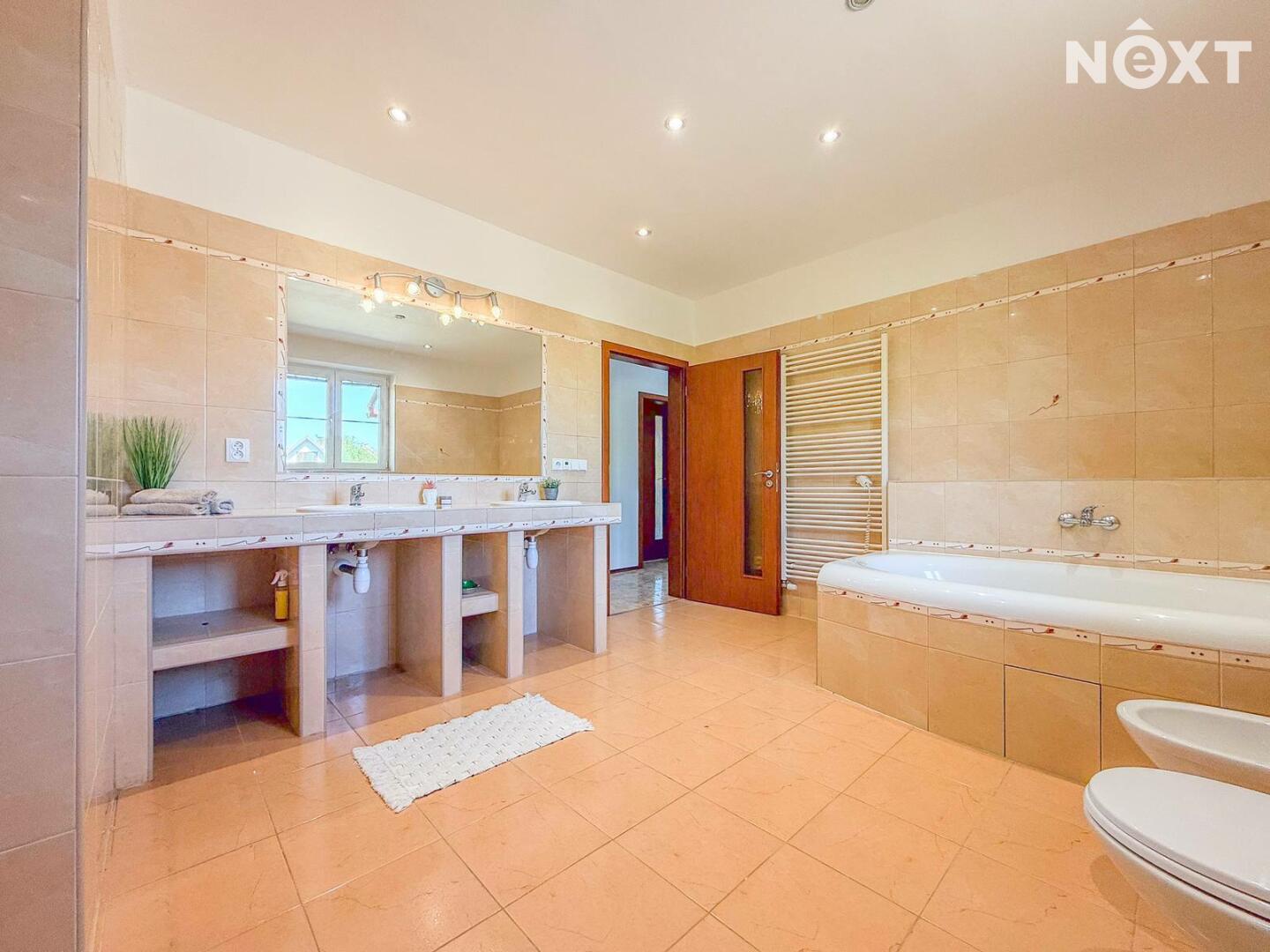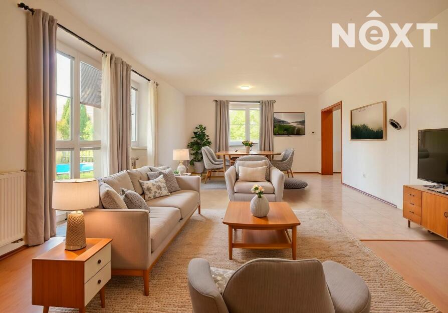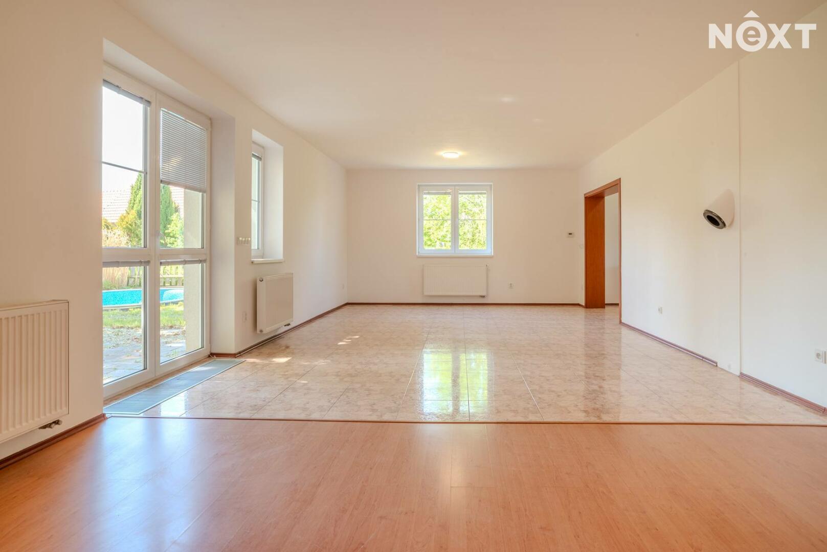 Na udržovaném pozemku se nachází bazén ideální pro letní osvěžení a také okrasné jezírko, které podtrhuje příjemnou atmosféru zahrady. Terasa navazující na obývací pokoj slouží jako ideální místo pro relaxaci, posezení s rodinou či přáteli.