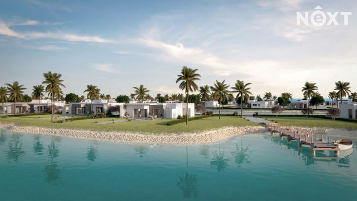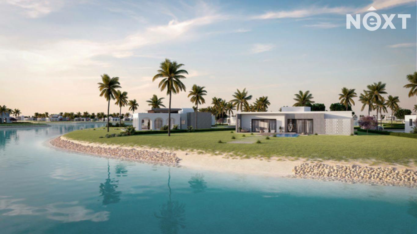 Nový projekt ostrov Lubana zasazen do lagun se slanou mořskou vodou, v okolí se tyčí pohoří Jebel Samhan.