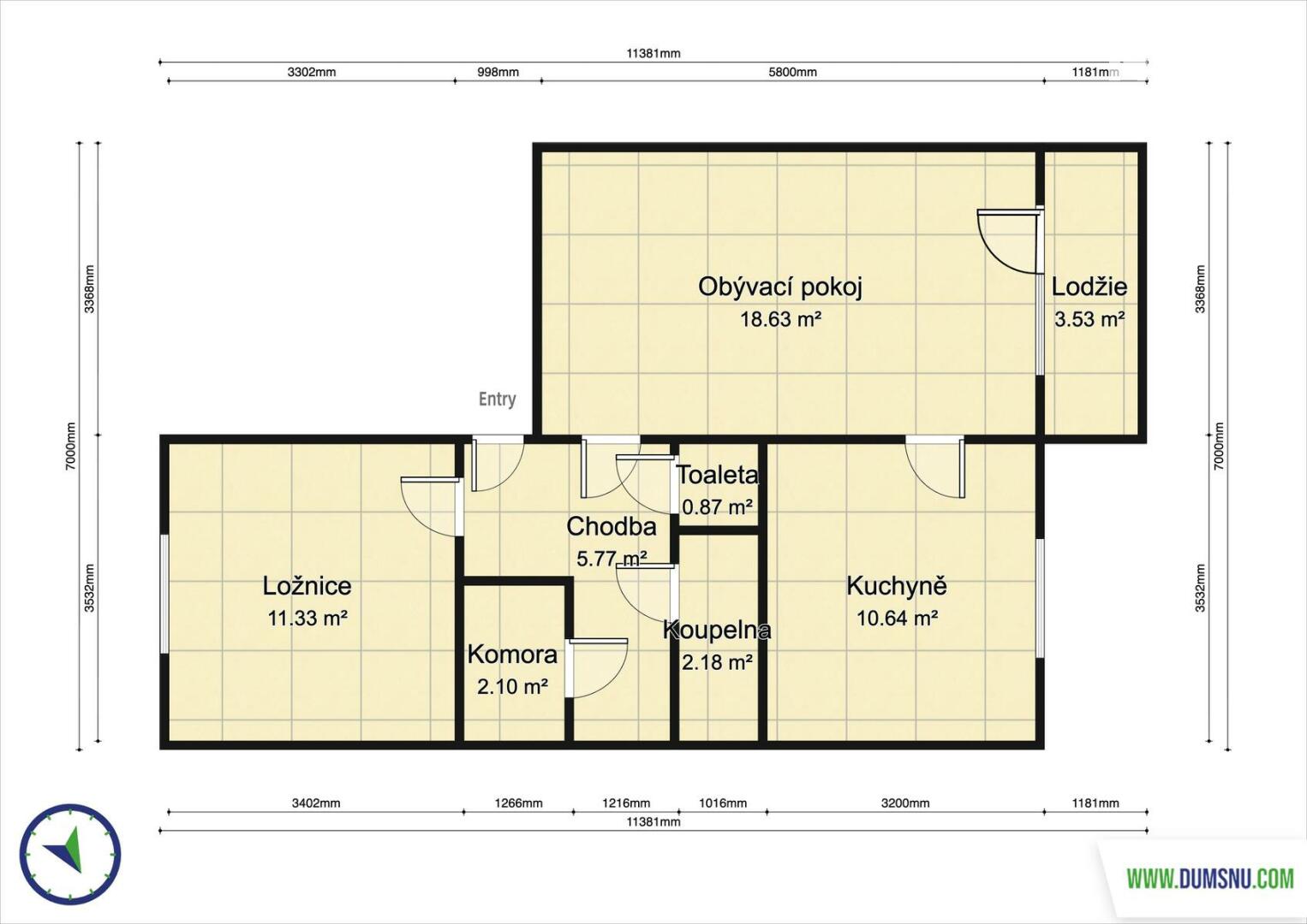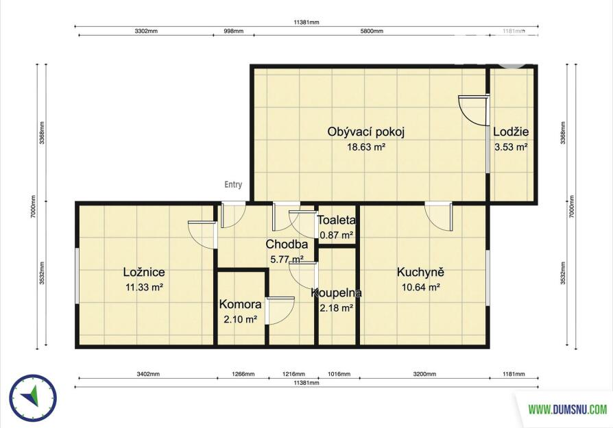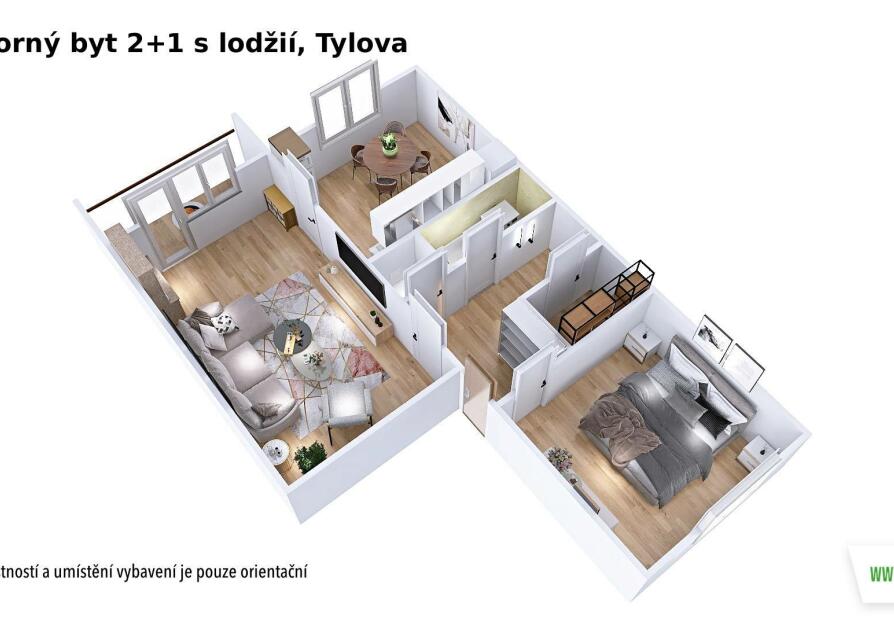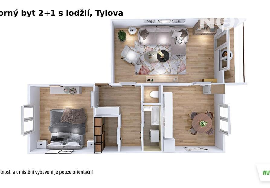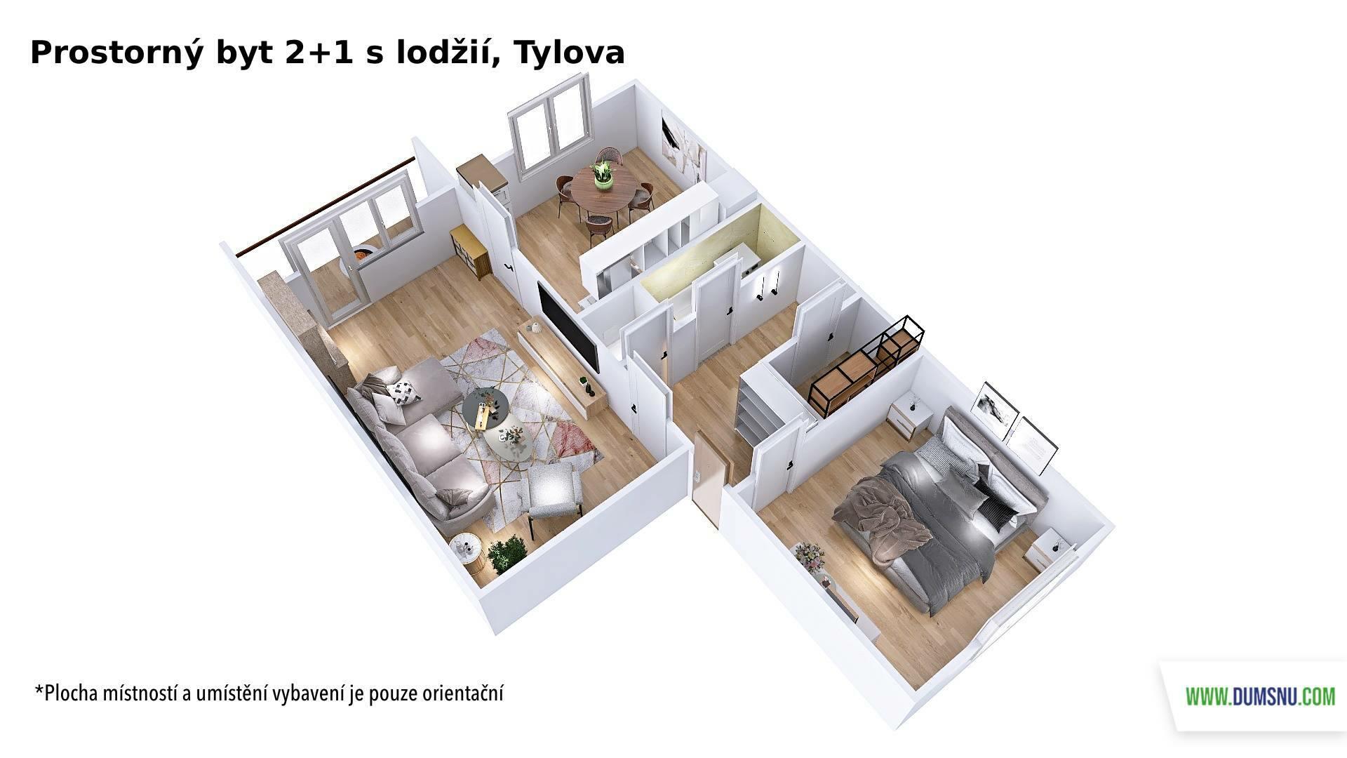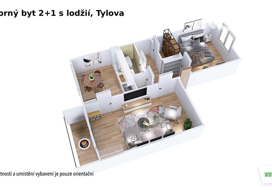 Dispozice bytu zahrnuje vstupní chodbu s praktickou komorou, ložnici, obývací pokoj se vstupem na lodžii, samostatnou kuchyni, menší koupelnu s vanou a oddělenou toaletu. Díky tomuto uspořádání nabízí byt dostatek úložného prostoru i komfortní bydlení.