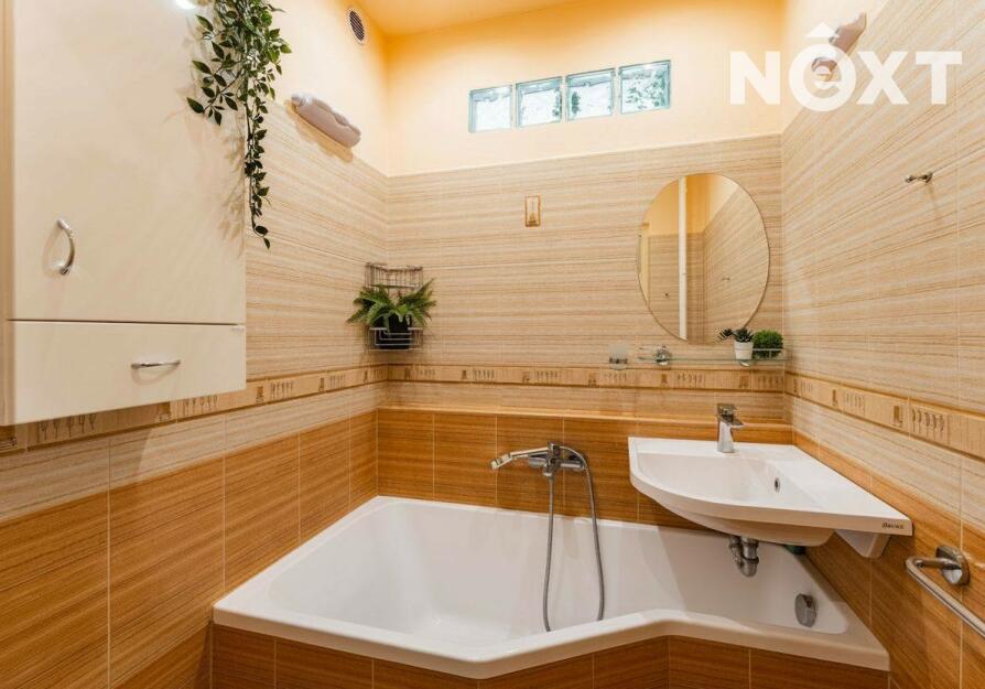 Kuchyň je vybavena velkou moderní kuchyňskou linkou a lednicí. V koupelně naleznete vanu a umyvadlo s připraveným místem pro pračku.