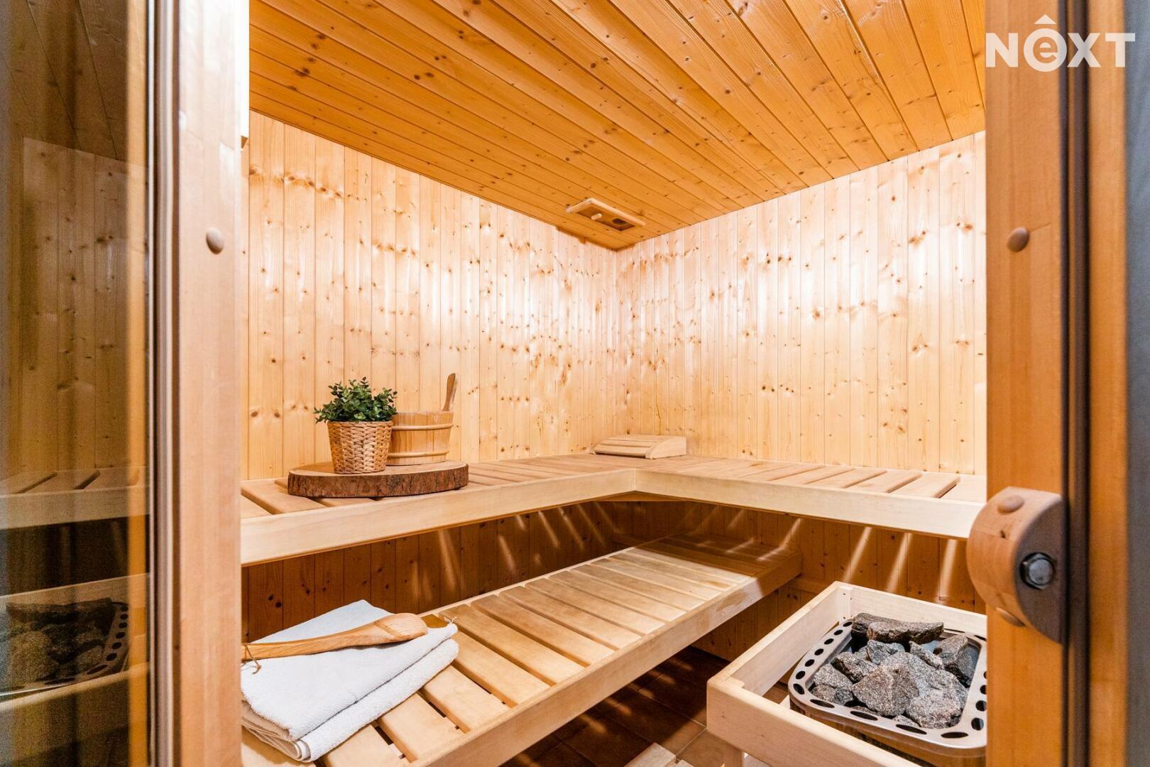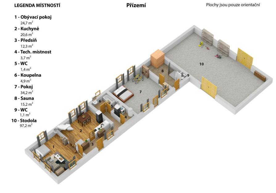- V přízemí obývák, kuchyně, pokoj / ložnice, 2x WC, koupelna a sauna