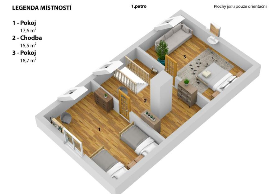 - V podkroví potom najdete dva prostorné pokoje
