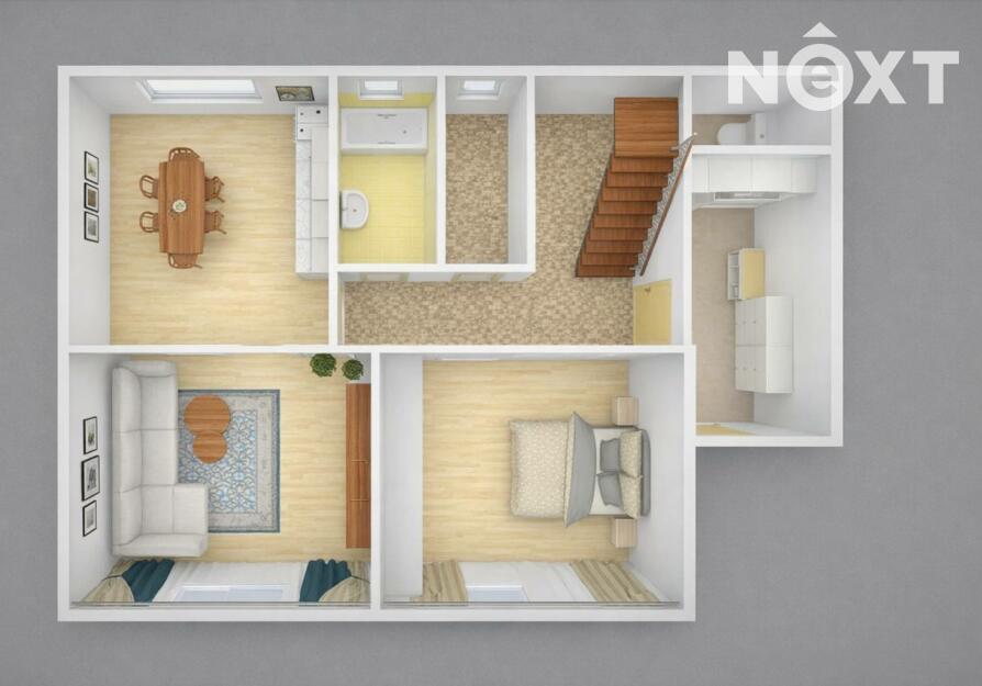 V prvním patře je otevřená terasa a další 2 pokoje. Půdní prostory otevírají možnosti kreativnímu smýšlení o využití.