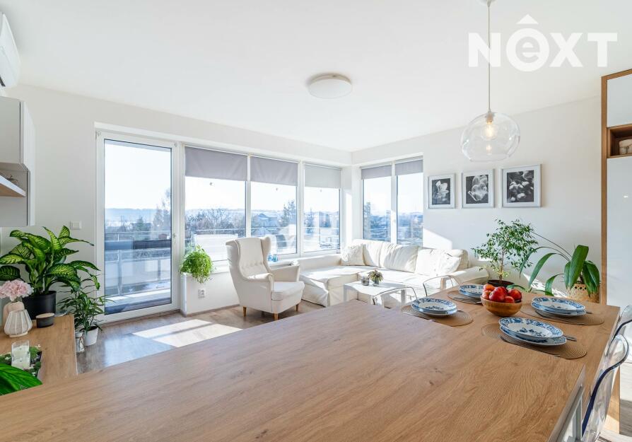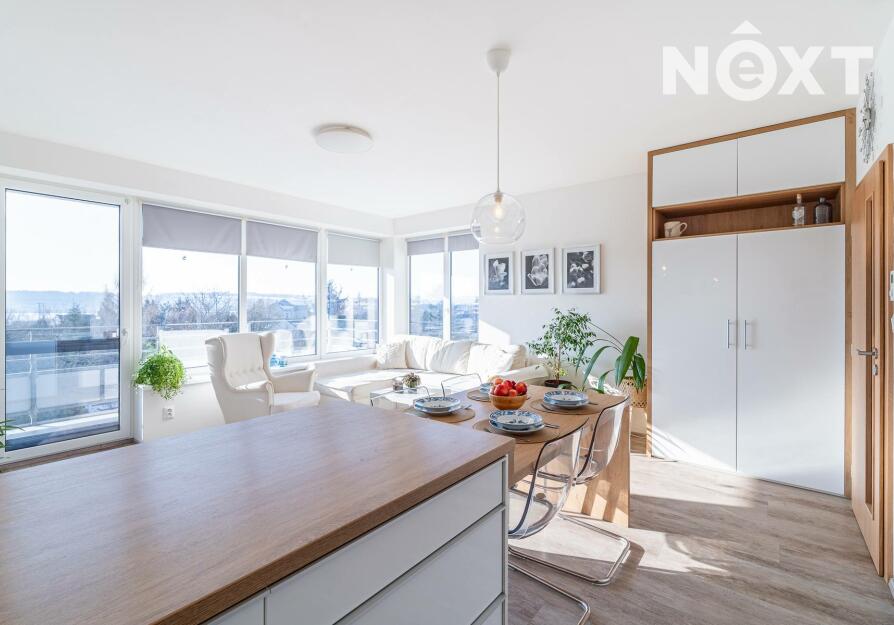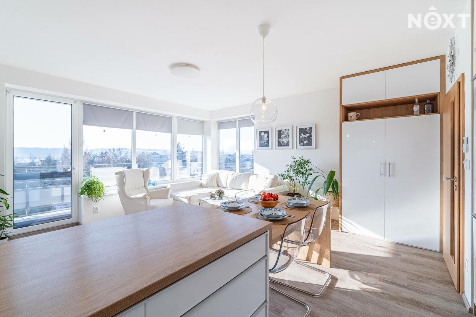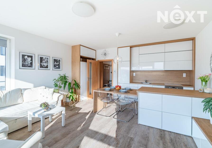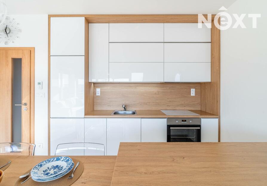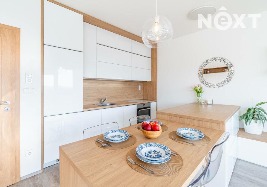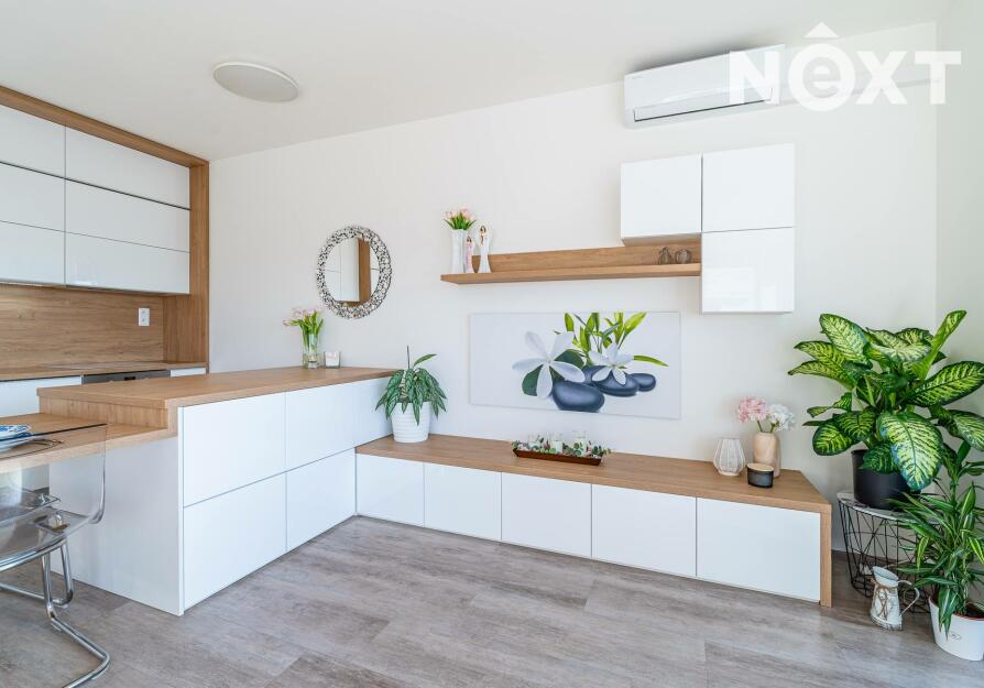 Interiér je řešen ve vysokém standardu s důrazem na pohodlí a funkčnost. Praktická kuchyňská linka s vestavěnými spotřebiči, nábytek na míru, podlahové vytápění s vinylovou podlahou a velká okna vytvářejí harmonický celek, ve kterém nic neruší a vše má své místo. Byt působí klidně, moderně a zároveň velmi útulně. O příjemnou teplotu v bytě se stará klimatizace.
