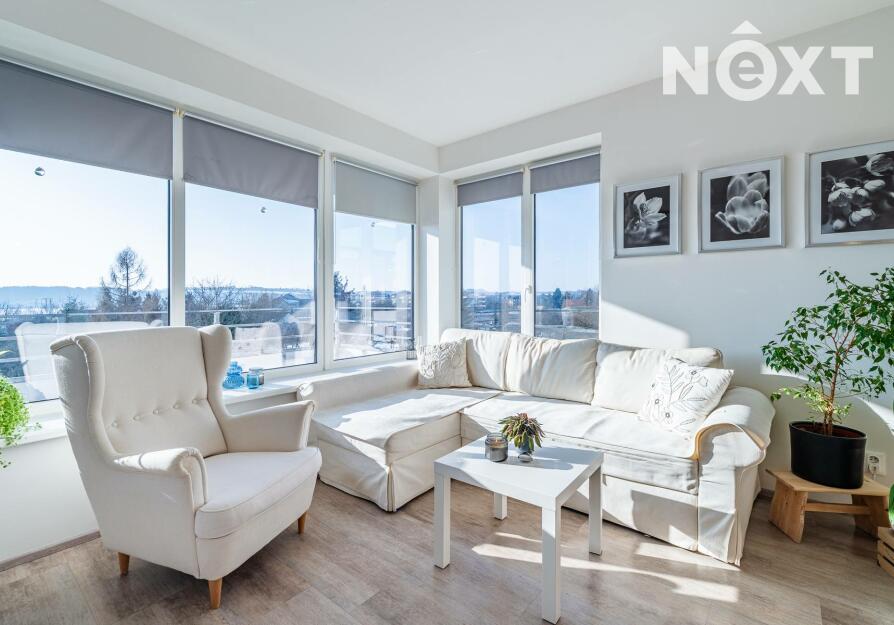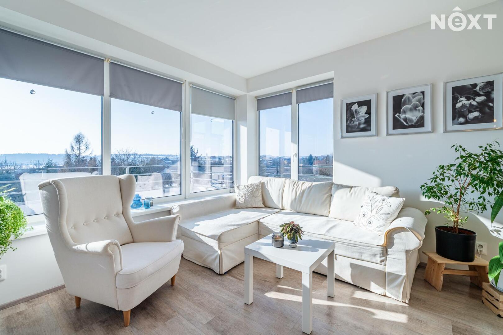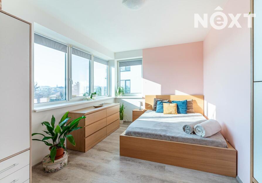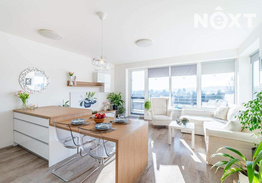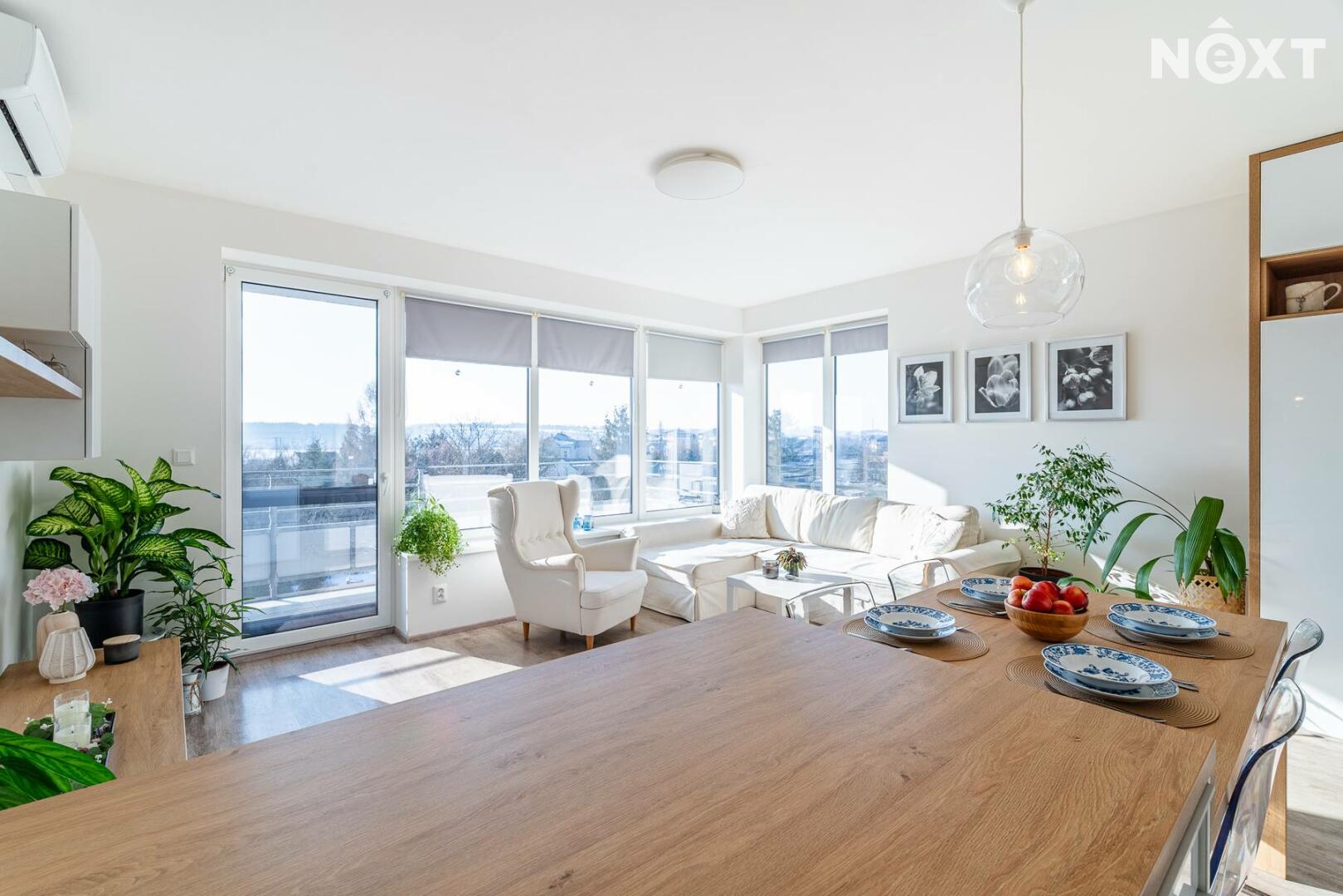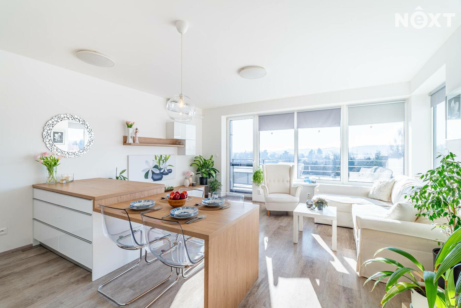 Interiér je řešen ve vysokém standardu s důrazem na pohodlí a funkčnost. Praktická kuchyňská linka s vestavěnými spotřebiči, nábytek na míru, podlahové vytápění s vinylovou podlahou a velká okna vytvářejí harmonický celek, ve kterém nic neruší a vše má své místo. Byt působí klidně, moderně a zároveň velmi útulně. O příjemnou teplotu v bytě se stará klimatizace.
