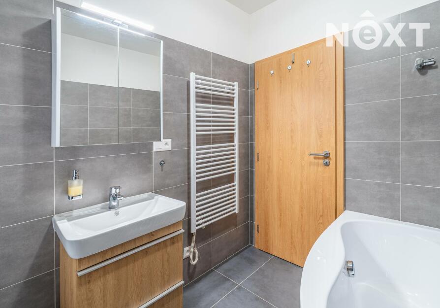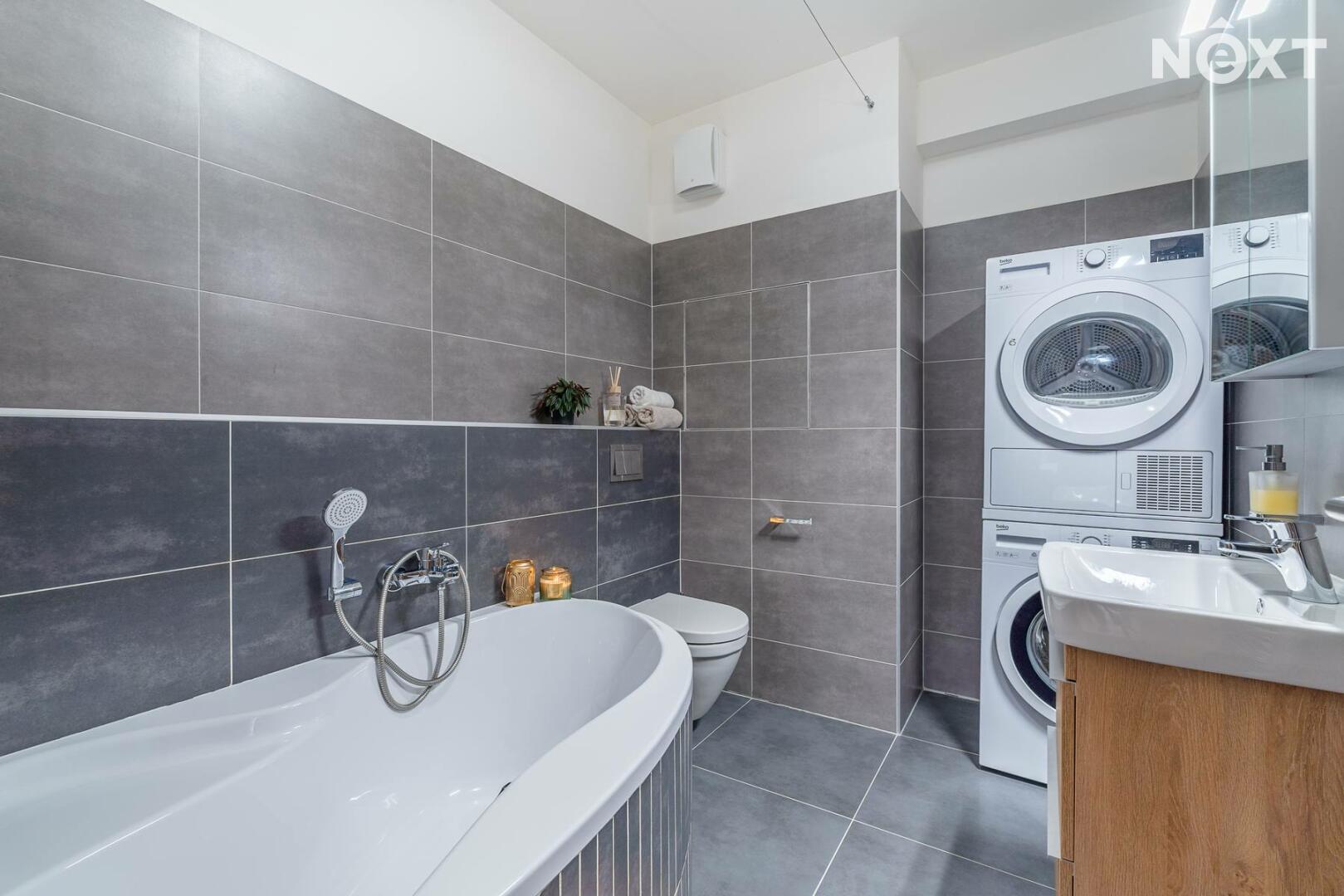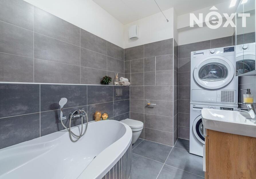 Prostorná koupelna je vybavena vanou, toaletou, umyvadlem se skříňkou a nabízí také místo pro pračku a sušičku. Ložnice s dostatkem denního světla, orientovaná do klidného okolí, je ideálním místem pro kvalitní spánek.