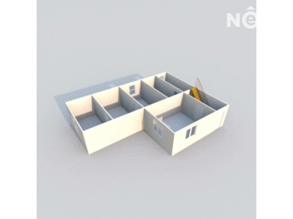 Dispozice umožňuje oddělení pracovních a zázemních částí, což je praktické jak pro drobné podnikání, tak pro soukromé využití.