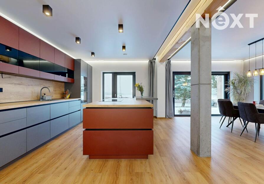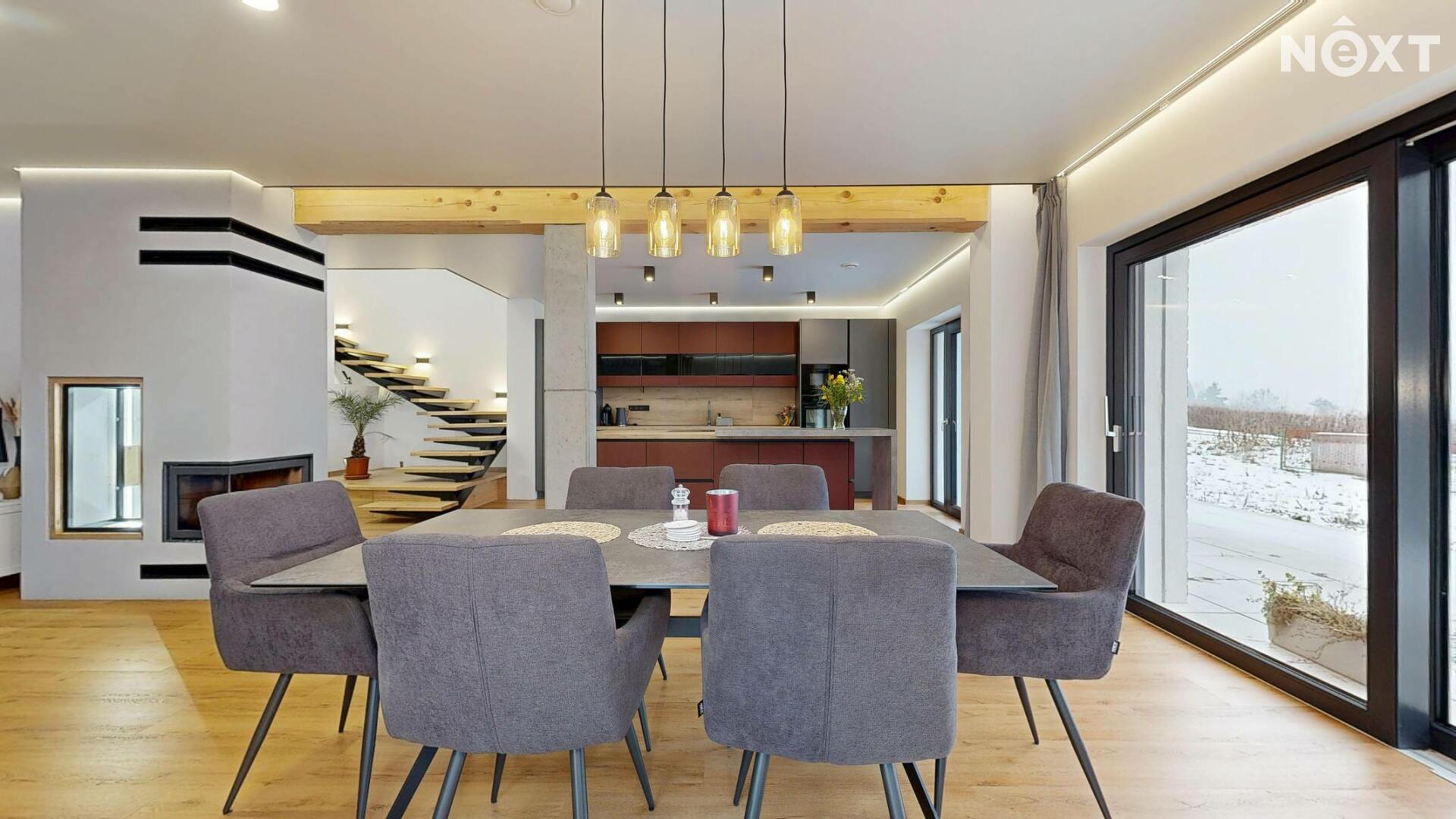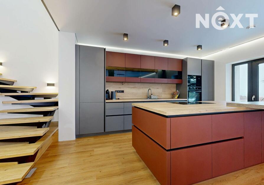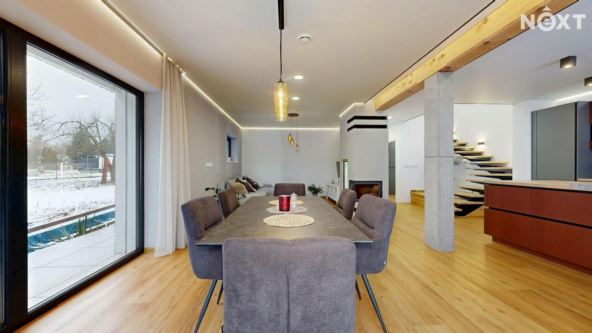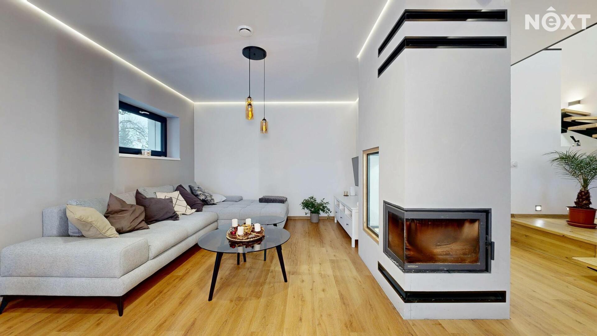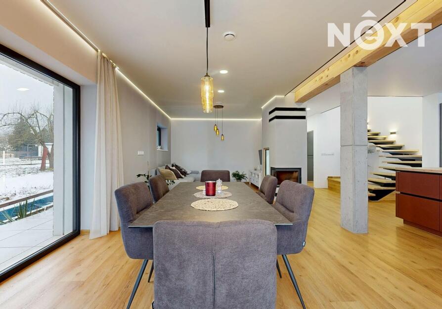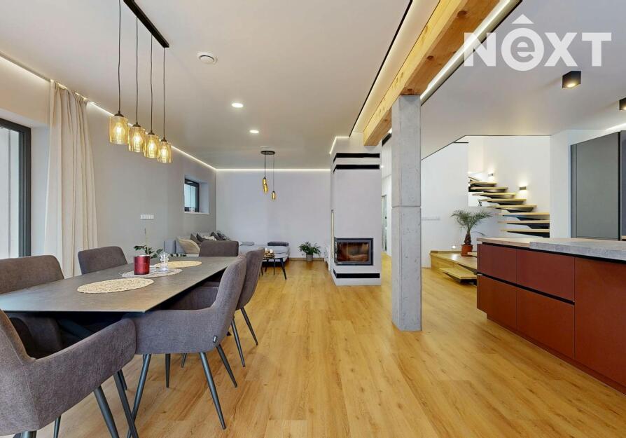 Interiér je vzdušný, vkusný a sladěný do moderního stylu, kde každý detail dává smysl. Dvě podlaží chytře rozdělují denní a noční zónu – v přízemí prostorný obývací pokoj s kuchyní a přímou návazností na budoucí terasu, v patře klid pro ložnice, dětské pokoje či pracovnu. Terasa čeká na dokončení, což je skvělá příležitost dotvořit ji přesně podle vašich představ. Praktickou stránku zajišťuje garáž přímo v domě, takže nákupy v dešti už nebudou drama, také dostatek úložných míst – od šatny po technické zázemí – které ocení každá rodina v domě o dispozici 5+kk. Technicky je dům radost popsat: pasivní standard, trojskla, centrální větrání s rekuperací a vytápění kotlem na pelety drží náklady na provoz na minimu a komfort na maximu. Energetický štítek PENB A dává jistotu, že teplo neuniká, čerstvý vzduch proudí a vy si užíváte zdravé vnitřní klima bez kompromisů. Místnosti jsou světlé, tiché a útulné – ideální na snídani s výhledem do zahrady i večerní odpočinek po práci.
