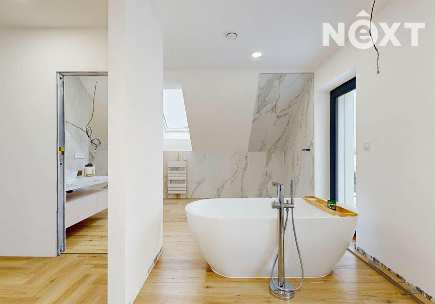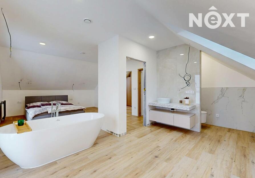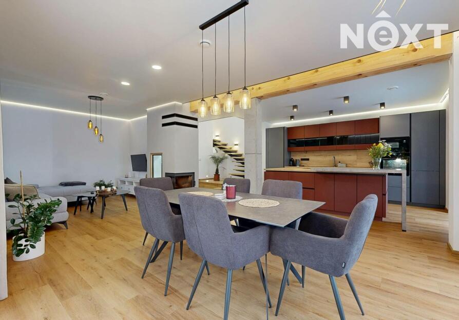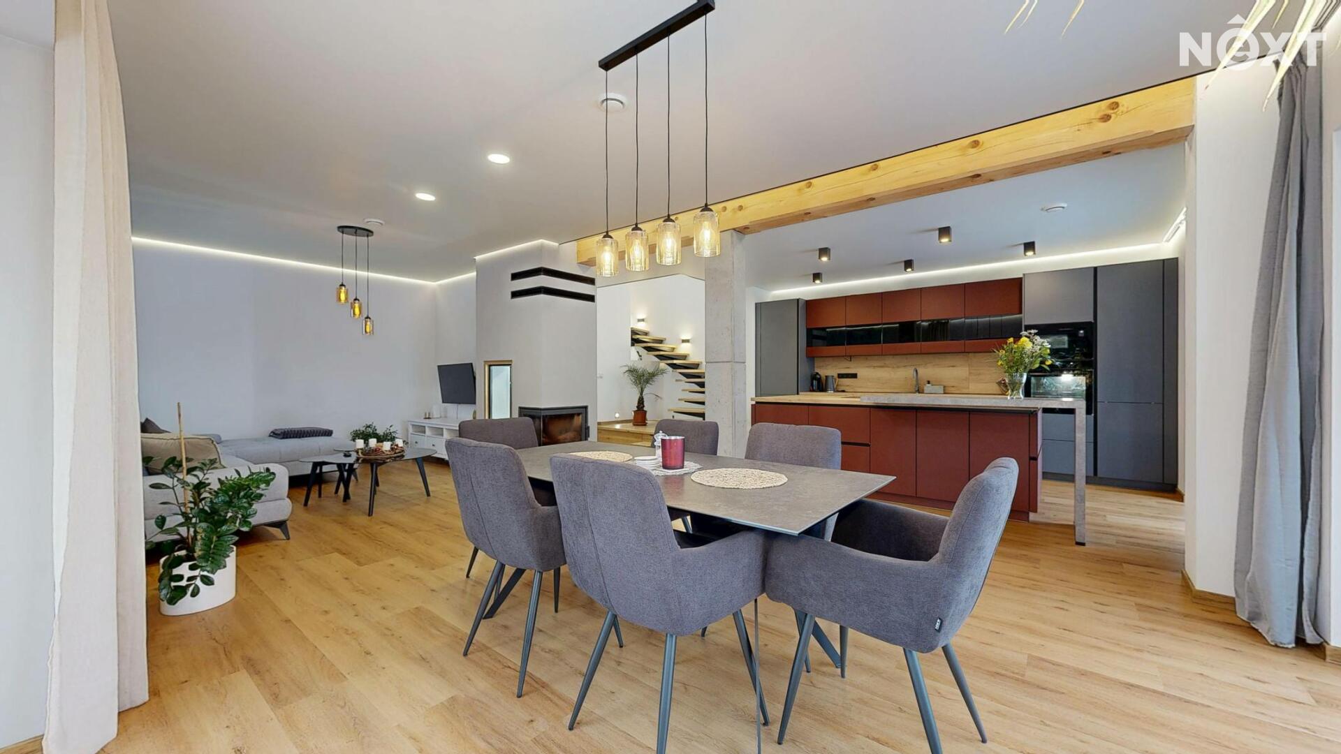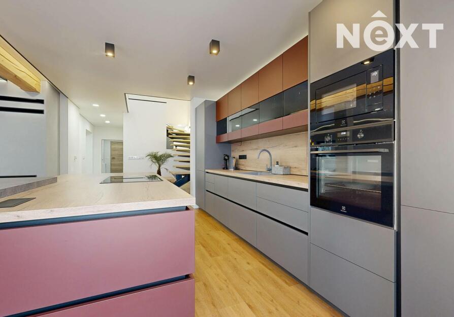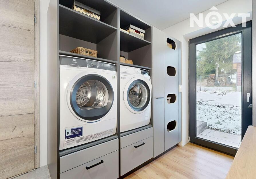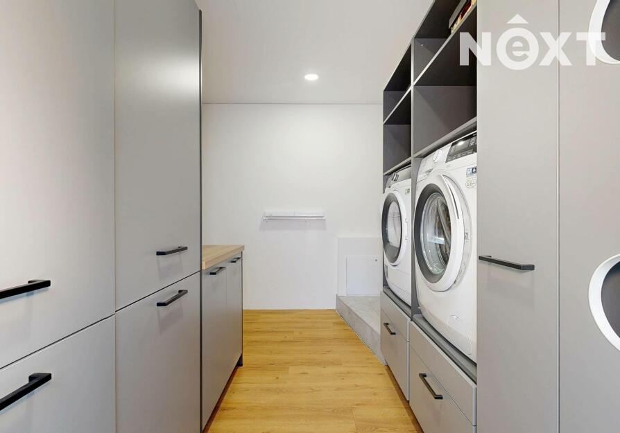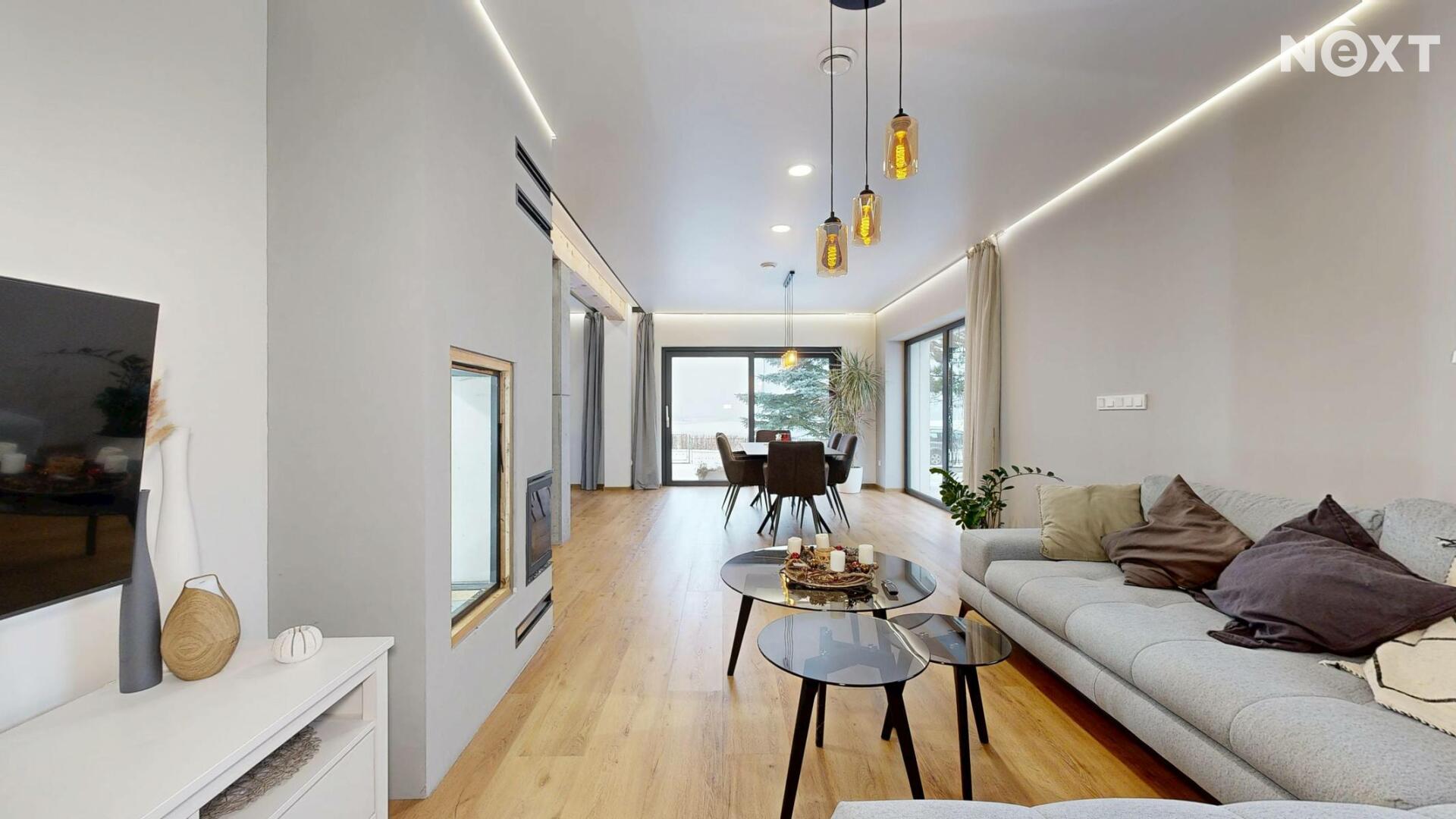 Interiér je vzdušný, vkusný a sladěný do moderního stylu, kde každý detail dává smysl. Dvě podlaží chytře rozdělují denní a noční zónu – v přízemí prostorný obývací pokoj s kuchyní a přímou návazností na budoucí terasu, v patře klid pro ložnice, dětské pokoje či pracovnu. Terasa čeká na dokončení, což je skvělá příležitost dotvořit ji přesně podle vašich představ. Praktickou stránku zajišťuje garáž přímo v domě, takže nákupy v dešti už nebudou drama, také dostatek úložných míst – od šatny po technické zázemí – které ocení každá rodina v domě o dispozici 5+kk. Technicky je dům radost popsat: pasivní standard, trojskla, centrální větrání s rekuperací a vytápění kotlem na pelety drží náklady na provoz na minimu a komfort na maximu. Energetický štítek PENB A dává jistotu, že teplo neuniká, čerstvý vzduch proudí a vy si užíváte zdravé vnitřní klima bez kompromisů. Místnosti jsou světlé, tiché a útulné – ideální na snídani s výhledem do zahrady i večerní odpočinek po práci.